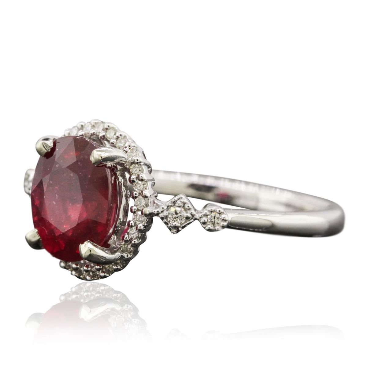 One electronically tested 14KT white gold ladies cast ruby and diamond ring. The featured ruby is set within a diamond bezel supported by diamond accented shoulders, completed by a two millimeter wide band. Bright polish finish with milgrain detailing. Trademark is PMI. Identified with markings of "14K". Condition is new, good workmanship. Containing: One prong set oval mixed cut natural ruby, measuring 8.10 x 6.25 x 4.65mm, 8%. bulge factor, approximate weight of 2.07ct., clarity is heavily included, type II, medium dark, very slightly brownish, red color, (GIA R 6/3), cut is good. Transmitting light somewhat diffusely, transparent to translucent. Naturally occurring internal & external characteristics are present. Indications of laboratory high temperature heat treatment, with glass & flux additives. Graded in the setting. Ruby has a low tolerance to rhodium plating, repolishing the surface, & ultrasonic cleaning. Thirty prong set round brilliant cut diamonds, measuring 1.30 - 1.10 x 0.72mm (depth est.) approximate total weight of 30 Stones = 0.29ct. Graded in the setting. Clarity: SI-1 to I-1. Color: H - J. Total Weight of Colored Stones 2.07ct. Total Weight of Diamonds 0.29ct. Total Weight of Ring 3.18 grams. AIG Appraised at $1,985.00.