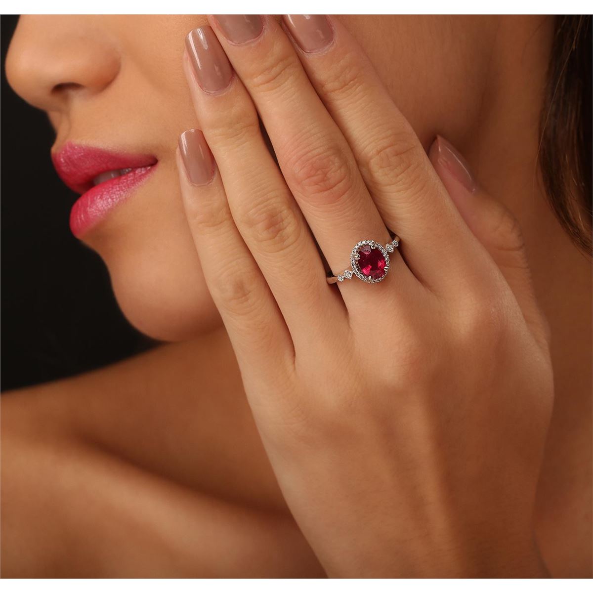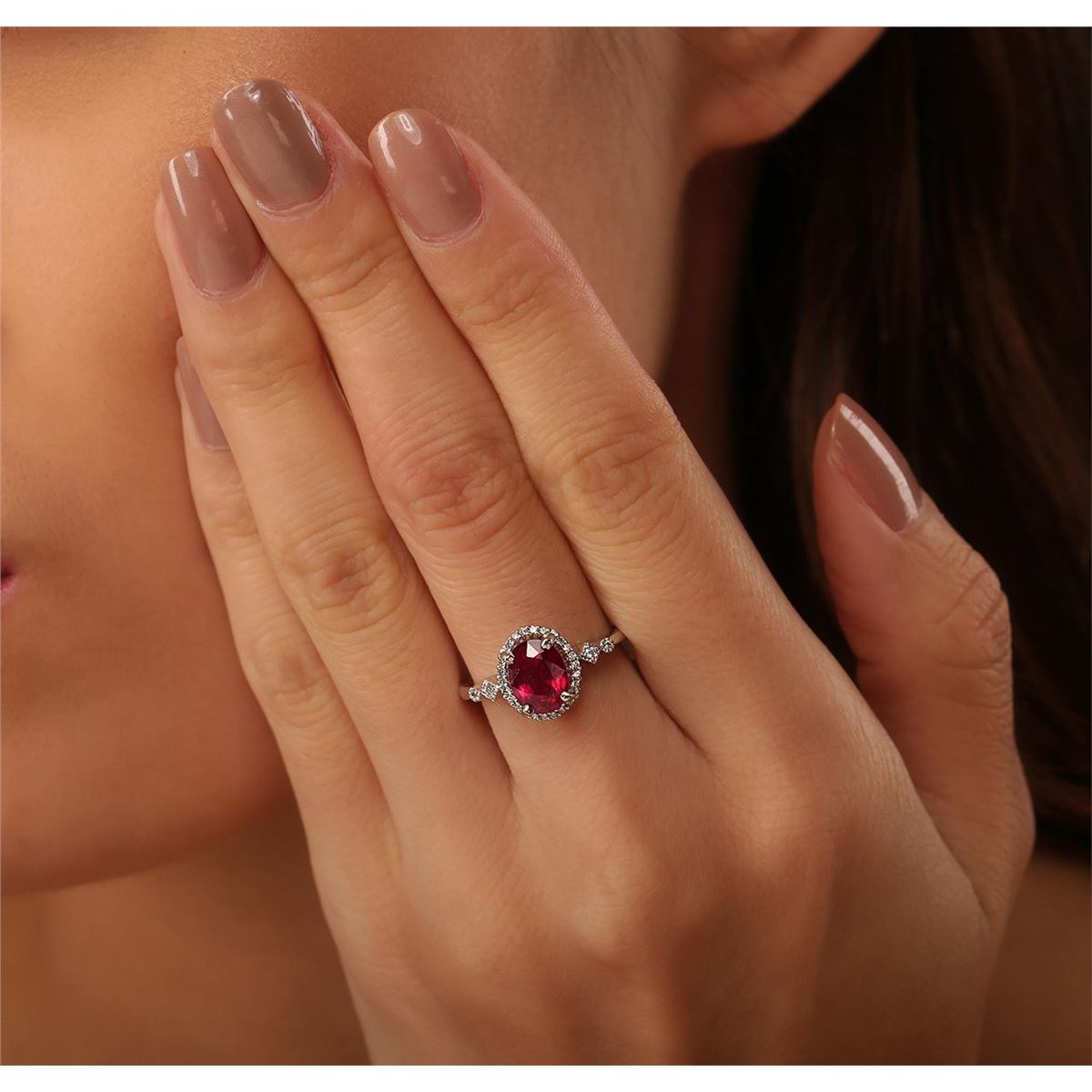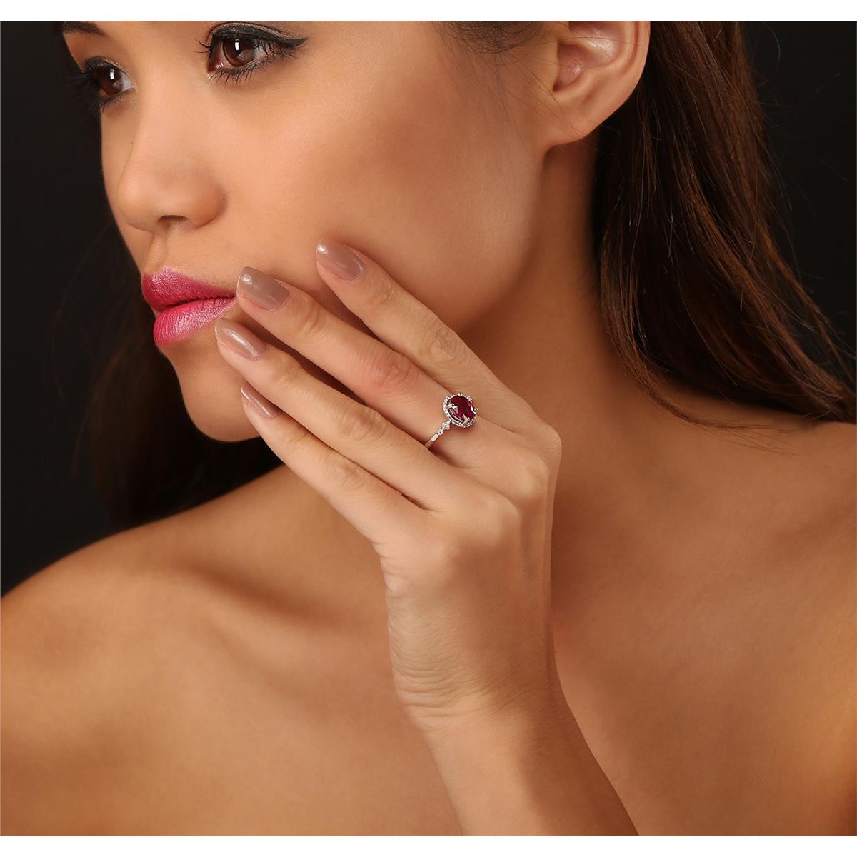 One electronically tested 14KT white gold ladies cast ruby and diamond ring. The featured ruby is set within a diamond bezel supported by diamond accented shoulders, completed by a two millimeter wide band. Bright polish finish with milgrain detailing. Trademark is PMI. Identified with markings of "14K". Condition is new, good workmanship. Containing: One prong set oval mixed cut natural ruby, measuring 8.10 x 6.25 x 4.65mm, 8%. bulge factor, approximate weight of 2.07ct., clarity is heavily included, type II, medium dark, very slightly brownish, red color, (GIA R 6/3), cut is good. Transmitting light somewhat diffusely, transparent to translucent. Naturally occurring internal & external characteristics are present. Indications of laboratory high temperature heat treatment, with glass & flux additives. Graded in the setting. Ruby has a low tolerance to rhodium plating, repolishing the surface, & ultrasonic cleaning. Thirty prong set round brilliant cut diamonds, measuring 1.30 - 1.10 x 0.72mm (depth est.) approximate total weight of 30 Stones = 0.29ct. Graded in the setting. Clarity: SI-1 to I-1. Color: H - J. Total Weight of Colored Stones 2.07ct. Total Weight of Diamonds 0.29ct. Total Weight of Ring 3.18 grams. AIG Appraised at $1,985.00.