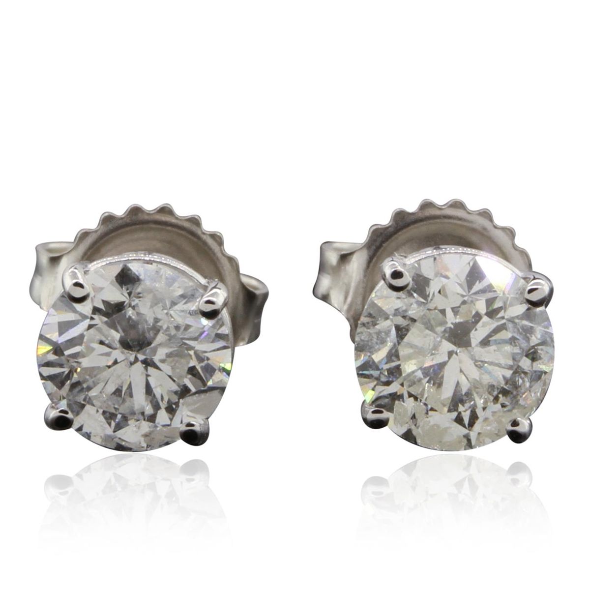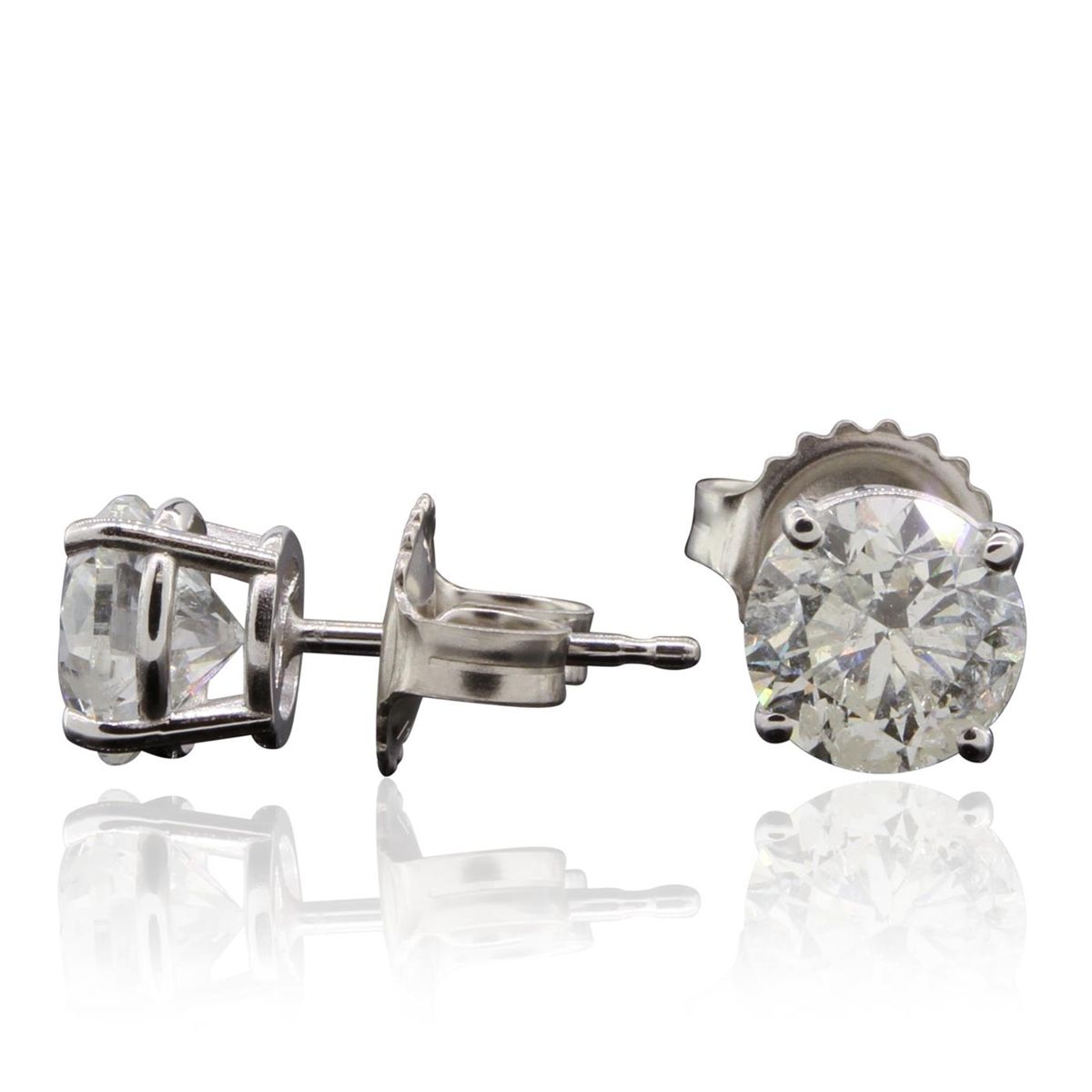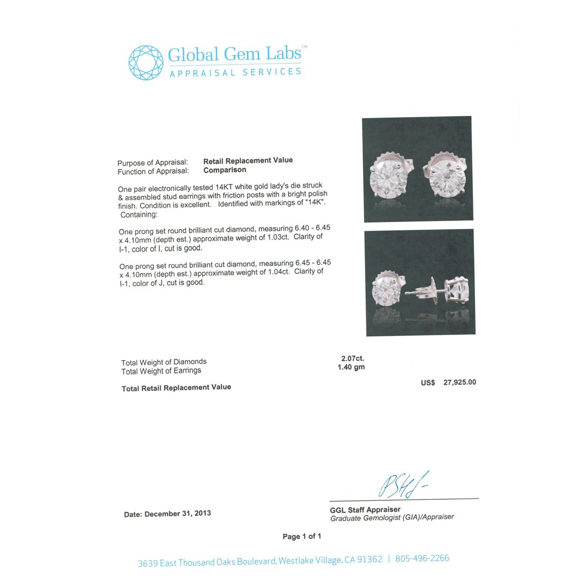 One pair electronically tested 14KT white gold Ladies die struck & assembled stud earrings with friction posts with a bright polish finish. Identified with markings of "14K". Condition is excellent. containing: One prong set round brilliant cut diamond, measuring 6.40 - 6.45 x 4.10mm (depth est.) approximate weight of 1.03ct. Clarity of I-1, Color of I, Cut is Good. One prong set round brilliant cut diamond, measuring 6.45 - 6.45 x 4.10mm (depth est.) approximate weight of 1.04ct. Clarity of I-1, Color of J, Cut is Good. Total Weight of Diamonds 2.07ct. Total Weight of Earrings 1.40gm. GGL Appraised at $27,925.00.