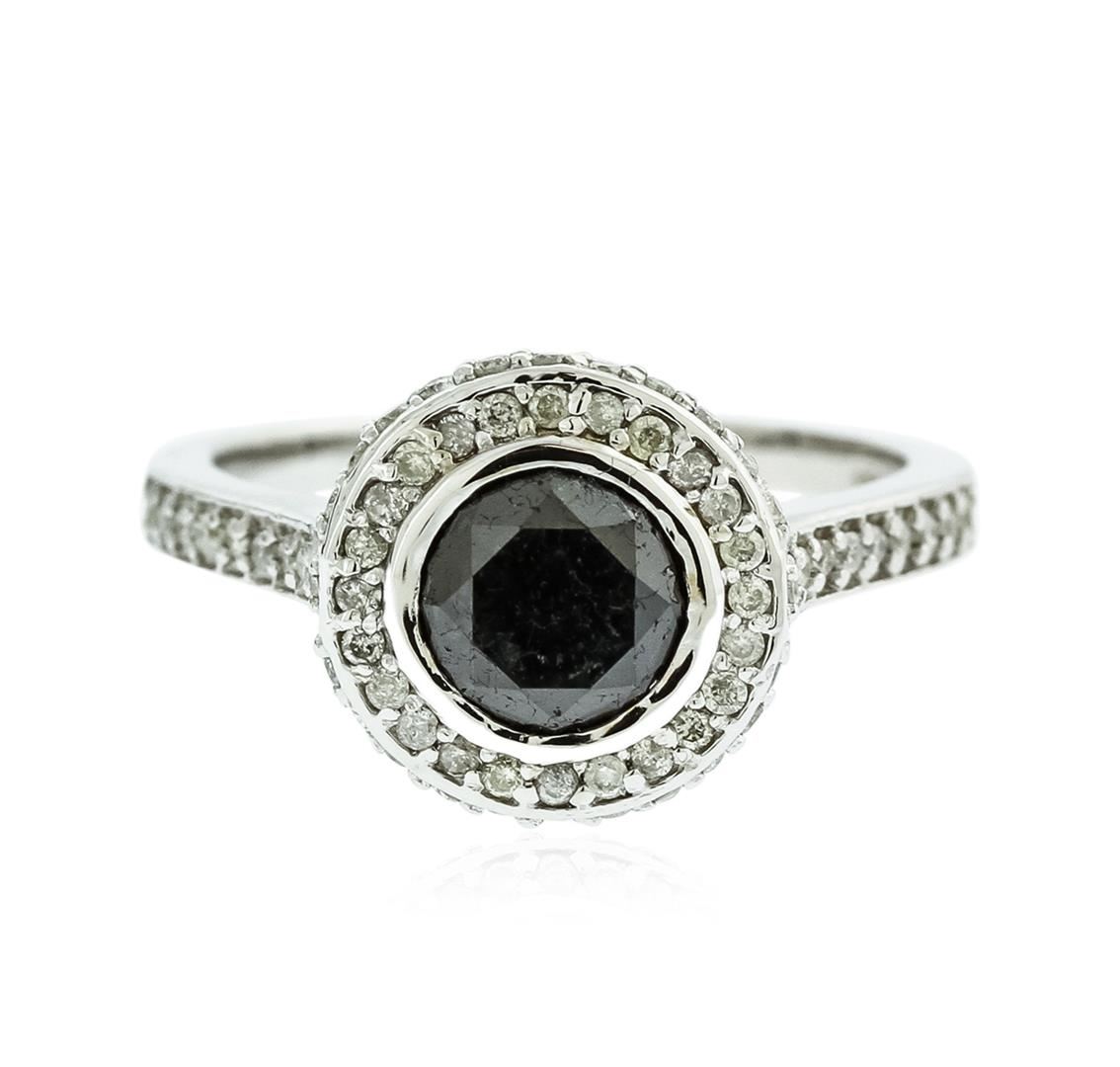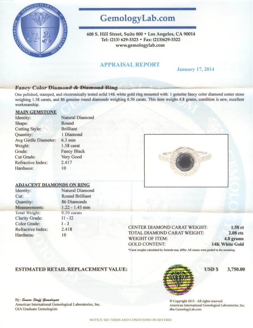 One polished, stamped, and electronically tested solid 14K white gold ring mounted with: 1 genuine fancy color diamond center stone weighing 1.58 carats, and 86 genuine round diamonds weighing 0.50 carats. This item weighs 4.8 grams, condition is new, excellent workmanship. AIGL Appraised at $3,750.00.