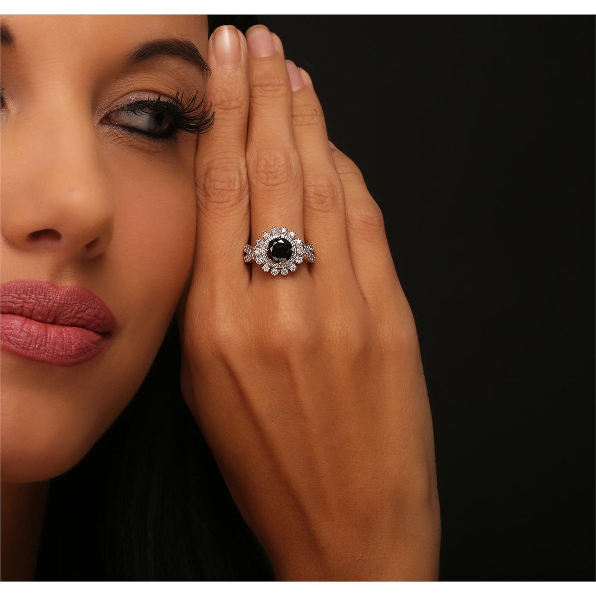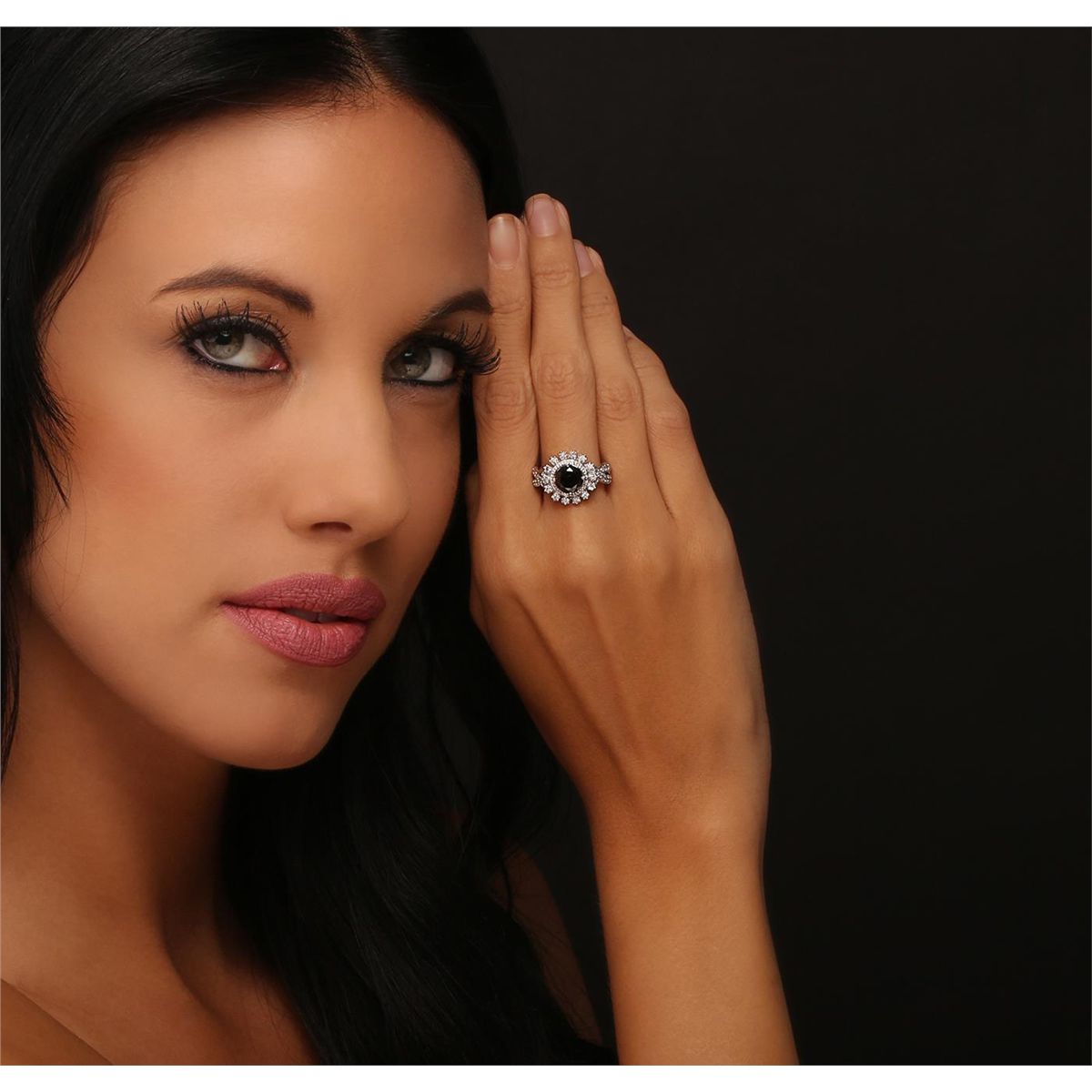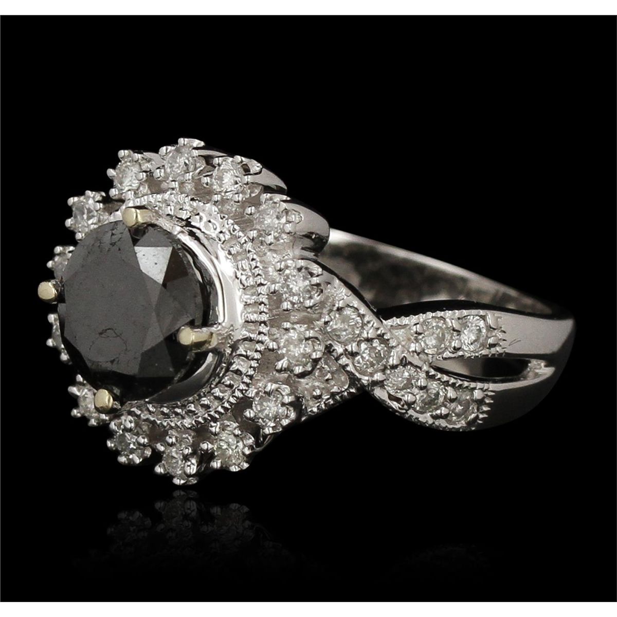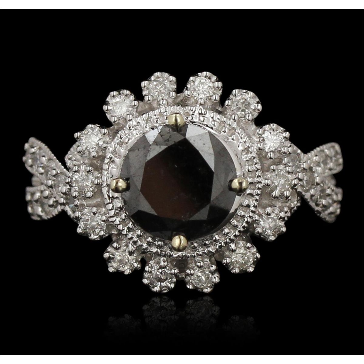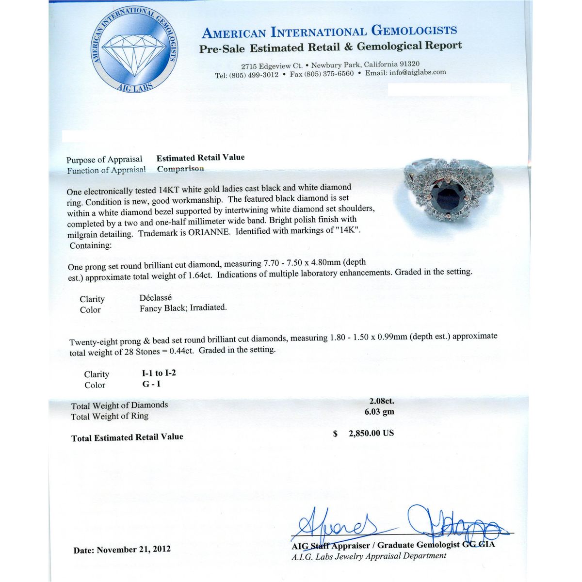 One electronically tested 14KT white gold ladies cast black and white diamond ring. Trademark is ORIANNE. Identified with markings of "14K". Condition is new, good workmanship. Containing: One prong set round brilliant cut diamond, measuring 7.70 - 7.50 x 4.80mm (depth est.) approximate. Total Weight of 1.64ct. Indications of multiple laboratory enhancements. Graded in the setting. Clarity D‚class‚. Color: Fancy Black; Irradiated. Twenty-Eight prong & bead set round brilliant cut diamonds, measuring 1.80 - 1.50 x 0.99mm (depth est.) approximate. Total Weight of 28 Stones = 0.44ct. Graded in the setting. Clarity: I-1 to I-2. Color: G - I. Total Weight of Diamonds 2.08ct. AIG Appraised at $2,850.00.