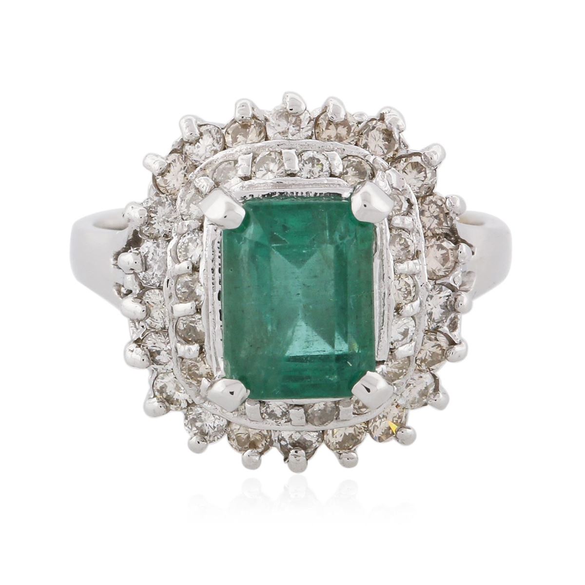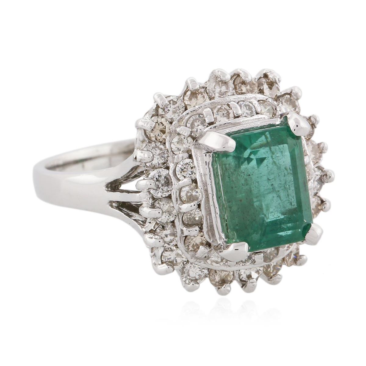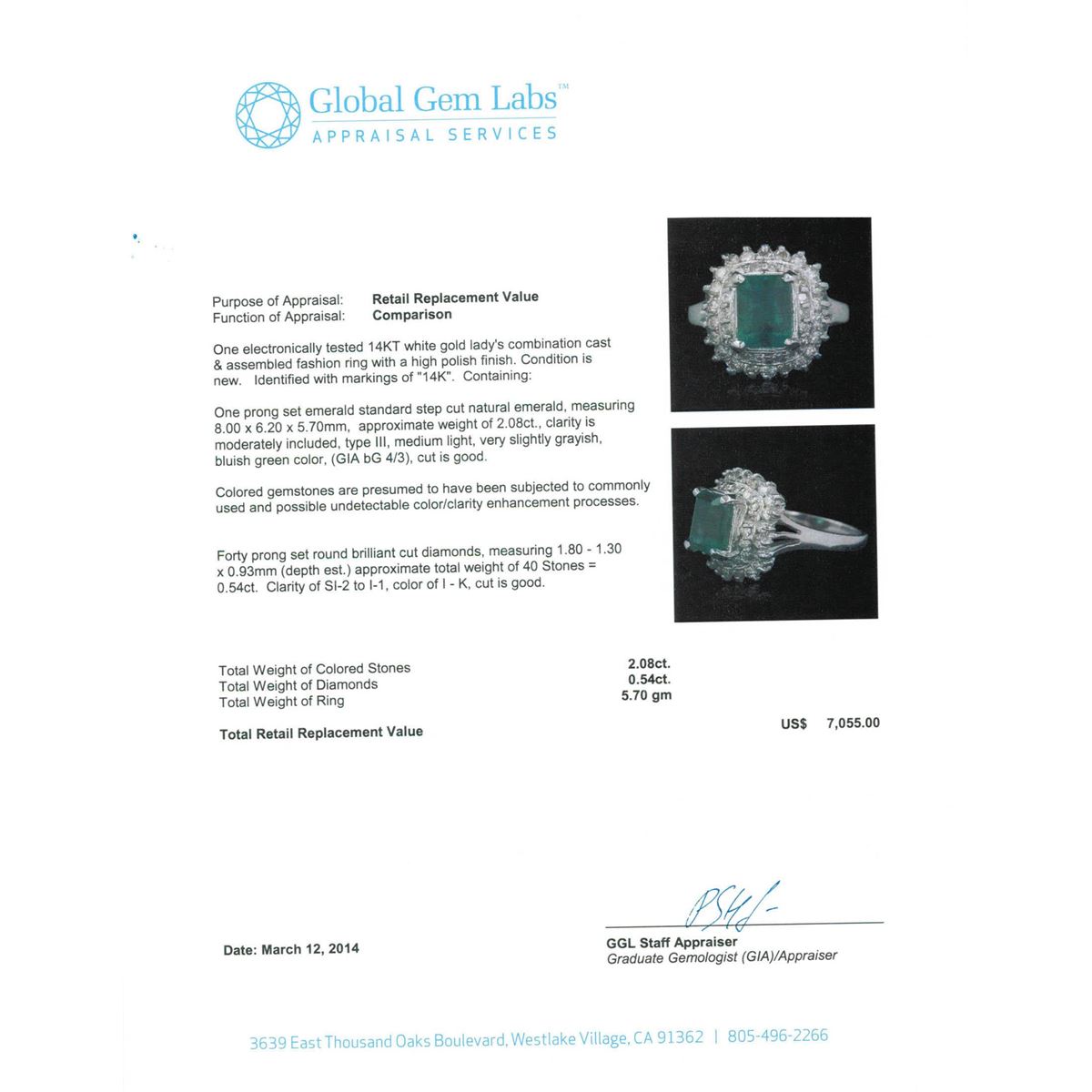 One electronically tested 14KT white gold Ladies combination cast & assembled fashion ring with a high polish finish. Condition is new. Identified with markings of "14K". Containing: One prong set emerald standard step cut natural emerald, measuring 8.00 x 6.20 x 5.70mm, approximate weight of 2.08ct., clarity is moderately included, type III, medium light, very slightly grayish, bluish green color, (GIA bG 4/3), cut is good. Colored gemstones are presumed to have been subjected to commonly used and possible undetectable color/clarity enhancement processes. Forty prong set round brilliant cut diamonds, measuring 1.80 - 1.30 x 0.93mm (depth est.) approximate total weight of 40 Stones = 0.54ct. Clarity of SI-2 to I-1, Color of I - K, Cut is Good. Total Weight of Colored Stones 2.08ct. Total Weight of Diamonds 0.54ct. Total Weight of Ring 5.70 grams. GGL Appraised at $7,055.00.