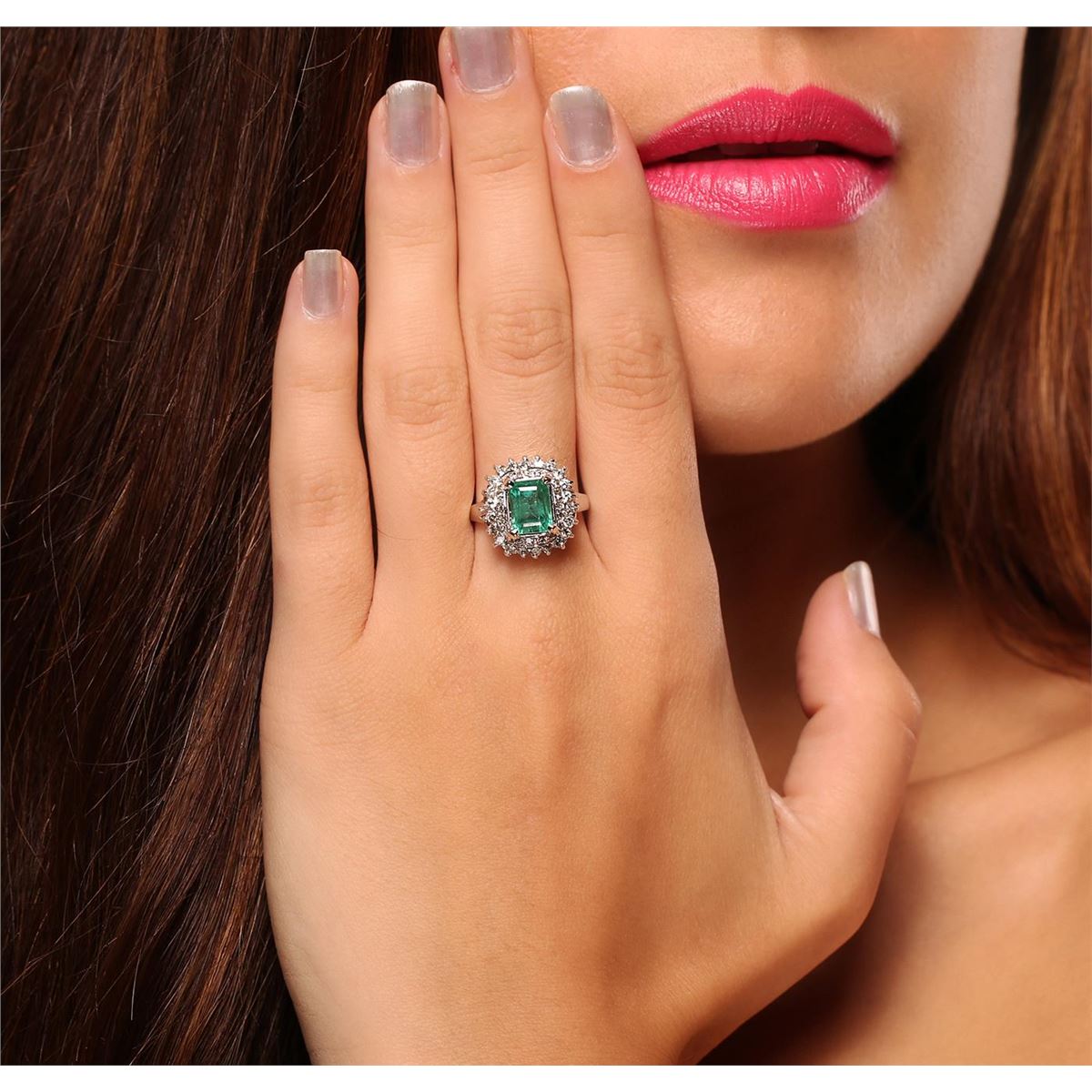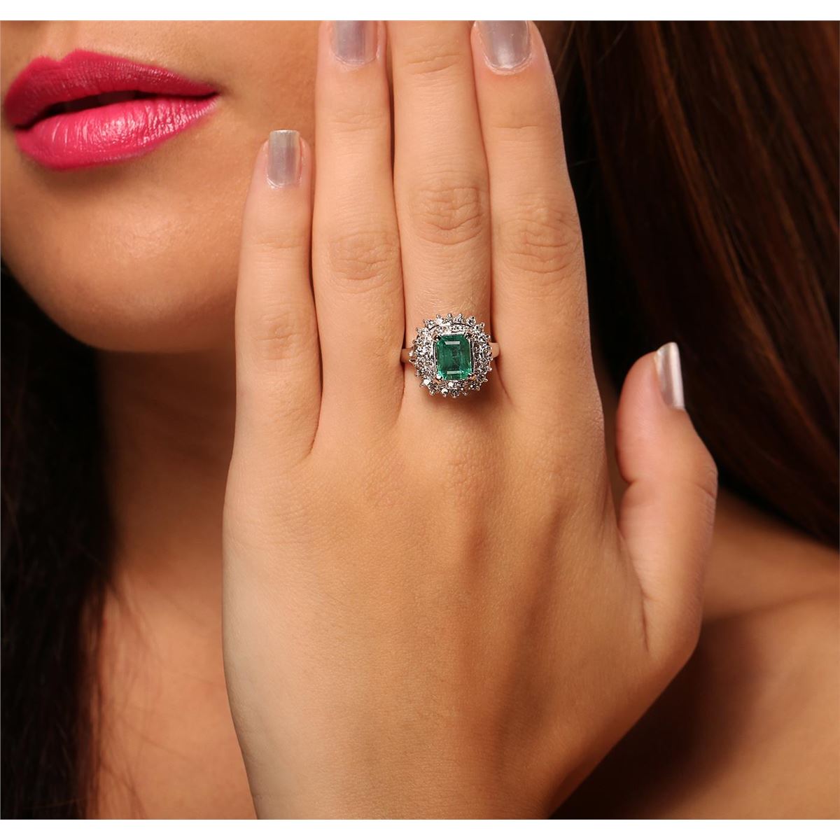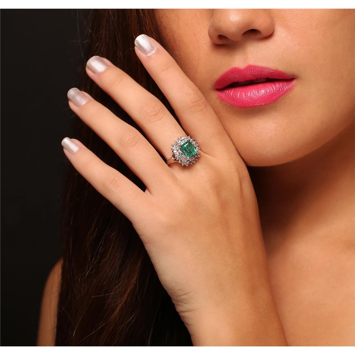 One electronically tested 14KT white gold Ladies combination cast & assembled fashion ring with a high polish finish. Condition is new. Identified with markings of "14K". Containing: One prong set emerald standard step cut natural emerald, measuring 8.00 x 6.20 x 5.70mm, approximate weight of 2.08ct., clarity is moderately included, type III, medium light, very slightly grayish, bluish green color, (GIA bG 4/3), cut is good. Colored gemstones are presumed to have been subjected to commonly used and possible undetectable color/clarity enhancement processes. Forty prong set round brilliant cut diamonds, measuring 1.80 - 1.30 x 0.93mm (depth est.) approximate total weight of 40 Stones = 0.54ct. Clarity of SI-2 to I-1, Color of I - K, Cut is Good. Total Weight of Colored Stones 2.08ct. Total Weight of Diamonds 0.54ct. Total Weight of Ring 5.70 grams. GGL Appraised at $7,055.00.