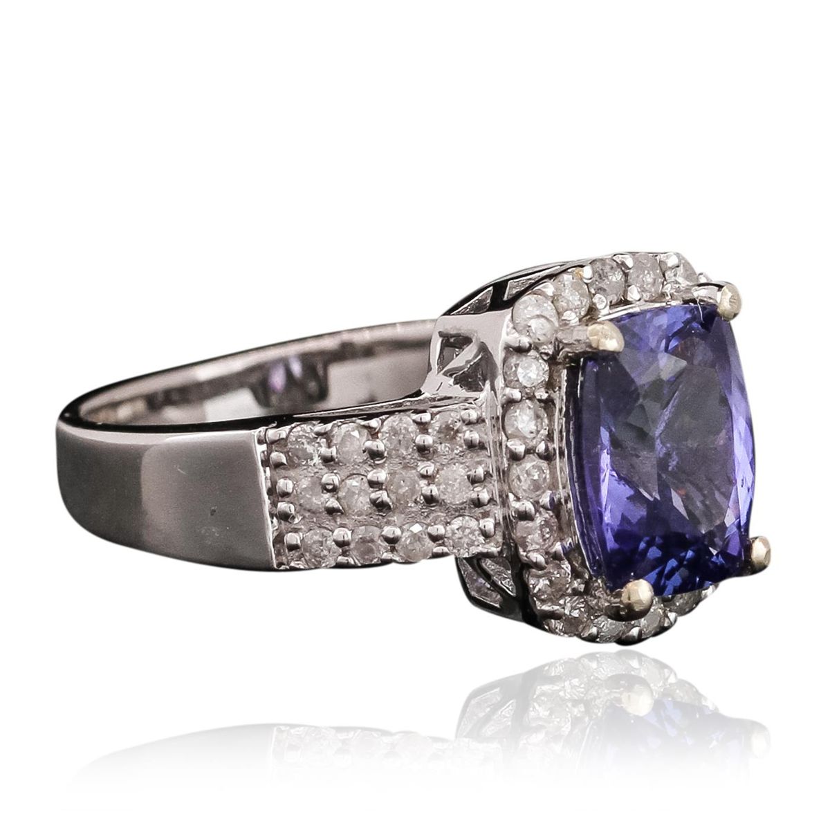 One electronically tested 14KT white gold ladies combination cast & assembled tanzanite and diamond ring with a flat shank with a bright polish finish. Identified with markings of "14K". Condition is new. Containing: One prong set rectangular cushion modified brilliant cut natural tanzanite, measuring 9.00 x 6.85 x 4.28mm, approximate weight of 2.08ct., clarity is eye clean, type I, medium light, moderately strong, violet color, (GIA V 4/4), cut is good. Twenty-Three prong set round brilliant cut diamonds, measuring 1.50 - 1.50 x 0.90mm (depth est.) approximate total weight of 23 Stones = 0.28ct. Clarity: I-1 to I-3. Color: I - J, Cut is Good. Colored gemstones are presumed to have been subjected to commonly used enhancement processes. All diamonds and colored gemstones are graded in the mounting, unless otherwise stated. Total Weight of Colored Stones 2.08ct. Total Weight of Diamonds 0.28ct. Total Weight of Ring 5.20 grams. GGL Appraised at $5,400.00.