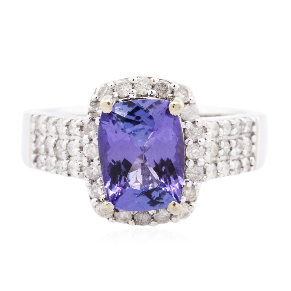 One electronically tested 14KT white gold ladies combination cast & assembled tanzanite and diamond ring with a flat shank with a bright polish finish. Identified with markings of "14K". Condition is new. Containing: One prong set rectangular cushion modified brilliant cut natural tanzanite, measuring 9.00 x 6.85 x 4.28mm, approximate weight of 2.08ct., clarity is eye clean, type I, medium light, moderately strong, violet color, (GIA V 4/4), cut is good. Twenty-Three prong set round brilliant cut diamonds, measuring 1.50 - 1.50 x 0.90mm (depth est.) approximate total weight of 23 Stones = 0.28ct. Clarity: I-1 to I-3. Color: I - J, Cut is Good. Colored gemstones are presumed to have been subjected to commonly used enhancement processes. All diamonds and colored gemstones are graded in the mounting, unless otherwise stated. Total Weight of Colored Stones 2.08ct. Total Weight of Diamonds 0.28ct. Total Weight of Ring 5.20 grams. GGL Appraised at $5,400.00.