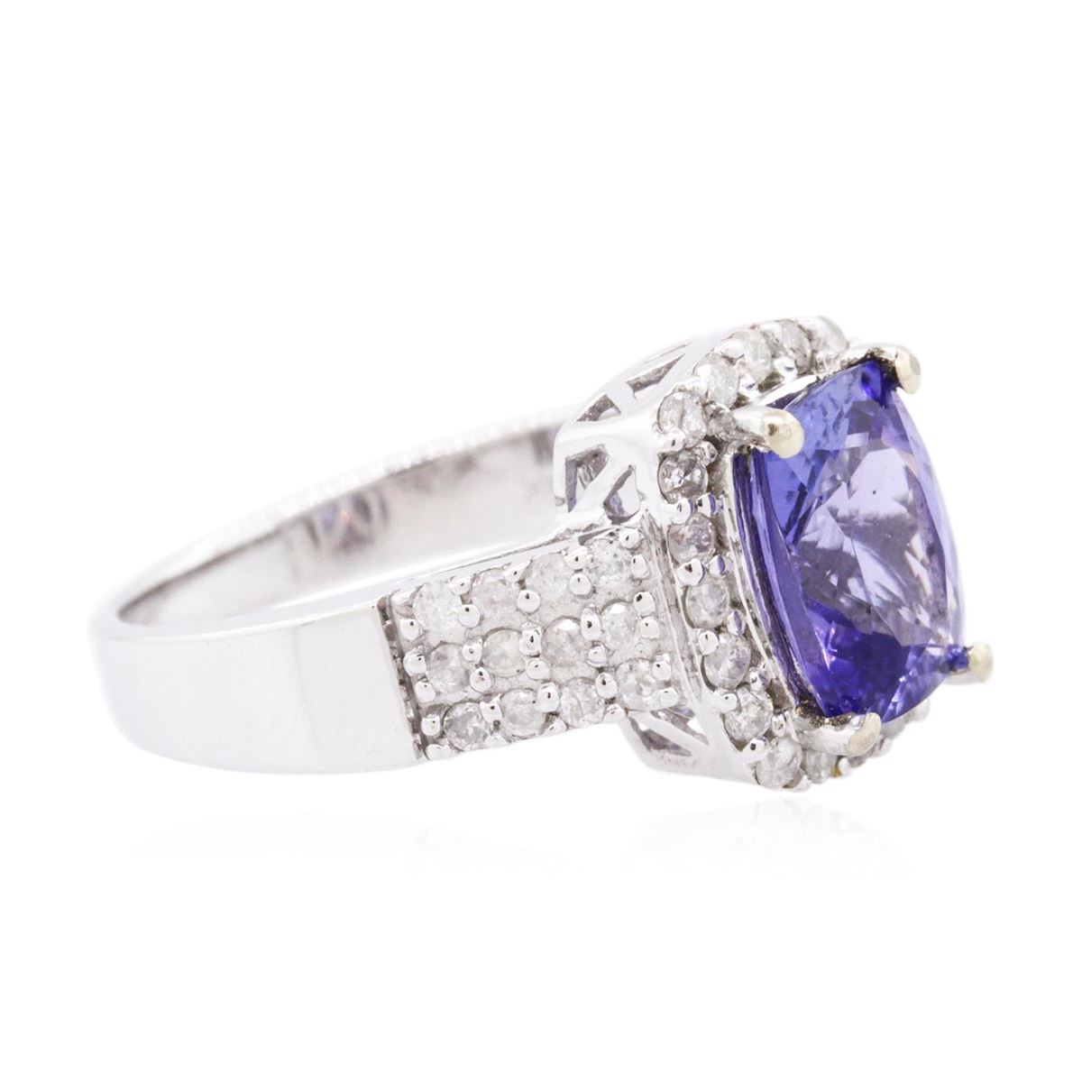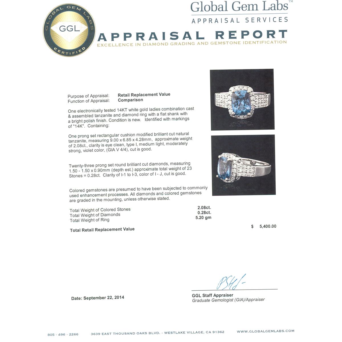 One electronically tested 14KT white gold ladies combination cast & assembled tanzanite and diamond ring with a flat shank with a bright polish finish. Identified with markings of "14K". Condition is new. Containing: One prong set rectangular cushion modified brilliant cut natural tanzanite, measuring 9.00 x 6.85 x 4.28mm, approximate weight of 2.08ct., clarity is eye clean, type I, medium light, moderately strong, violet color, (GIA V 4/4), cut is good. Twenty-Three prong set round brilliant cut diamonds, measuring 1.50 - 1.50 x 0.90mm (depth est.) approximate total weight of 23 Stones = 0.28ct. Clarity: I-1 to I-3. Color: I - J, Cut is Good. Colored gemstones are presumed to have been subjected to commonly used enhancement processes. All diamonds and colored gemstones are graded in the mounting, unless otherwise stated. Total Weight of Colored Stones 2.08ct. Total Weight of Diamonds 0.28ct. Total Weight of Ring 5.20 grams. GGL Appraised at $5,400.00.