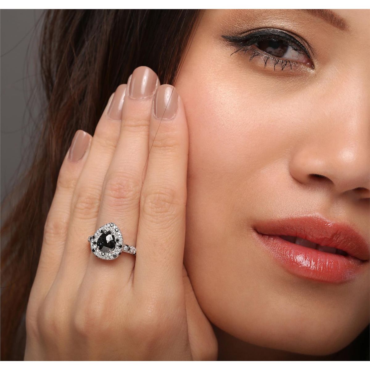 One 14KT white gold ring containing one natural pear rose cut fancy black diamond, enhanced for color, with a total weight of 1.35ct. The ring also contains black side stones: fancy black (color enhanced), and white side stone: G-H / SI3-I2 weighing 0.19ct and 0.54ct respectively. Total weight of the ring is 4.60 grams. EGL Appraised at $3,430.00.
