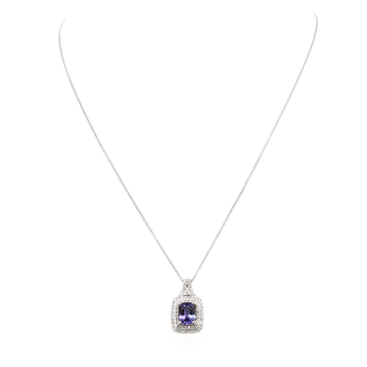 One electronically tested 14KT white gold ladies combination cast & assembled pendant & chain 18.0" long, medium cable link with a lobster claw clasp with a bright polish finish. Identified with markings of "14K". Condition is new. Containing: One prong set rectangular cushion modified brilliant cut natural tanzanite, measuring 8.86 x 6.80 x 4.42mm, approximate weight of 2.10ct., clarity is eye clean, type I, medium light, very slightly grayish, violet color, (GIA V 4/3), cut is good. Seventy-One prong set round brilliant cut diamonds, measuring 1.10 - 1.10 x 0.66mm (depth est.) approximate total weight of 71 Stones = 0.34ct. . Clarity: I-1 to I-2. Color: I - J, Cut is Good. Colored gemstones are presumed to have been subjected to commonly used enhancement processes. All diamonds and colored gemstones are graded in the mounting, unless otherwise stated.. Total Weight of Colored Stones 2.10ct.. Total Weight of Diamonds 0.34ct.. Total Weight of Pendant & Chain 6.60 grams. GGL Appraised at $6,175.00.