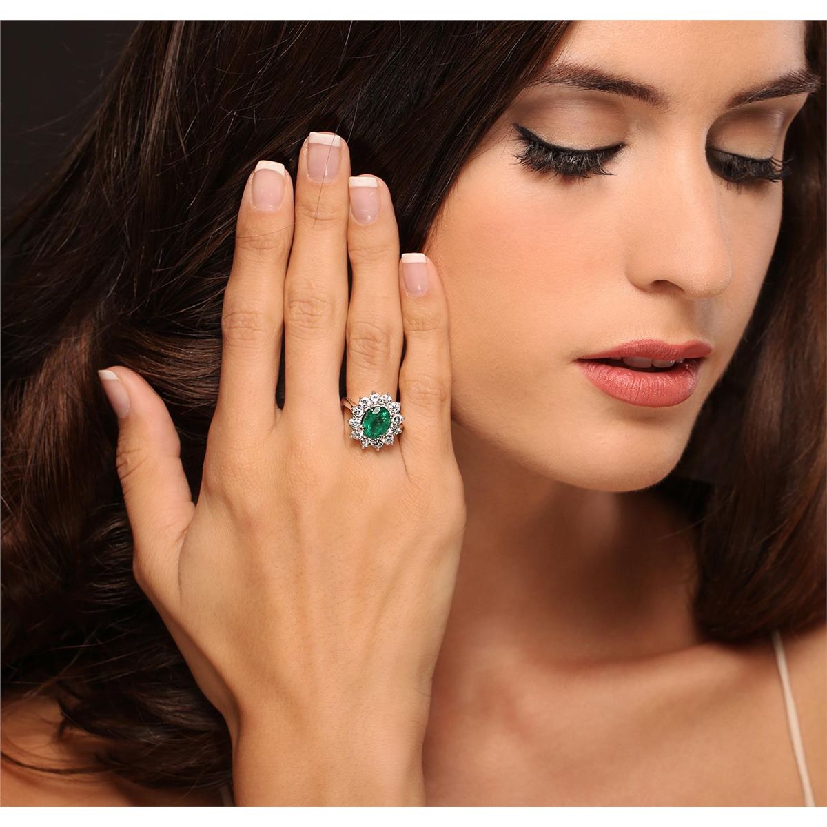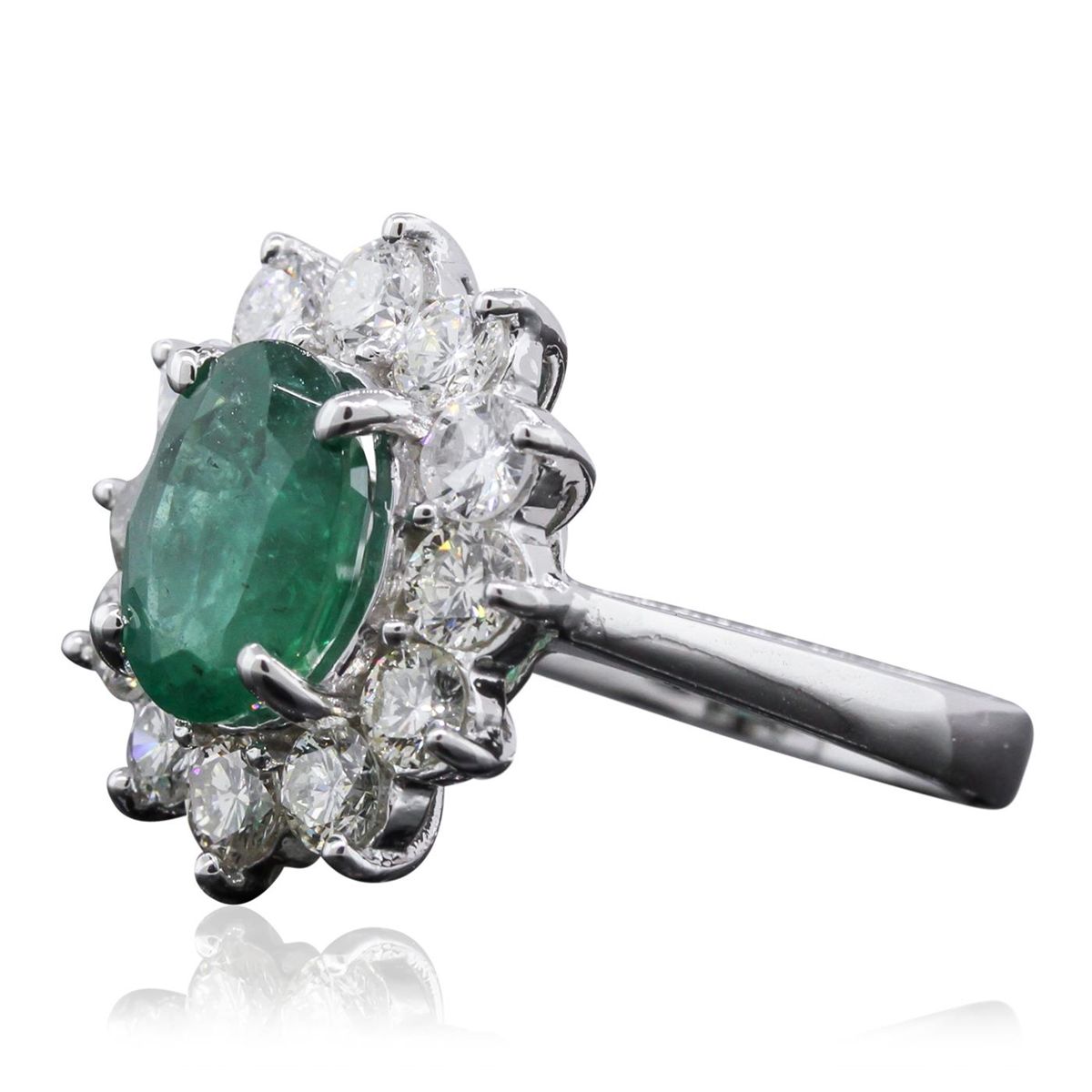 Great Condition! One electronically tested 14KT white gold Ladies combination cast & assembled fashion ring with a bright polish finish. Condition is new. Identified with markings of "14K". Containing: One prong set oval modified mixed cut natural emerald, measuring 9.80 x 7.60 x 5.10mm, approximate weight of 2.10ct., clarity is moderately included, type III, medium, moderately strong, very slightly bluish green color, (GIA vslbG 5/4), cut is good. Colored gemstones are presumed to have been subjected to commonly used and possible undetectable color/clarity enhancement processes. Twelve prong set round brilliant cut diamonds, measuring 3.00 - 3.00 x 1.80mm (depth est.) approximate total weight of 12 Stones = 1.25ct. Clarity of SI-1 to I-1, Color of I - J, Cut is Good. Total Weight of Colored Stones 2.10ct. Total Weight of Diamonds 1.25ct. Total Weight of Ring 5.80 grams. GGL Appraised at $9,375.00.