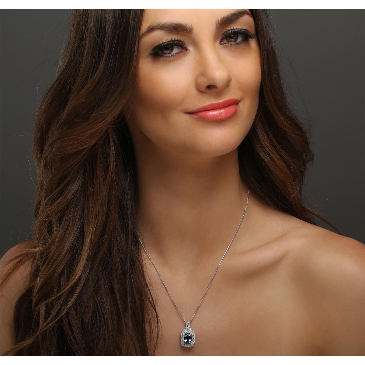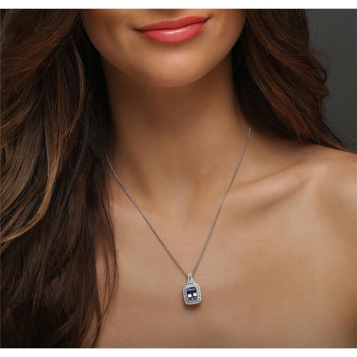One electronically tested 14KT white gold ladies combination cast & assembled pendant & chain 18.0" long, medium cable link with a lobster claw clasp with a bright polish finish. Identified with markings of "14K". Condition is new. Containing: One prong set rectangular cushion modified brilliant cut natural tanzanite, measuring 8.86 x 6.80 x 4.42mm, approximate weight of 2.10ct., clarity is eye clean, type I, medium light, very slightly grayish, violet color, (GIA V 4/3), cut is good. Seventy-One prong set round brilliant cut diamonds, measuring 1.10 - 1.10 x 0.66mm (depth est.) approximate total weight of 71 Stones = 0.34ct. . Clarity: I-1 to I-2. Color: I - J, Cut is Good. Colored gemstones are presumed to have been subjected to commonly used enhancement processes. All diamonds and colored gemstones are graded in the mounting, unless otherwise stated.. Total Weight of Colored Stones 2.10ct.. Total Weight of Diamonds 0.34ct.. Total Weight of Pendant & Chain 6.60 grams. GGL Appraised at $6,175.00.