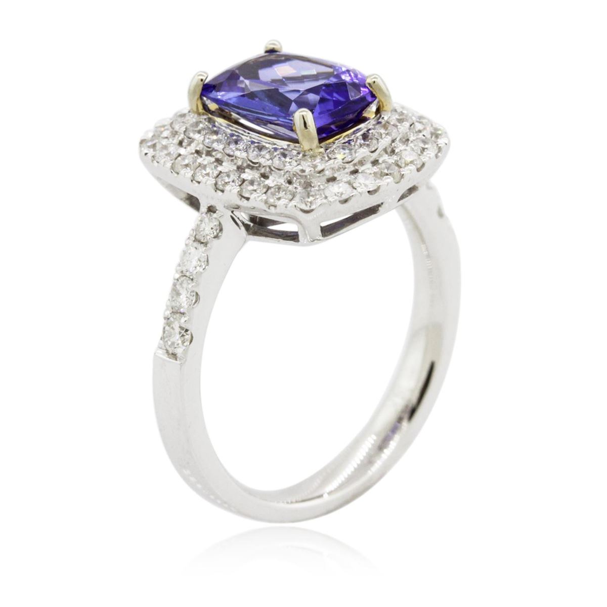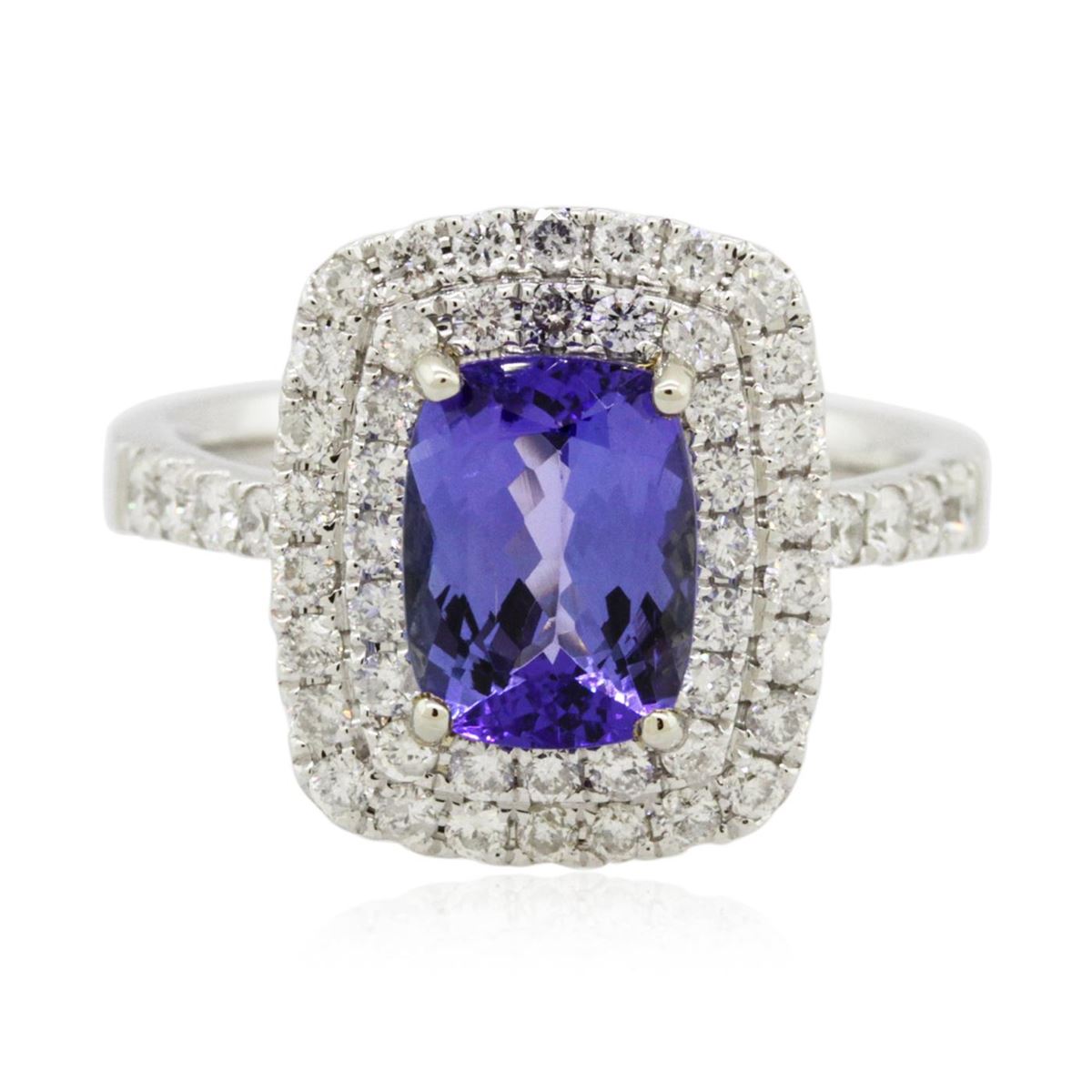 One electronically tested 14KT white gold Ladies combination cast & assembled ring with a bright polish finish. Condition is new. Identified with markings of "14K". Containing: One prong set rectangular cushion modified brilliant cut natural tanzanite, measuring 9.05 x 6.74 x 4.38mm, approximate. Total Weight of 2.10ct., clarity is eye clean, type I, medium, moderately strong, violetish blue color, (GIA vB 5/4), cut is good. Thirty prong set round brilliant cut diamonds, measuring 1.80 - 1.80 x 1.08mm (depth est.) approximate total weight of 30 Stones = 0.64ct. Clarity: SI-2 to I-1. Color: I - J, Cut is Good. Colored gemstones are presumed to have been subjected to commonly used enhancement processes. All diamonds and colored gemstones are graded in the mounting, unless otherwise stated. Total Weight of Colored Stones 2.10ct. Total Weight of Diamonds 0.64ct. Total Weight of Ring 5.80 grams. GGL Appraised at $6,175.00.
