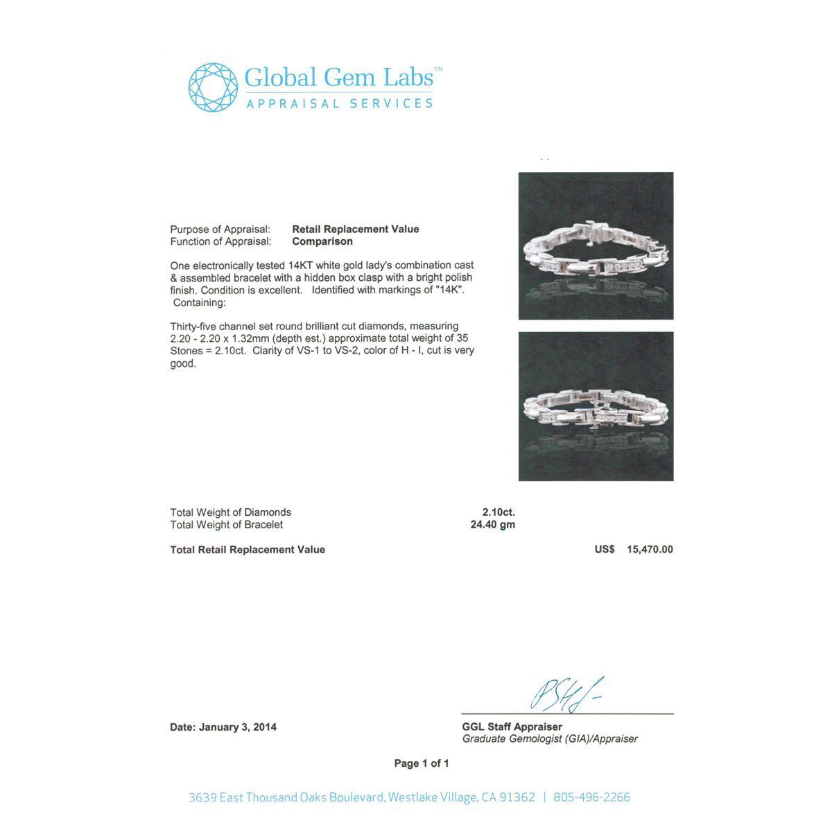 One electronically tested 14KT white gold Ladies combination cast & assembled bracelet with a hidden box clasp with a bright polish finish. Identified with markings of "14K". Condition is excellent. Containing: Thirty-Five channel set round brilliant cut diamonds, measuring 2.20 - 2.20 x 1.32mm (depth est.) approximate total weight of 35 Stones = 2.10ct. Clarity of VS-1 to VS-2, Color of H - I, Cut is Very Good. Total Weight of Diamonds 2.10ct. Total Weight of Bracelet 24.40gm. GGL Appraised at $15,470.00.