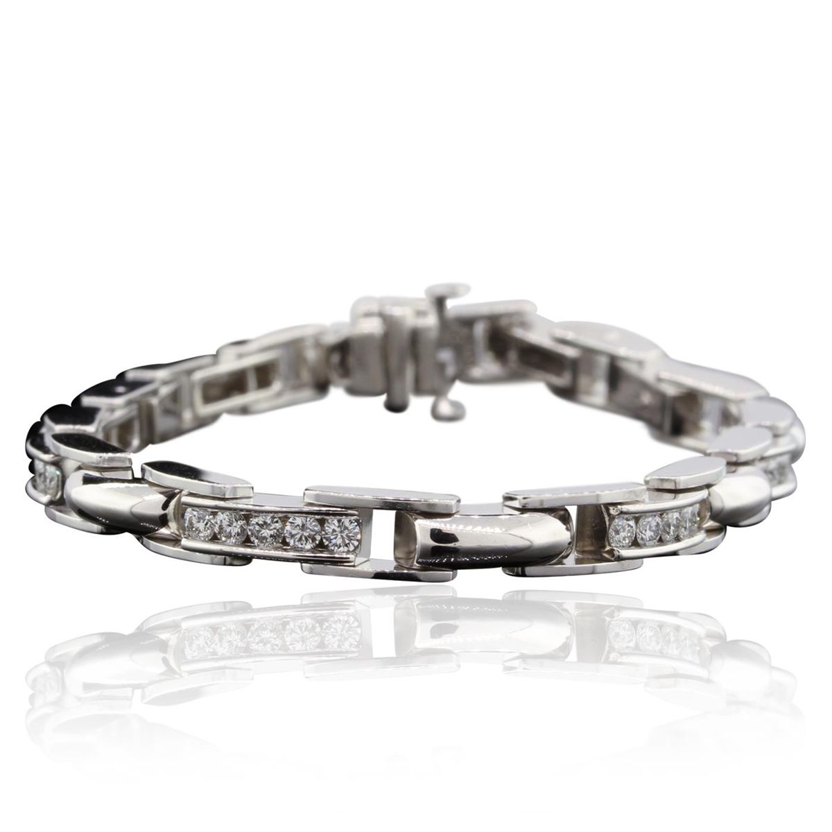One electronically tested 14KT white gold Ladies combination cast & assembled bracelet with a hidden box clasp with a bright polish finish. Identified with markings of "14K". Condition is excellent. Containing: Thirty-Five channel set round brilliant cut diamonds, measuring 2.20 - 2.20 x 1.32mm (depth est.) approximate total weight of 35 Stones = 2.10ct. Clarity of VS-1 to VS-2, Color of H - I, Cut is Very Good. Total Weight of Diamonds 2.10ct. Total Weight of Bracelet 24.40gm. GGL Appraised at $15,470.00.