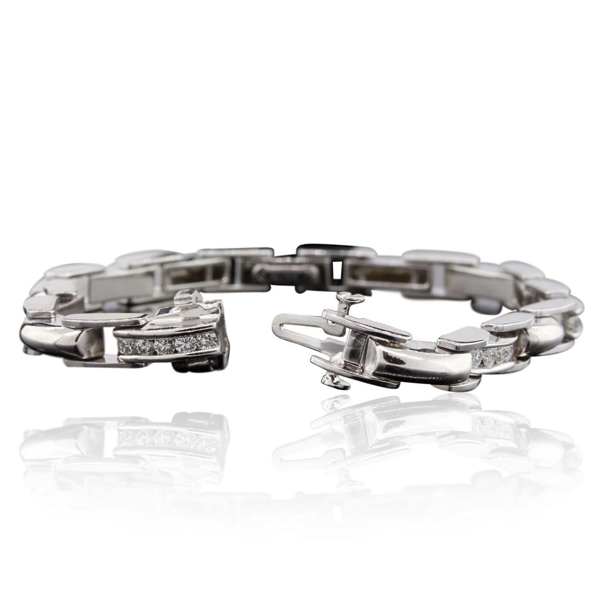 One electronically tested 14KT white gold Ladies combination cast & assembled bracelet with a hidden box clasp with a bright polish finish. Identified with markings of "14K". Condition is excellent. Containing: Thirty-Five channel set round brilliant cut diamonds, measuring 2.20 - 2.20 x 1.32mm (depth est.) approximate total weight of 35 Stones = 2.10ct. Clarity of VS-1 to VS-2, Color of H - I, Cut is Very Good. Total Weight of Diamonds 2.10ct. Total Weight of Bracelet 24.40gm. GGL Appraised at $15,470.00.