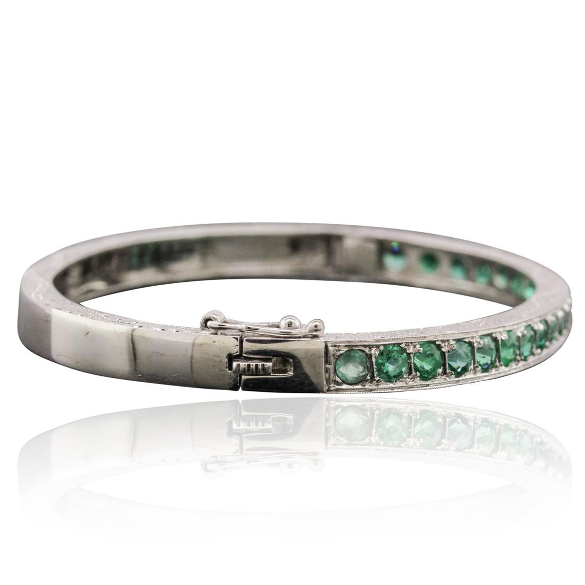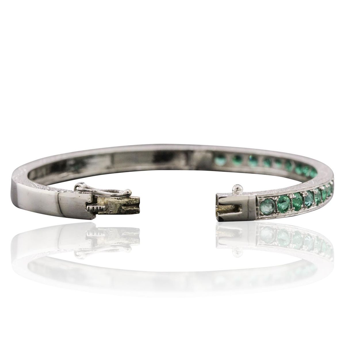 One electronically tested 14KT white gold ladies combination cast & assembled bangle bracelet with a hidden box clasp with a etched finish. Condition is new. Measurements: 2.40" x 1.80". Identified with markings of "14K". Containing: Twenty-one prong set round modified brilliant cut natural emeralds, measuring 3.00 - 3.00 x 1.95 mm, approximate. Total Weight of 2.10ct., clarity is heavily included, type III, medium light, very slightly grayish, bluish green color, (GIA bG 4/3), cut is good. Colored gemstones are presumed to have been subjected to commonly used enhancement processes. All colored gemstones are graded in the mounting, unless otherwise stated. Total Weight of Colored Stones 2.10ct. Total Weight of Bracelet 14.30 grams. GGL Appraised at $9,325.00.