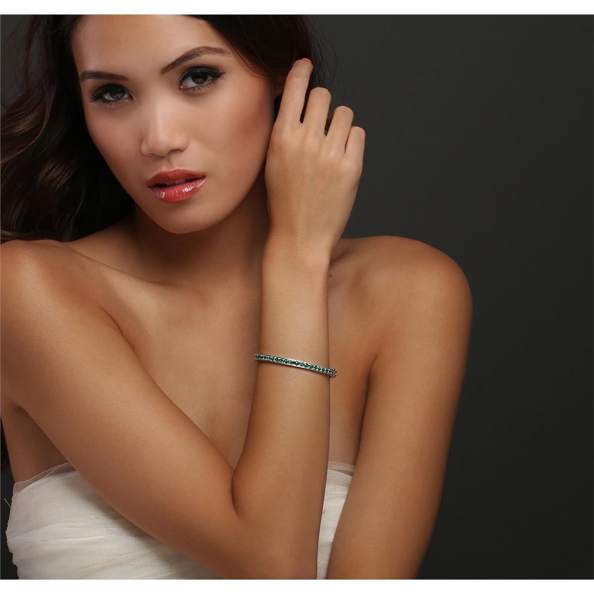 One electronically tested 14KT white gold ladies combination cast & assembled bangle bracelet with a hidden box clasp with a etched finish. Condition is new. Measurements: 2.40" x 1.80". Identified with markings of "14K". Containing: Twenty-one prong set round modified brilliant cut natural emeralds, measuring 3.00 - 3.00 x 1.95 mm, approximate. Total Weight of 2.10ct., clarity is heavily included, type III, medium light, very slightly grayish, bluish green color, (GIA bG 4/3), cut is good. Colored gemstones are presumed to have been subjected to commonly used enhancement processes. All colored gemstones are graded in the mounting, unless otherwise stated. Total Weight of Colored Stones 2.10ct. Total Weight of Bracelet 14.30 grams. GGL Appraised at $9,325.00.