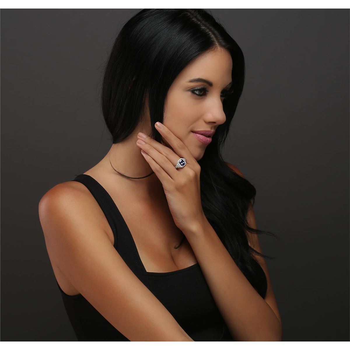 One electronically tested 14KT white gold ladies combination cast & assembled tanzanite and diamond ring with a split shank with a bright polish finish. Identified with markings of "14K". Condition is new. Containing: One prong set rectangular cushion modified brilliant cut natural tanzanite, measuring 8.90 x 6.80 x 4.42mm, approximate weight of 2.11ct., clarity is eye clean, type I, medium, very slightly grayish, violet color, (GIA V 5/3), cut is good. Fifty-Three prong set round brilliant cut diamonds, measuring 1.50 - 1.30 x 0.84mm (depth est.) approximate total weight of 53 Stones = 0.53ct. Clarity: I-1 to I-2. Color: I - J, Cut is Good. Colored gemstones are presumed to have been subjected to commonly used enhancement processes. All diamonds and colored gemstones are graded in the mounting, unless otherwise stated. Total Weight of Colored Stones 2.11ct. Total Weight of Diamonds 0.53ct. Total Weight of Ring 5.30 grams. GGL Appraised at $5,675.00.