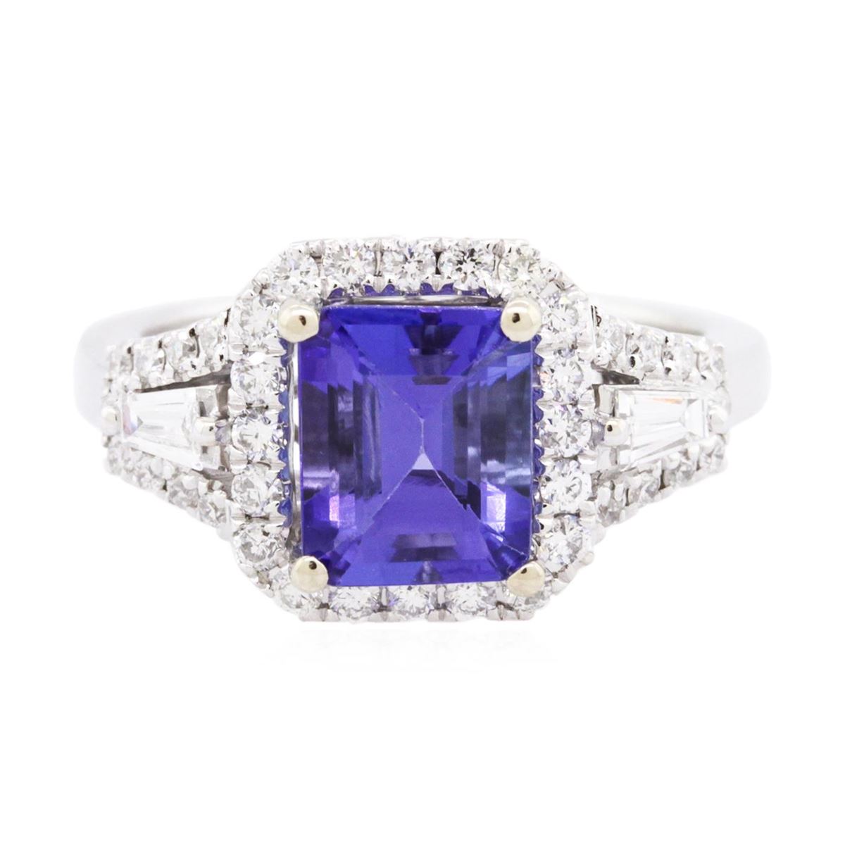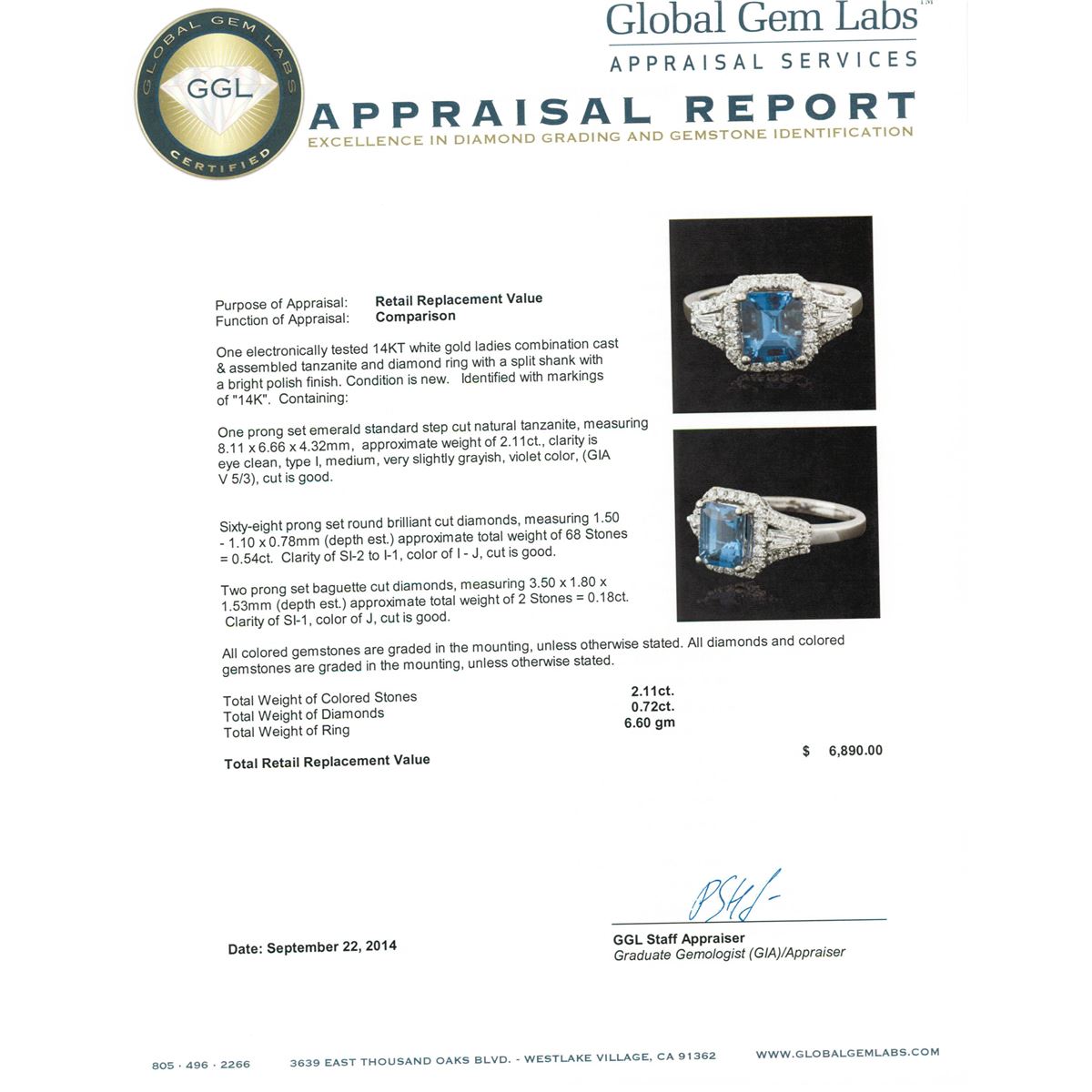 One electronically tested 14KT white gold ladies combination cast & assembled tanzanite and diamond ring with a split shank with a bright polish finish. Identified with markings of "14K". Condition is new. Containing: One prong set emerald standard step cut natural tanzanite, measuring 8.11 x 6.66 x 4.32mm, approximate weight of 2.11ct., clarity is eye clean, type I, medium, very slightly grayish, violet color, (GIA V 5/3), cut is good. Sixty-Eight prong set round brilliant cut diamonds, measuring 1.50 - 1.10 x 0.78mm (depth est.) approximate total weight of 68 Stones = 0.54ct. Clarity: SI-2 to I-1. Color: I - J, Cut is Good. Two prong set baguette cut diamonds, measuring 3.50 x 1.80 x 1.53mm (depth est.) approximate total weight of 2 Stones = 0.18ct. Clarity: SI-1. Color: J, Cut is Good. All colored gemstones are graded in the mounting, unless otherwise stated. All diamonds and colored gemstones are graded in the mounting, unless otherwise stated. Total Weight of Colored Stones 2.11ct. Total Weight of Diamonds 0.72ct. Total Weight of Ring 6.60 grams. GGL Appraised at $6,890.00.