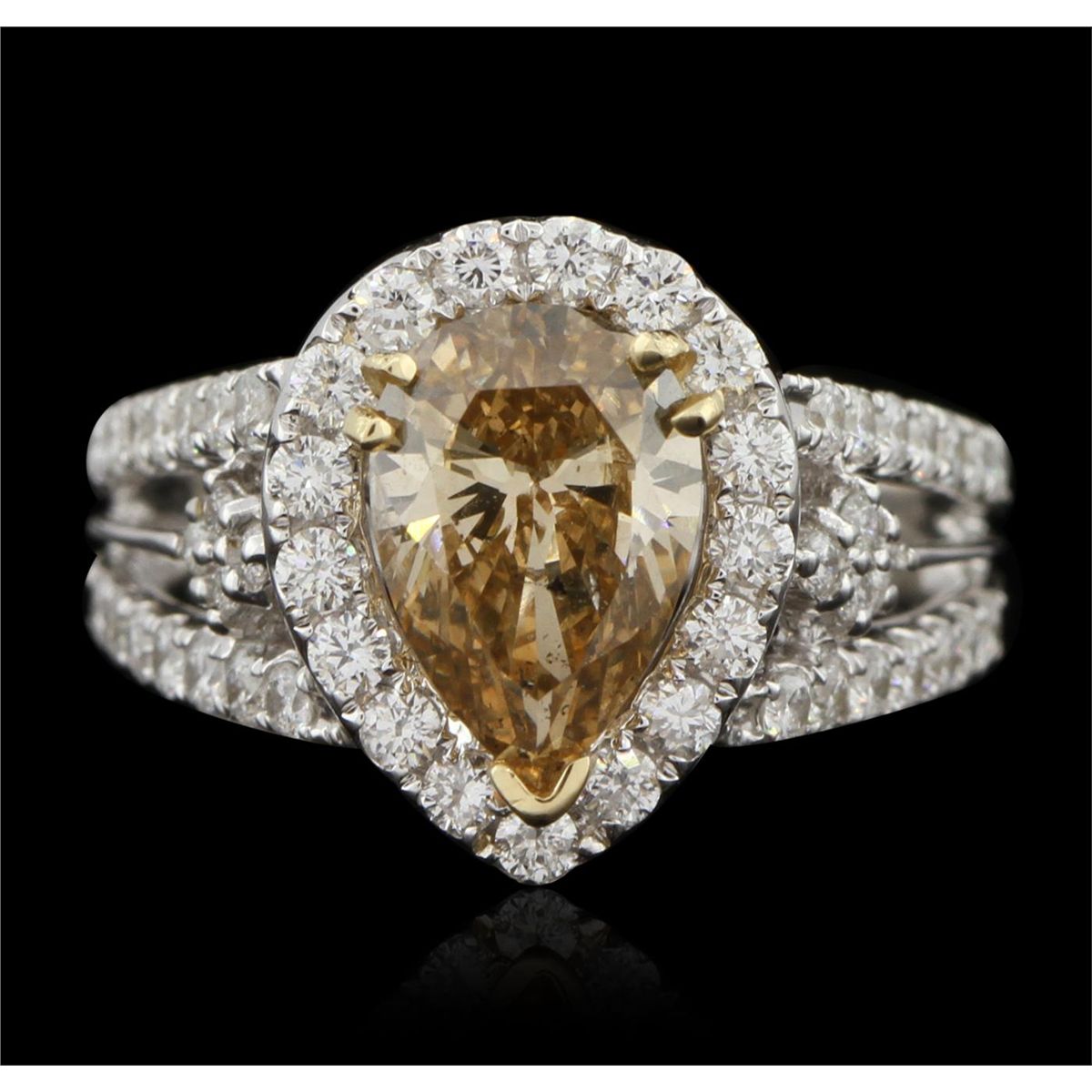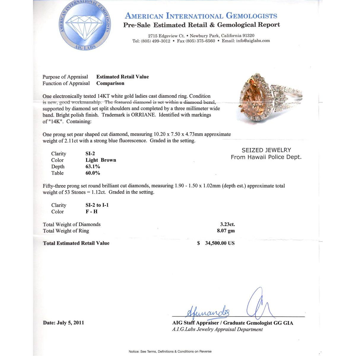 One electronically tested 14KT white gold ladies cast diamond ring. Condition is new, good workmanship. The featured diamond is set within a diamond bezel, supported by diamond set split shoulders and completed by a three millimeter wide band. Bright polish finish. Trademark is ORRIANE. Identified with markings of "14K". Containing: One prong set pear shaped cut diamond, measuring 10.20 x 7.50 x 4.73mm approximate weight of 2.11ct with a strong blue fluorescence. Graded in the setting. Clarity SI-2. Color : Light Brown. Depth 63.1%. Table 60.00%. Fifty-three prong set round brilliant cut diamonds, measuring 1.90 - 1.50 x 1.02mm (depth est.) approximate total weight of 53 Stones = 1.12ctw. Graded in the setting. Clarity SI-2. Color F-H. Total Weight of Diamonds 3.23ctw. Total Weight of Ring: 8.07 grams. AIG Appraised at $34,500.00.