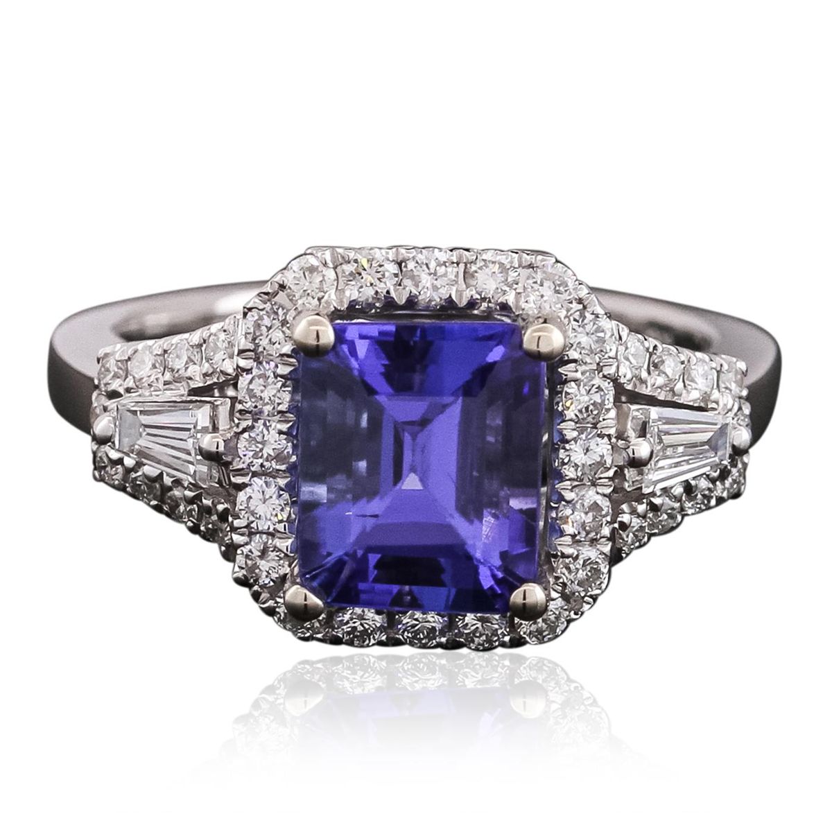 One electronically tested 14KT white gold ladies combination cast & assembled tanzanite and diamond ring with a split shank with a bright polish finish. Identified with markings of "14K". Condition is new. Containing: One prong set emerald standard step cut natural tanzanite, measuring 8.11 x 6.66 x 4.32mm, approximate weight of 2.11ct., clarity is eye clean, type I, medium, very slightly grayish, violet color, (GIA V 5/3), cut is good. Sixty-Eight prong set round brilliant cut diamonds, measuring 1.50 - 1.10 x 0.78mm (depth est.) approximate total weight of 68 Stones = 0.54ct. Clarity: SI-2 to I-1. Color: I - J, Cut is Good. Two prong set baguette cut diamonds, measuring 3.50 x 1.80 x 1.53mm (depth est.) approximate total weight of 2 Stones = 0.18ct. Clarity: SI-1. Color: J, Cut is Good. All colored gemstones are graded in the mounting, unless otherwise stated. All diamonds and colored gemstones are graded in the mounting, unless otherwise stated. Total Weight of Colored Stones 2.11ct. Total Weight of Diamonds 0.72ct. Total Weight of Ring 6.60 grams. GGL Appraised at $6,890.00.