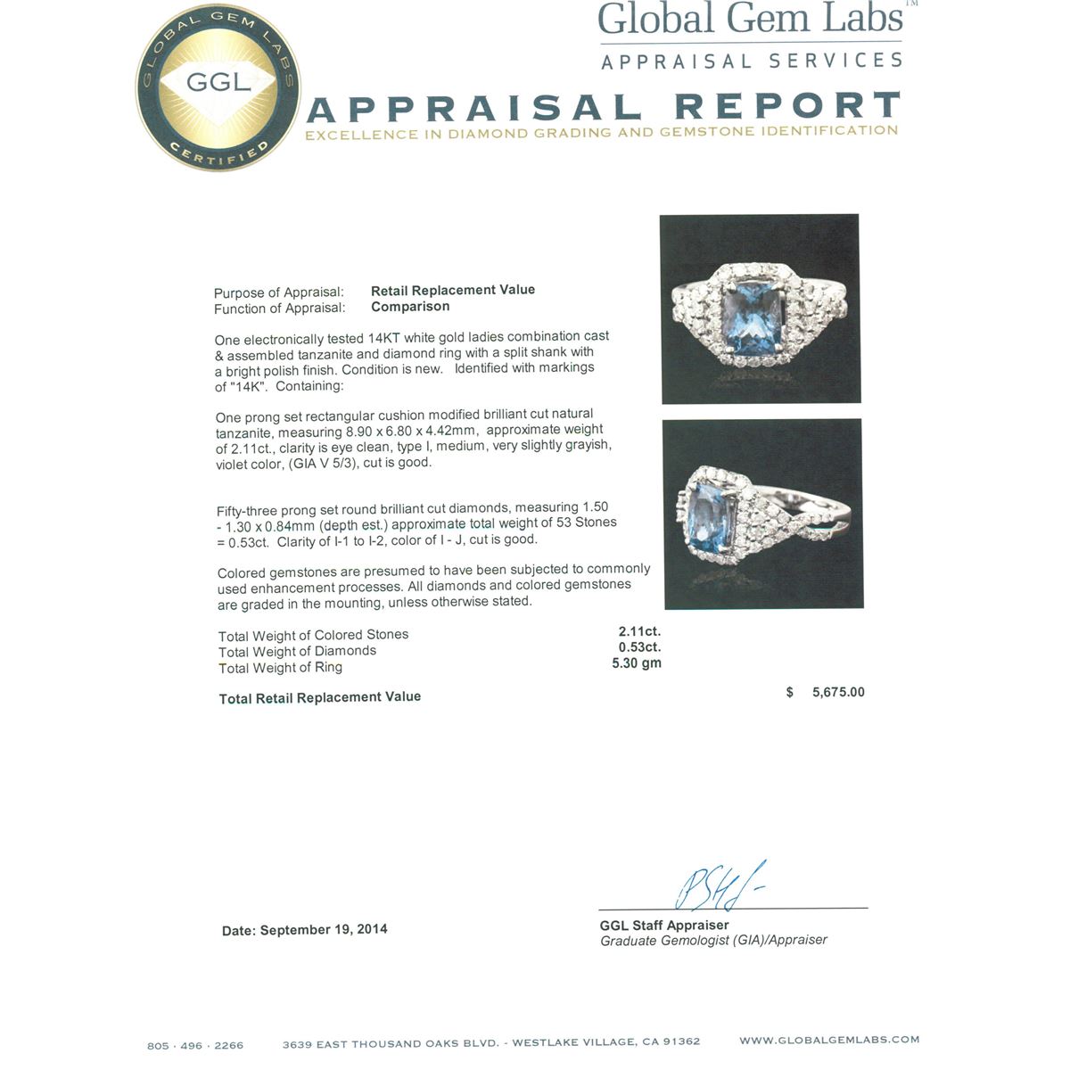 One electronically tested 14KT white gold ladies combination cast & assembled tanzanite and diamond ring with a split shank with a bright polish finish. Identified with markings of "14K". Condition is new. Containing: One prong set rectangular cushion modified brilliant cut natural tanzanite, measuring 8.90 x 6.80 x 4.42mm, approximate weight of 2.11ct., clarity is eye clean, type I, medium, very slightly grayish, violet color, (GIA V 5/3), cut is good. Fifty-Three prong set round brilliant cut diamonds, measuring 1.50 - 1.30 x 0.84mm (depth est.) approximate total weight of 53 Stones = 0.53ct. Clarity: I-1 to I-2. Color: I - J, Cut is Good. Colored gemstones are presumed to have been subjected to commonly used enhancement processes. All diamonds and colored gemstones are graded in the mounting, unless otherwise stated. Total Weight of Colored Stones 2.11ct. Total Weight of Diamonds 0.53ct. Total Weight of Ring 5.30 grams. GGL Appraised at $5,675.00.