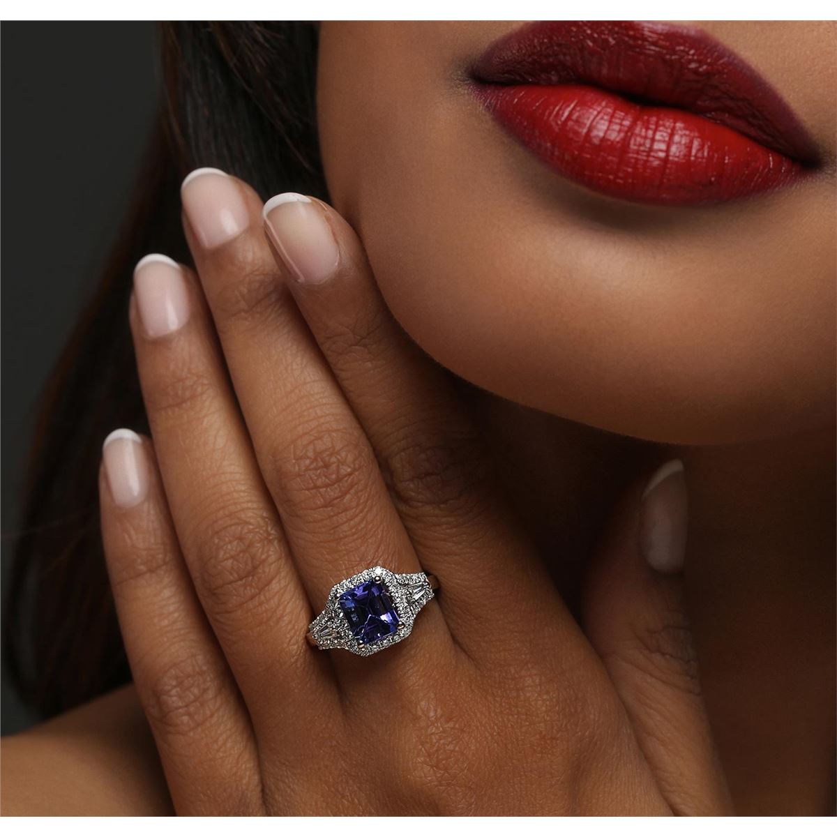 One electronically tested 14KT white gold ladies combination cast & assembled tanzanite and diamond ring with a split shank with a bright polish finish. Identified with markings of "14K". Condition is new. Containing: One prong set emerald standard step cut natural tanzanite, measuring 8.11 x 6.66 x 4.32mm, approximate weight of 2.11ct., clarity is eye clean, type I, medium, very slightly grayish, violet color, (GIA V 5/3), cut is good. Sixty-Eight prong set round brilliant cut diamonds, measuring 1.50 - 1.10 x 0.78mm (depth est.) approximate total weight of 68 Stones = 0.54ct. Clarity: SI-2 to I-1. Color: I - J, Cut is Good. Two prong set baguette cut diamonds, measuring 3.50 x 1.80 x 1.53mm (depth est.) approximate total weight of 2 Stones = 0.18ct. Clarity: SI-1. Color: J, Cut is Good. All colored gemstones are graded in the mounting, unless otherwise stated. All diamonds and colored gemstones are graded in the mounting, unless otherwise stated. Total Weight of Colored Stones 2.11ct. Total Weight of Diamonds 0.72ct. Total Weight of Ring 6.60 grams. GGL Appraised at $6,890.00.