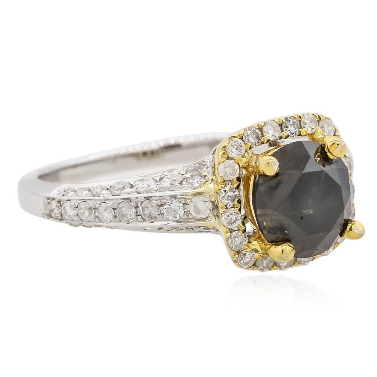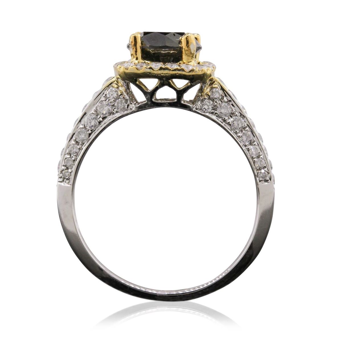 One electronically tested 14KT white gold ladies cast diamond ring. Condition is new, good workmanship. The featured diamond is set within a diamond bezel supported by diamond set shoulders, completed by a one and one-half millimeter wide band. Bright polish finish with yellow gold accents. Trademark is Orianne. Identified with markings of "14K". Containing: One prong set round brilliant cut diamond, measuring 7.10 - 7.08 x 4.70mm (depth est.) approximate weight of 1.51ct. EGL Report attached. Graded in the EGL Laboratory Report #US 68320904D. Clarity: I-1. Depth: 66.3%. Table 59.0%. Sixty-Eight prong set round brilliant cut diamonds, measuring 1.50 - 1.20 x 0.81mm (depth est.) approximate. Total Weight of 68 Stones = 0.60ct. Graded in the EGL Laboratory Report #US 68320904D. Clarity: SI-3 to I-2. Color: F - G. Total Weight of Diamonds 2.11ct. Total Weight of Ring 3.07 grams. AIG Appraised at $13,175.00.
