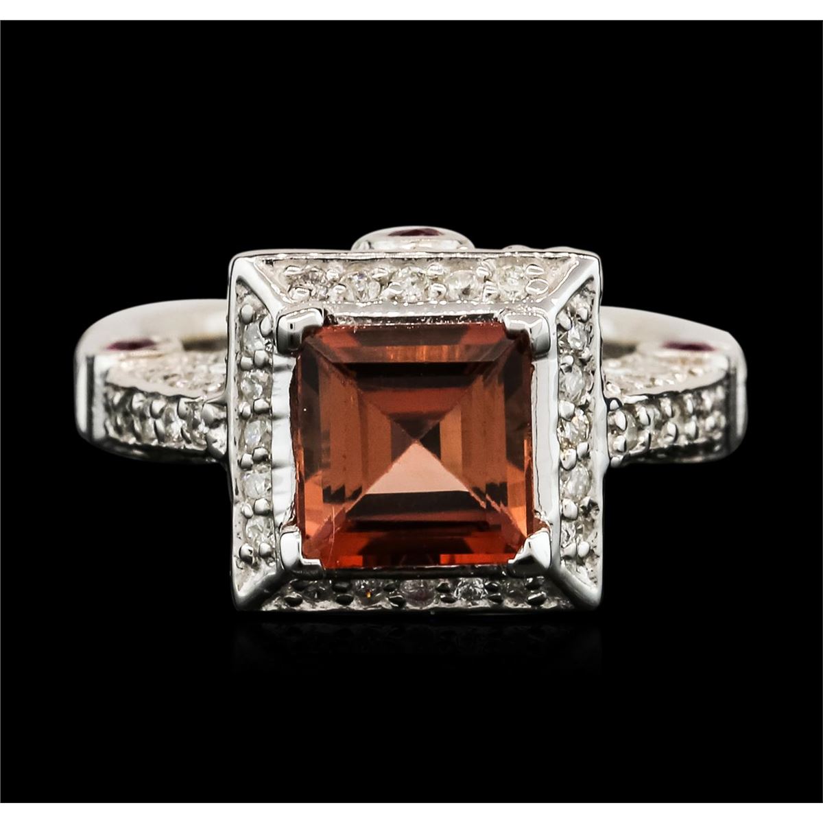 One electronically tested 14KT white gold ladies cast tourmaline & diamond ring with a bright finish. The featured tourmaline is set within a diamond bezel, supported by a diamond set tourmaline and diamond under gallery and diamond set shoulders, completed by a three millimeter wide band. Identified with markings of "14K". Condition is new, good workmanship. Containing: One square standard step cut natural tourmaline, measuring 7.00 x 7.00 x 4.60mm, approximate weight of 1.72ct. Clarity is eye clean, type II, dark, brownish, Orangy Pink color, (GIA OPk 7/1) cut is good. Transmitting light with no distortion, transparent. Graded in the setting. Six bezel set round mixed cut natural pink tourmalines, measuring 2.40 - 2.40 x 1.56 mm, approximate total weight of 0.40ct., clarity is moderately included, type II, medium, brownish, strongly purplish red color, (GIA stpR 5/1), cut is good. Transmitting light with a minimum of distortion, transparent. Naturally occurring internal & external characteristics are present. Graded in the setting. Eighty-Six prong set round brilliant cut diamonds, measuring 1.40 - 1.30 x 0.81mm (depth est.) approximate total weight of 86 Stones = 0.78ct. Graded in the setting. Clarity: I-1 to I-2. Color: G - I. Total Weight of Colored Stones 2.12ct. Total Weight of Diamonds 0.78ct. Total Weight of Ring 9.11 grams. AIG Appraised at $6,550.00.