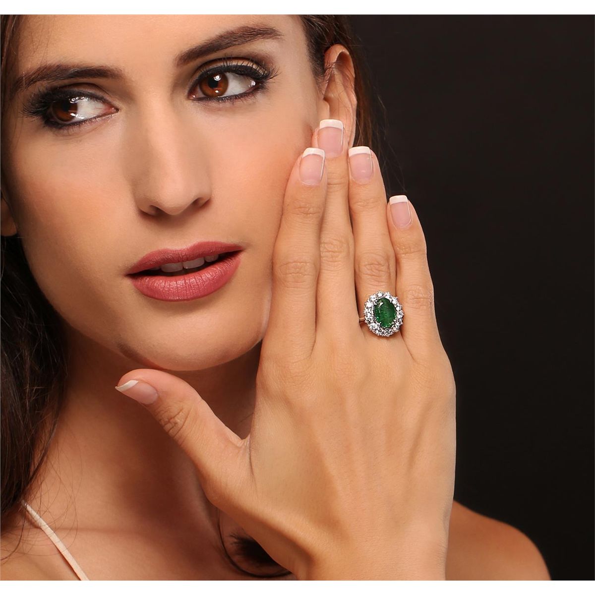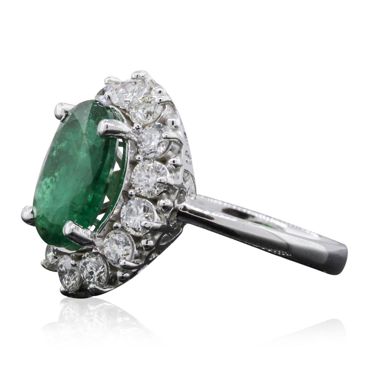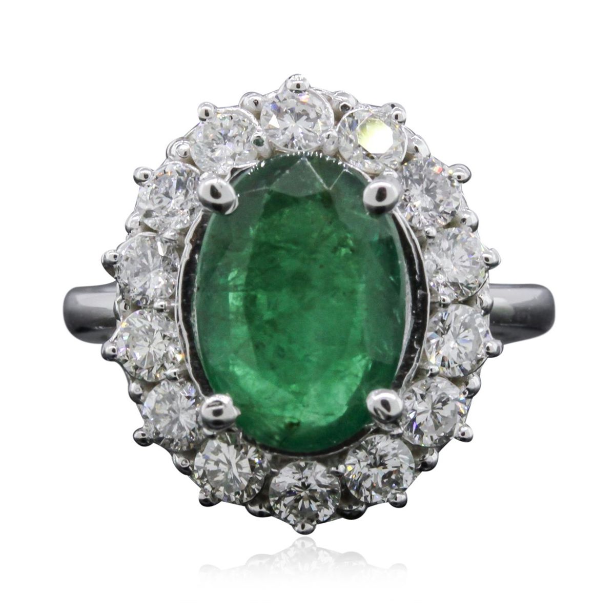 Great Condition! One electronically tested 14KT white gold Ladies combination cast & assembled fashion ring with a bright polish finish. Condition is new. Identified with markings of "14K". Containing: One prong set oval modified mixed cut natural emerald, measuring 12.00 x 8.00 x 3.90mm, approximate weight of 2.12ct., clarity is heavily included, type III, medium, moderately strong, very slightly bluish green color, (GIA vslbG 5/4), cut is good. Colored gemstones are presumed to have been subjected to commonly used and possible undetectable color/clarity enhancement processes. Fourteen prong set round brilliant cut diamonds, measuring 2.80 - 2.80 x 1.68mm (depth est.) approximate total weight of 14 Stones = 1.12ct. Clarity of I-1 to I-2, Color of I - J, Cut is Good. Total Weight of Colored Stones 2.12ct. Total Weight of Diamonds 1.12ct. Total Weight of Ring 6.10 grams. GGL Appraised at $8,150.00.