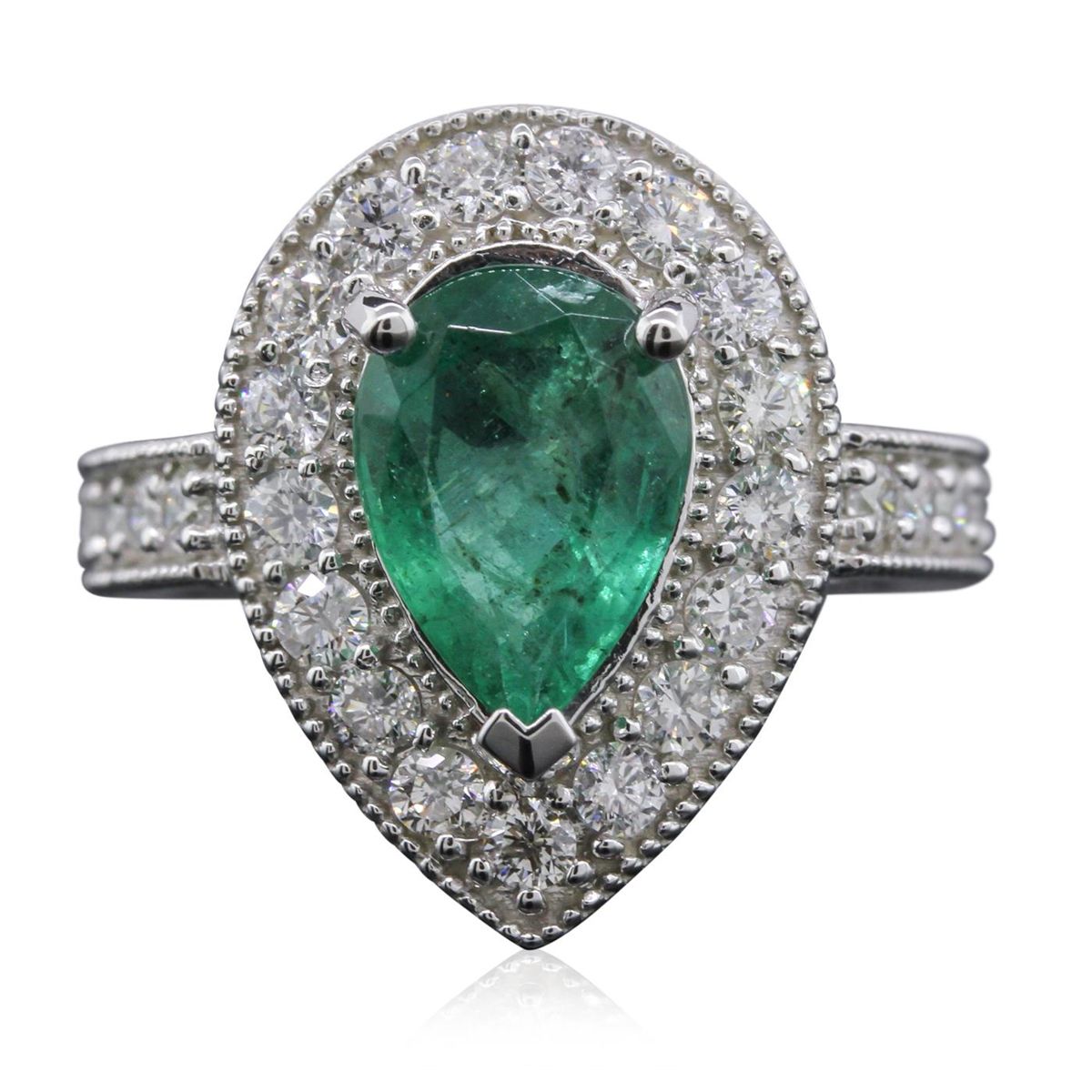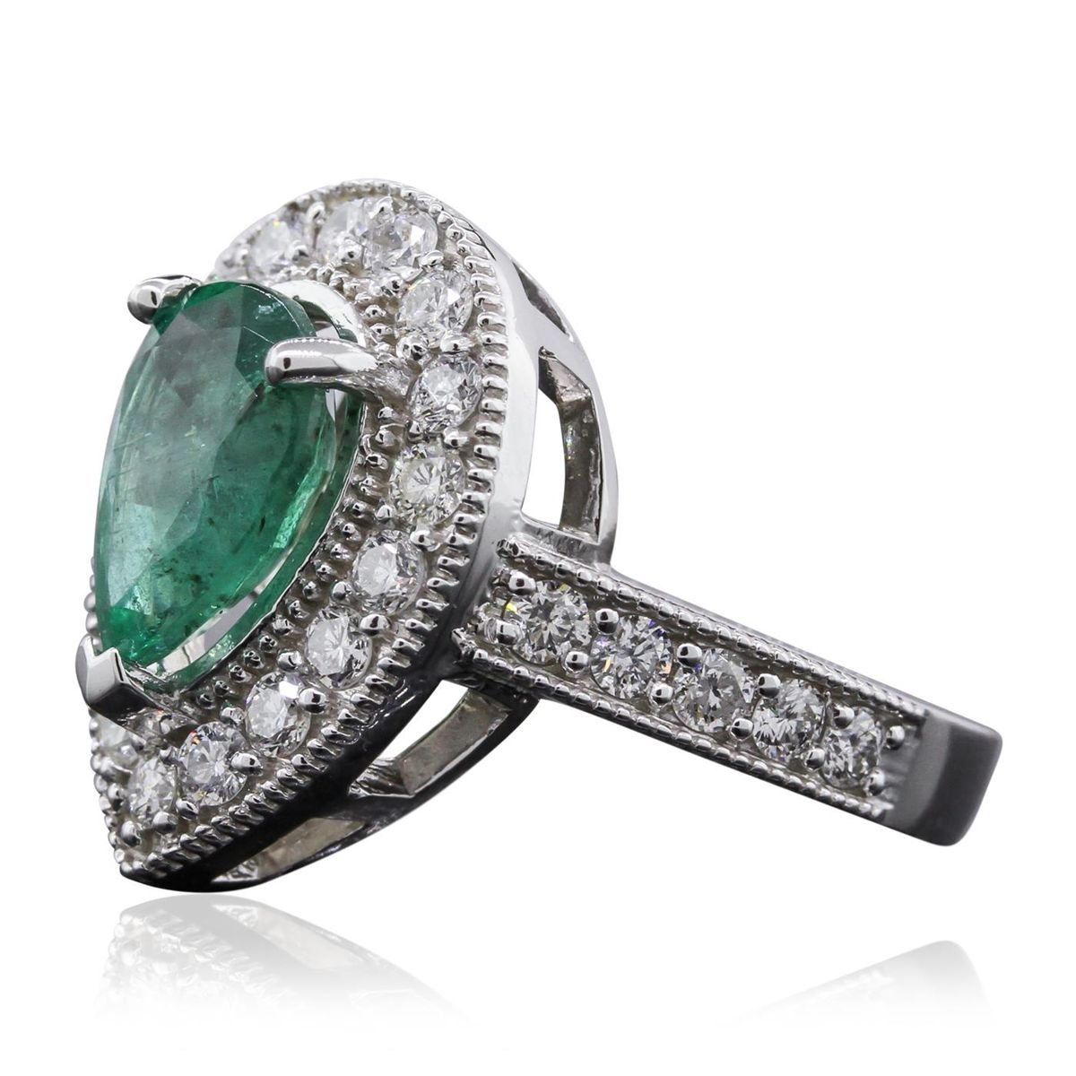 Great Condition! One electronically tested 14KT white gold Ladies combination cast & assembled fashion ring with a bright polish finish. Condition is new. Identified with markings of "14K". Containing: One prong set pear modified brilliant cut natural emerald, measuring 11.20 x 7.20 x 4.83mm, approximate weight of 2.12ct., clarity is heavily included, type III, medium, moderately strong, green color, (GIA G 5/4), cut is good. Colored gemstones are presumed to have been subjected to commonly used and possible undetectable color/clarity enhancement processes. Twenty-Seven prong set round brilliant cut diamonds, measuring 2.20 - 2.20 x 1.32mm (depth est.) approximate total weight of 27 Stones = 1.05ct. Clarity of SI-2 to I-1, Color of I - J, Cut is Good. Total Weight of Colored Stones 2.12ct. Total Weight of Diamonds 1.05ct. Total Weight of Ring 7.00 grams. GGL Appraised at $9,140.00.