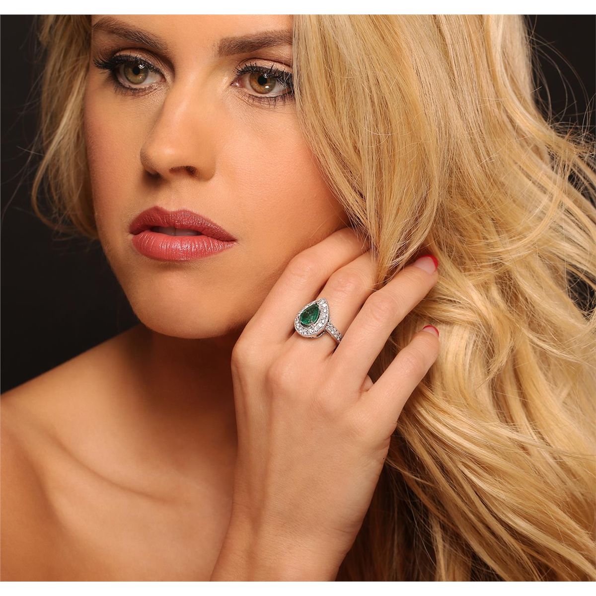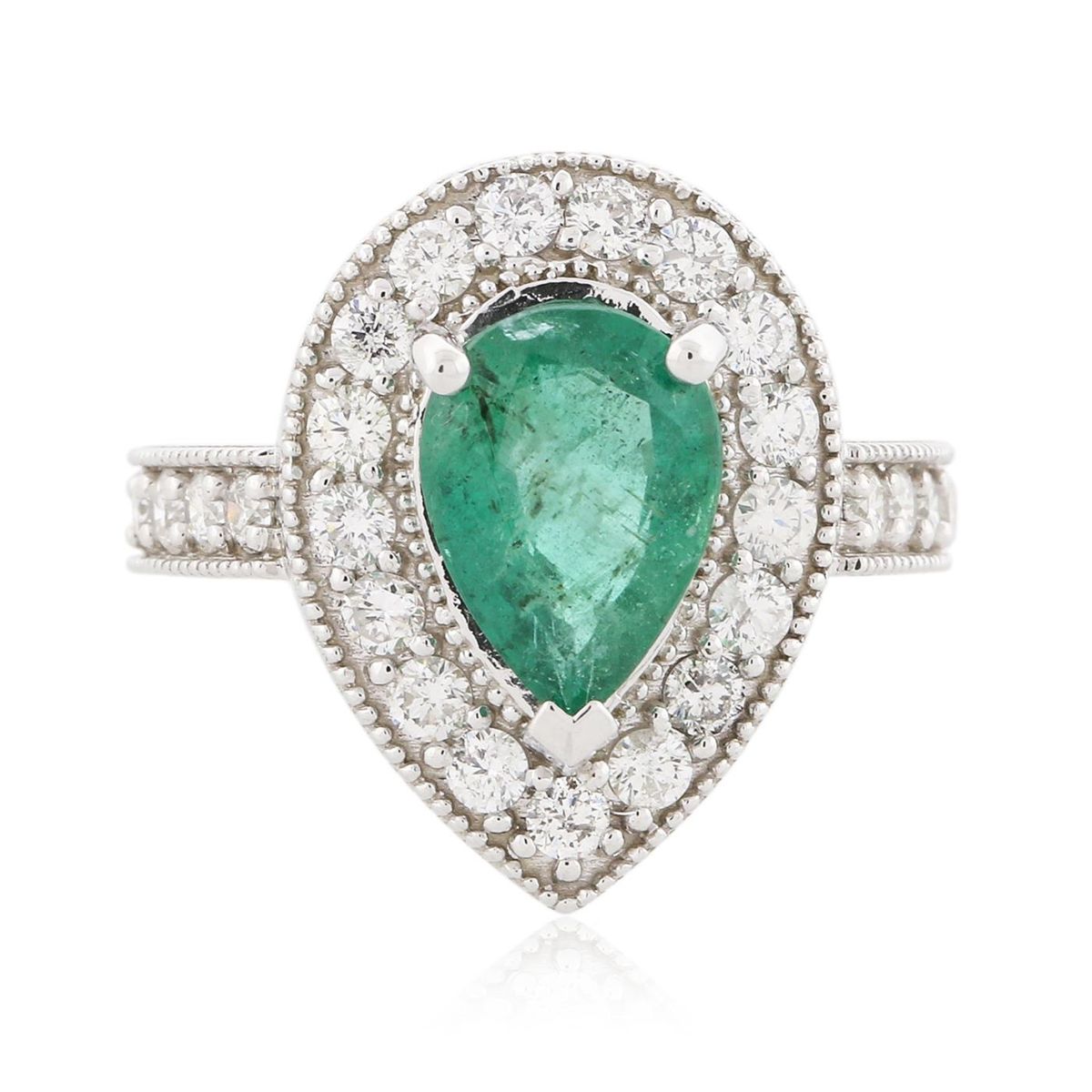 Great Condition! One electronically tested 14KT white gold Ladies combination cast & assembled fashion ring with a bright polish finish. Condition is new. Identified with markings of "14K". Containing: One prong set pear modified brilliant cut natural emerald, measuring 11.20 x 7.20 x 4.83mm, approximate weight of 2.12ct., clarity is heavily included, type III, medium, moderately strong, green color, (GIA G 5/4), cut is good. Colored gemstones are presumed to have been subjected to commonly used and possible undetectable color/clarity enhancement processes. Twenty-Seven prong set round brilliant cut diamonds, measuring 2.20 - 2.20 x 1.32mm (depth est.) approximate total weight of 27 Stones = 1.05ct. Clarity of SI-2 to I-1, Color of I - J, Cut is Good. Total Weight of Colored Stones 2.12ct. Total Weight of Diamonds 1.05ct. Total Weight of Ring 7.00 grams. GGL Appraised at $9,140.00.