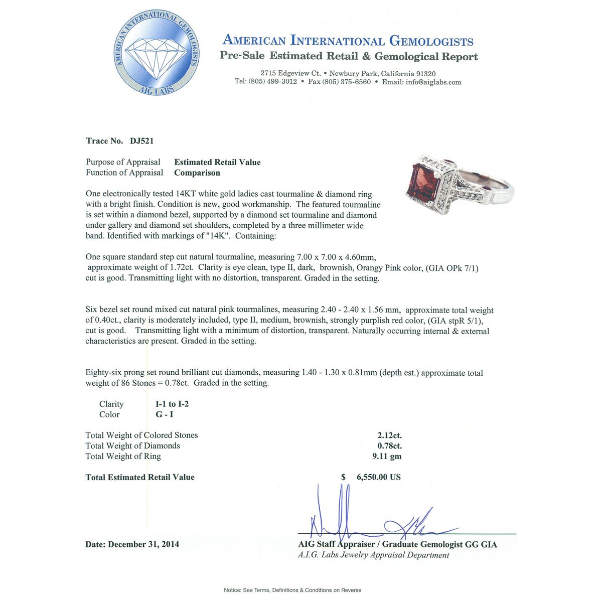 One electronically tested 14KT white gold ladies cast tourmaline & diamond ring with a bright finish. The featured tourmaline is set within a diamond bezel, supported by a diamond set tourmaline and diamond under gallery and diamond set shoulders, completed by a three millimeter wide band. Identified with markings of "14K". Condition is new, good workmanship. Containing: One square standard step cut natural tourmaline, measuring 7.00 x 7.00 x 4.60mm, approximate weight of 1.72ct. Clarity is eye clean, type II, dark, brownish, Orangy Pink color, (GIA OPk 7/1) cut is good. Transmitting light with no distortion, transparent. Graded in the setting. Six bezel set round mixed cut natural pink tourmalines, measuring 2.40 - 2.40 x 1.56 mm, approximate total weight of 0.40ct., clarity is moderately included, type II, medium, brownish, strongly purplish red color, (GIA stpR 5/1), cut is good. Transmitting light with a minimum of distortion, transparent. Naturally occurring internal & external characteristics are present. Graded in the setting. Eighty-Six prong set round brilliant cut diamonds, measuring 1.40 - 1.30 x 0.81mm (depth est.) approximate total weight of 86 Stones = 0.78ct. Graded in the setting. Clarity: I-1 to I-2. Color: G - I. Total Weight of Colored Stones 2.12ct. Total Weight of Diamonds 0.78ct. Total Weight of Ring 9.11 grams. AIG Appraised at $6,550.00.