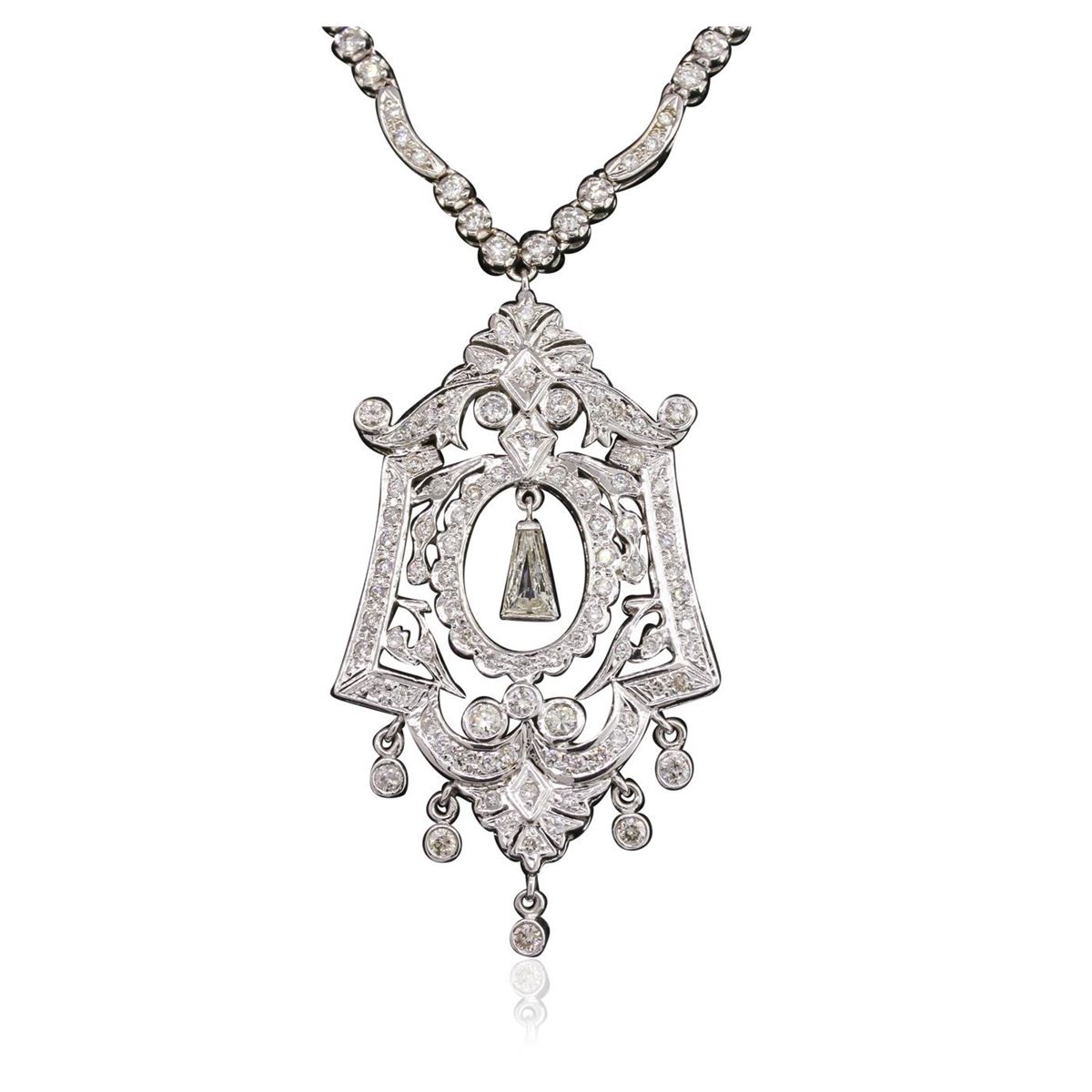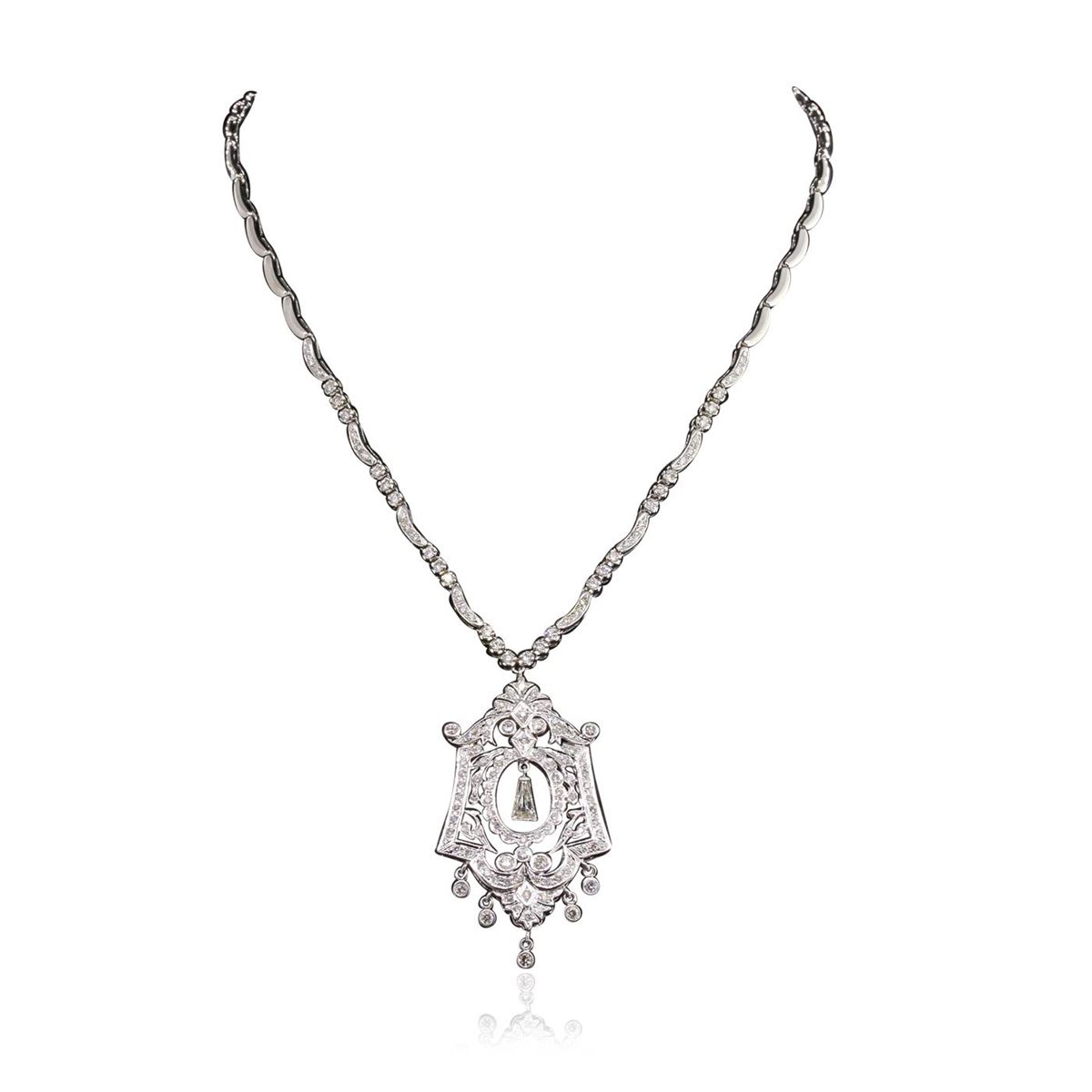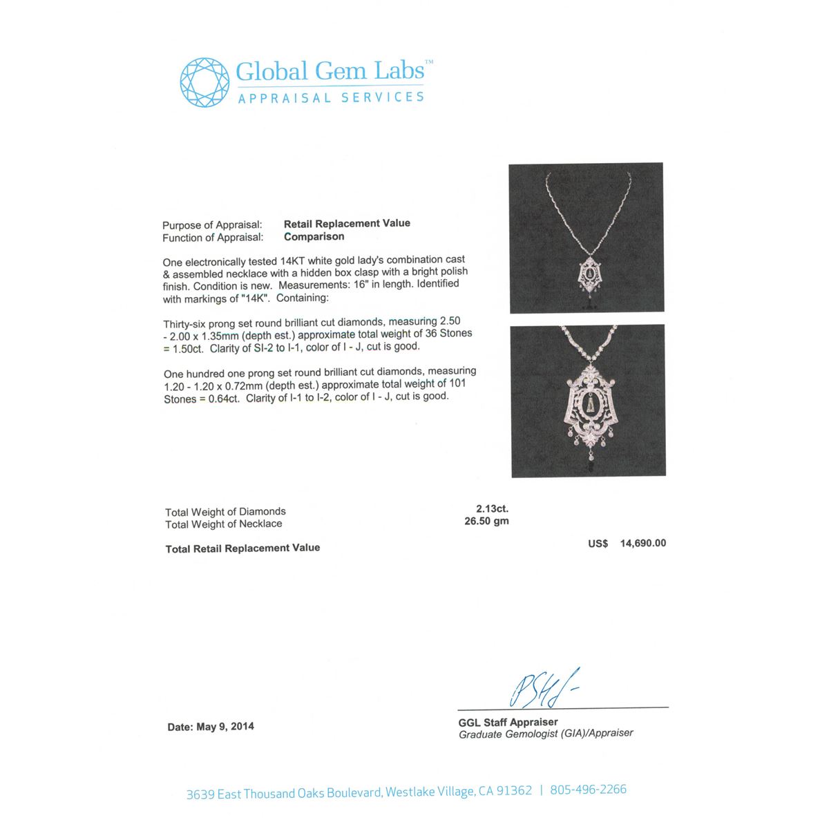 One electronically tested 14KT white gold Ladies combination cast & assembled necklace with a hidden box clasp with a bright polish finish. Condition is new. Measurements: 16" in length. Identified with markings of "14K". Containing: Thirty-Six prong set round brilliant cut diamonds, measuring 2.50 - 2.00 x 1.35mm (depth est.) approximate. Total Weight of 36 Stones = 1.50ct. Clarity: SI-2 to I-1. Color: I - J, Cut is Good. One Hundred One prong set round brilliant cut diamonds, measuring 1.20 - 1.20 x 0.72mm (depth est.) approximate. Total Weight of 101 Stones = 0.64ct. Clarity: I-1 to I-2. Color: I - J, Cut is Good. Total Weight of Diamonds 2.13ct. Total Weight of Necklace 26.50 grams. GGL Appraised at $14,690.00.