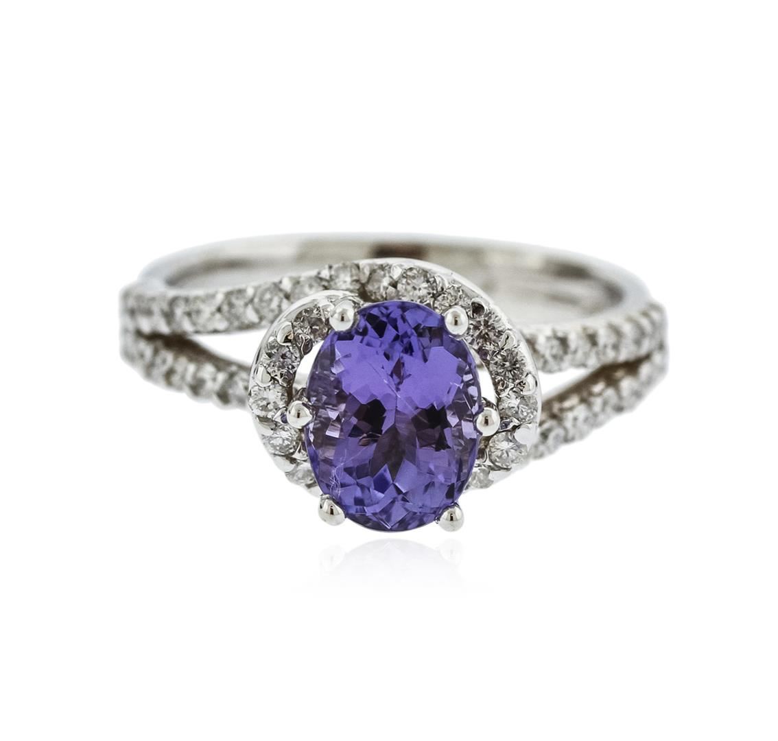 One electronically tested 14KT white gold ladies cast tanzanite and diamond ring with a bright polish finish. Identified with markings of "14K". Condition is new. Containing: One prong set oval modified brilliant cut natural tanzanite, measuring 8.50 x 7.40 x 4.81mm, approximate weight of 2.13ct., clarity is eye clean, type I, medium light, very slightly grayish, violet color, (GIA V 4/3), cut is good. Fifty prong set round brilliant cut diamonds, measuring 1.50 - 1.50 x 0.90mm (depth est.) approximate total weight of 50 Stones = 0.62ct. Clarity: SI-1 to SI-2. Color: I - J, Cut is Good. Colored gemstones are presumed to have been subjected to commonly used enhancement processes. All diamonds and colored gemstones are graded in the mounting, unless otherwise stated. Total Weight of Colored Stones 2.13ct. Total Weight of Diamonds 0.62ct. Total Weight of Ring 5.10 grams. GGL Appraised at $3,495.00.