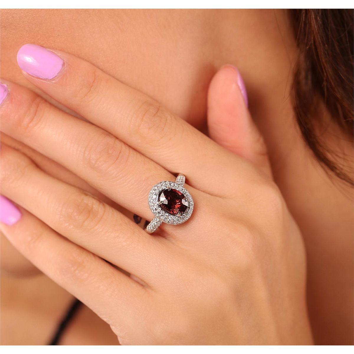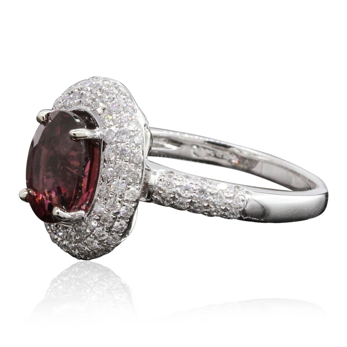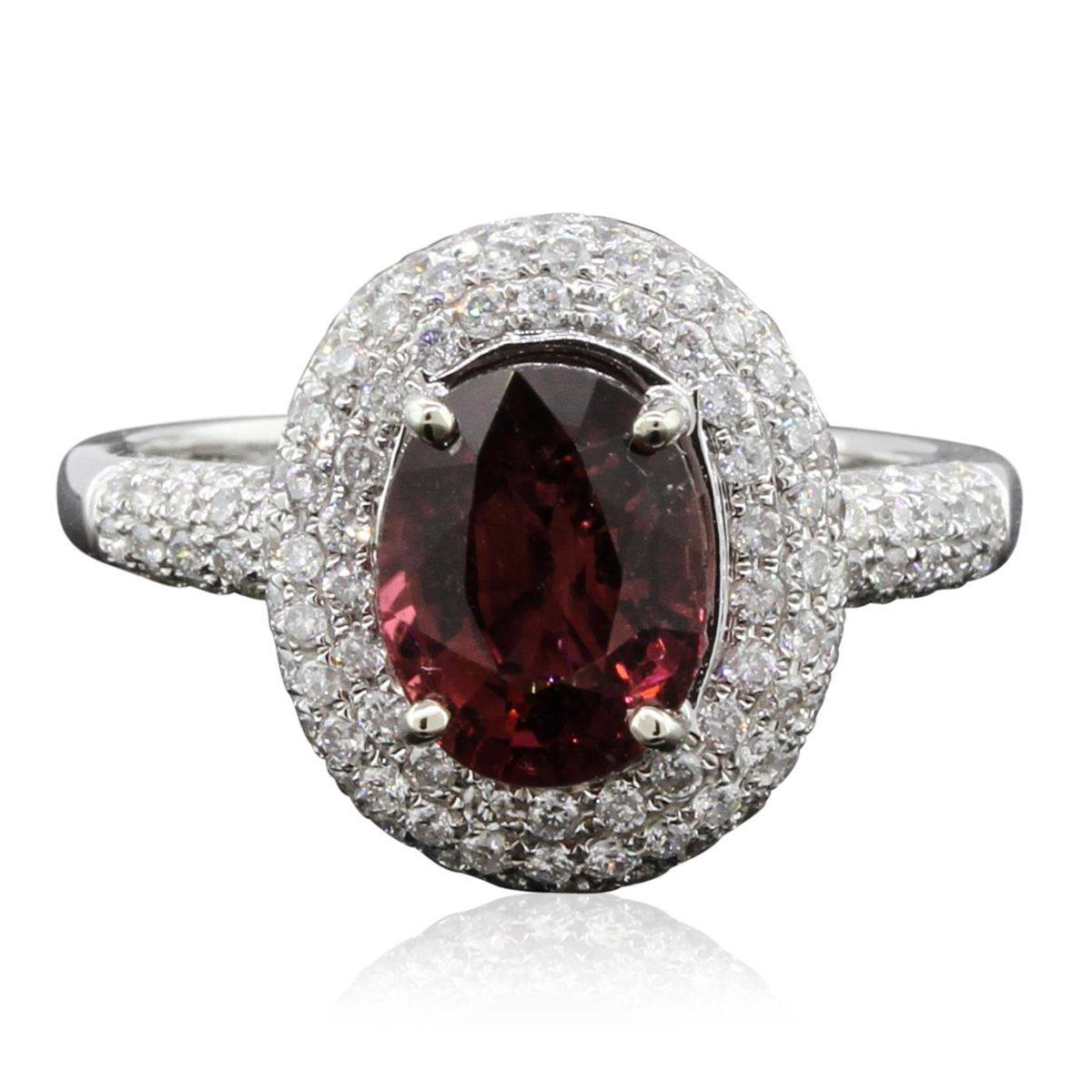 One electronically tested 14KT white gold ladies cast tourmaline and diamond ring with a bright polish finish. Condition is new, good workmanship. The featured tourmaline is set within a pav‚ set diamond bezel supported by a diamond set under gallery and pav‚ set diamond shoulders, completed by a two millimeter wide band. Trademark is Orianne. Identified with markings of "14K". Containing: One prong set oval mixed cut natural rubellite, measuring 9.00 x 6.90 x 5.20mm, 6%. bulge factor, approximate weight of 2.13ct., clarity is slightly included, type III, medium dark, very slightly brownish, strongly purplish red color, (GIA stpR 6/3), cut is good. Transmitting light with a minimum of distortion, transparent. Naturally occurring internal & external characteristics are present. Graded in the setting. One Hundred Thirty-Two pav‚ set round brilliant cut diamonds, measuring 1.20 - 1.10 x 0.69mm (depth est.) approximate. Total Weight of 132 Stones = 0.82ct. Graded in the setting. Clarity: SI-2 to I-2. Color: G - I. Total Weight of Colored Stones 2.13ct. Total Weight of Diamonds 0.82ct. Total Weight of Ring 5.0 grams. AIG Appraised at $5,005.00.