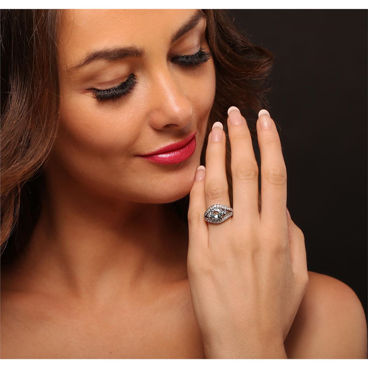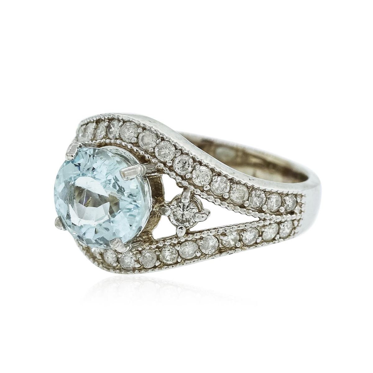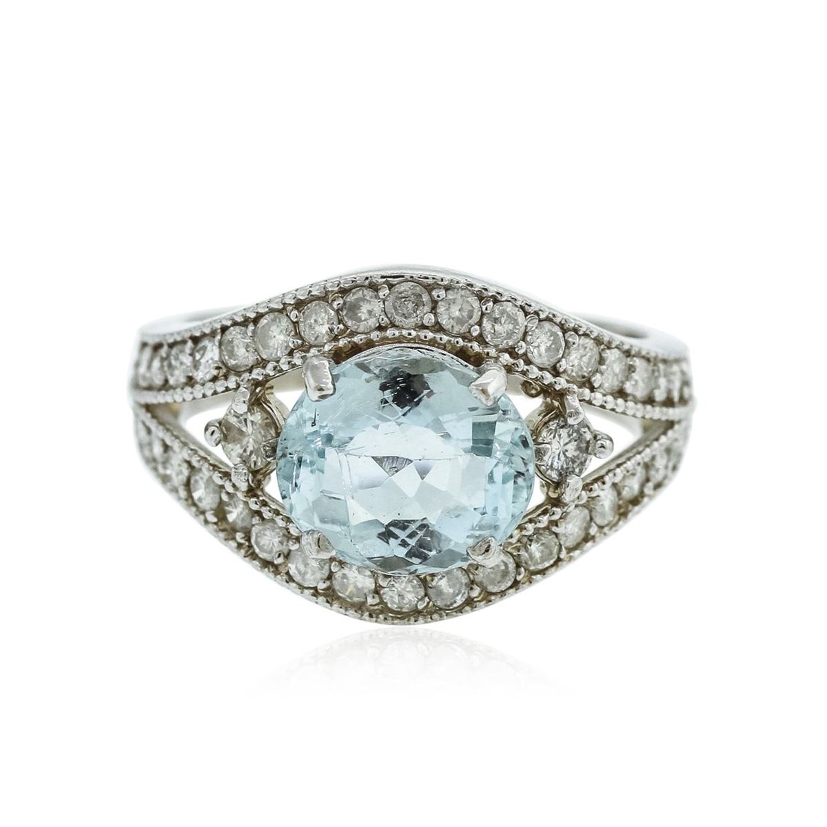 One electronically tested 14KT white gold ladies cast aquamarine and diamond ring. Condition is new, good workmanship. The featured aquamarine is framed by mirroring ribbons of diamonds, completed by a three millimeter wide band. Bright polish finish with milgrain detailing throughout. Identified with markings of "K14". Containing: One prong set oval mixed cut natural aquamarine, measuring 9.25 x 8.00 x 4.90mm, 8%. bulge factor, approximate weight of 2.14ct., clarity is eye clean, type I, medium light, very slightly grayish, blue color, (GIA B 4/3), cut is good. Transmitting light with no distortion, transparent. Refractive index testing results of 1.56 to 1.57. This is a conclusive result for Aquamarine (Beryl). Graded in the setting. Two prong set round brilliant cut diamonds, measuring 2.50 - 2.40 x 1.47mm (depth est.) approximate. Total Weight of 2 Stones = 0.13ct. Graded in the setting. Clarity: I-1 to I-2. Color: J - K Thirty-Eight bead set round brilliant cut diamonds, measuring 1.70 - 1.50 x 0.96mm (depth est.) approximate. Total Weight of 38 Stones = 0.66ct. Faint secondary color throughout. Graded in the setting. Clarity: I-1 to I-2. Color: K - M. Total Weight of Colored Stones 2.14ct. Total Weight of Diamonds 0.79ct. Total Weight of Ring 5.80 grams. AIG Appraised at $3,835.00.