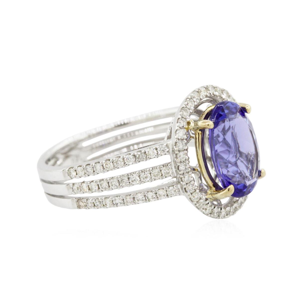 One electronically tested 14KT white gold ladies cast tanzanite and diamond ring with a bright polish finish. Condition is new, good workmanship. The featured tanzanite is set within a diamond bezel supported by diamond set three-way split shoulders, completed by a four millimeter wide band. Identified with markings of "14K". Containing: One prong set oval mixed cut natural tanzanite, measuring 9.85 x 7.15 x 4.10mm, 10%. bulge factor, approximate weight of 2.14ct., clarity is eye clean, type I, medium dark, very slightly grayish, bluish violet color, (GIA bV 6/3), cut is good. Transmitting light with no distortion, transparent. Graded in the setting. Tanzanite is a very rare gemstone that is only found in the country of Tanzania. Originally discovered in 1967. Tiffany & Company, named the stone Tanzanite. It is found in the Usumburu Mountains that border the Umba Valley of northern Tanzania. Tanzanite occurs in gray, brown, violet, blue, reddish-purple, & green. The gem is interesting because of its exceptional pleochroism. Rotated in different directions a tanzanite will exhibit multiple changes of color. Tanzanite has a low tolerance to ultrasonic cleaning, and should not be cleaned using this method. Ninety-Two prong set round brilliant cut diamonds, measuring 1.20 - 1.00 x 0.66mm (depth est.) approximate. Total Weight of 92 Stones = 0.53ct. Graded in the setting. Clarity: SI-1 to I-1. Color: G - I. Total Weight of Colored Stones 2.14ct. Total Weight of Diamonds 0.53ct. Total Weight of Ring 4.49grams. AIG Appraised at $7,730.00.