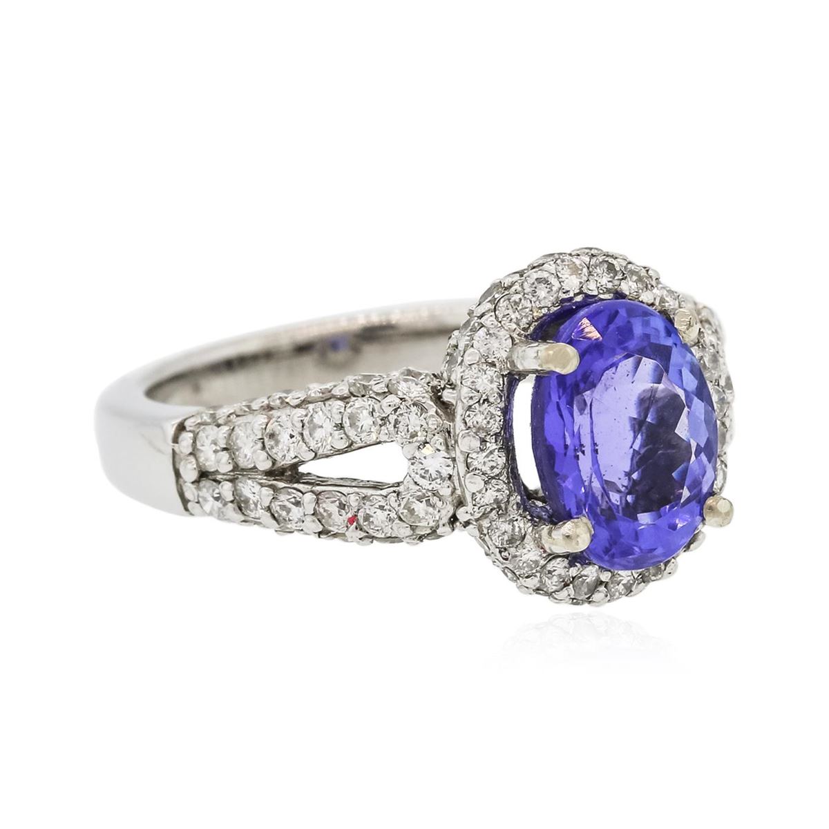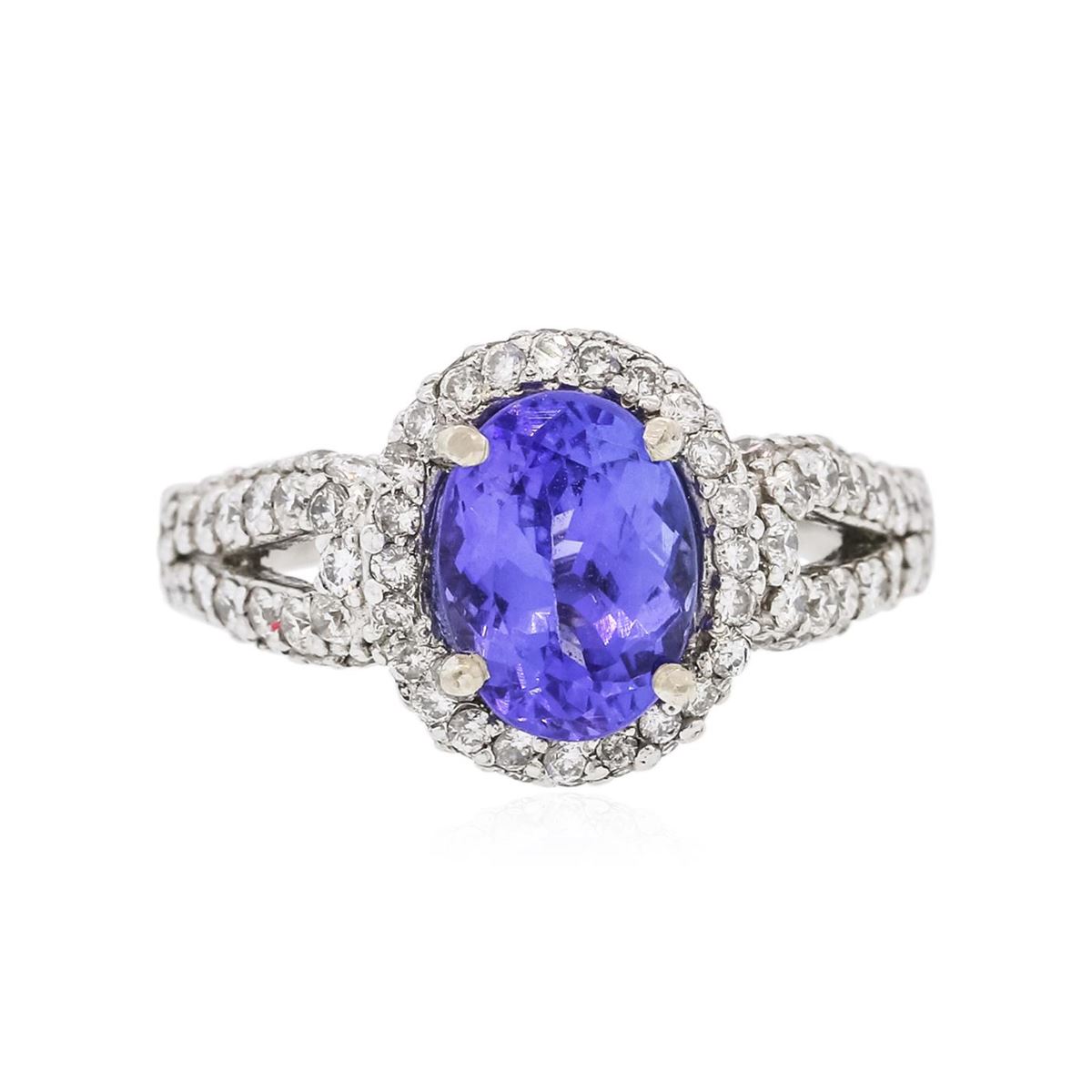One electronically tested 14KT white gold ladies combination cast & assembled ring with a bright polish finish. Condition is new. Identified with markings of "14K". Containing: One prong set oval modified brilliant cut natural tanzanite, measuring 9.20 x 7.30 x 4.70mm, approximate weight of 2.14ct., clarity is eye clean, type I, medium, very slightly grayish, bluish violet color, (GIA bV 5/3), cut is good. One Hundred Seventeen prong set round brilliant cut diamonds, measuring 1.50 - 1.30 x 0.84mm (depth est.) approximate total weight of 117 Stones = 1.17ct. Clarity: I-1 to I-2. Color: H - I, Cut is Good. Colored gemstones are presumed to have been subjected to commonly used enhancement processes. All diamonds and colored gemstones are graded in the mounting, unless otherwise stated. Total Weight of Colored Stones 2.14ct. Total Weight of Diamonds 1.17ct. Total Weight of Ring 6.00 grams. GGL Appraised at $6,665.00.