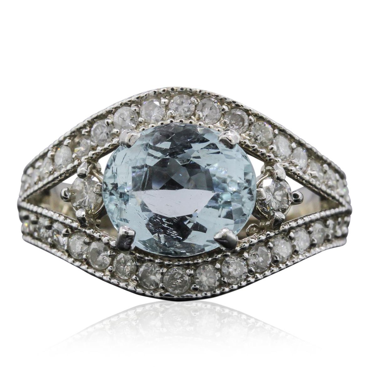 One electronically tested 14KT white gold ladies cast aquamarine and diamond ring. Condition is new, good workmanship. The featured aquamarine is framed by mirroring ribbons of diamonds, completed by a three millimeter wide band. Bright polish finish with milgrain detailing throughout. Identified with markings of "K14". Containing: One prong set oval mixed cut natural aquamarine, measuring 9.25 x 8.00 x 4.90mm, 8%. bulge factor, approximate weight of 2.14ct., clarity is eye clean, type I, medium light, very slightly grayish, blue color, (GIA B 4/3), cut is good. Transmitting light with no distortion, transparent. Refractive index testing results of 1.56 to 1.57. This is a conclusive result for Aquamarine (Beryl). Graded in the setting. Two prong set round brilliant cut diamonds, measuring 2.50 - 2.40 x 1.47mm (depth est.) approximate. Total Weight of 2 Stones = 0.13ct. Graded in the setting. Clarity: I-1 to I-2. Color: J - K Thirty-Eight bead set round brilliant cut diamonds, measuring 1.70 - 1.50 x 0.96mm (depth est.) approximate. Total Weight of 38 Stones = 0.66ct. Faint secondary color throughout. Graded in the setting. Clarity: I-1 to I-2. Color: K - M. Total Weight of Colored Stones 2.14ct. Total Weight of Diamonds 0.79ct. Total Weight of Ring 5.80 grams. AIG Appraised at $3,835.00.