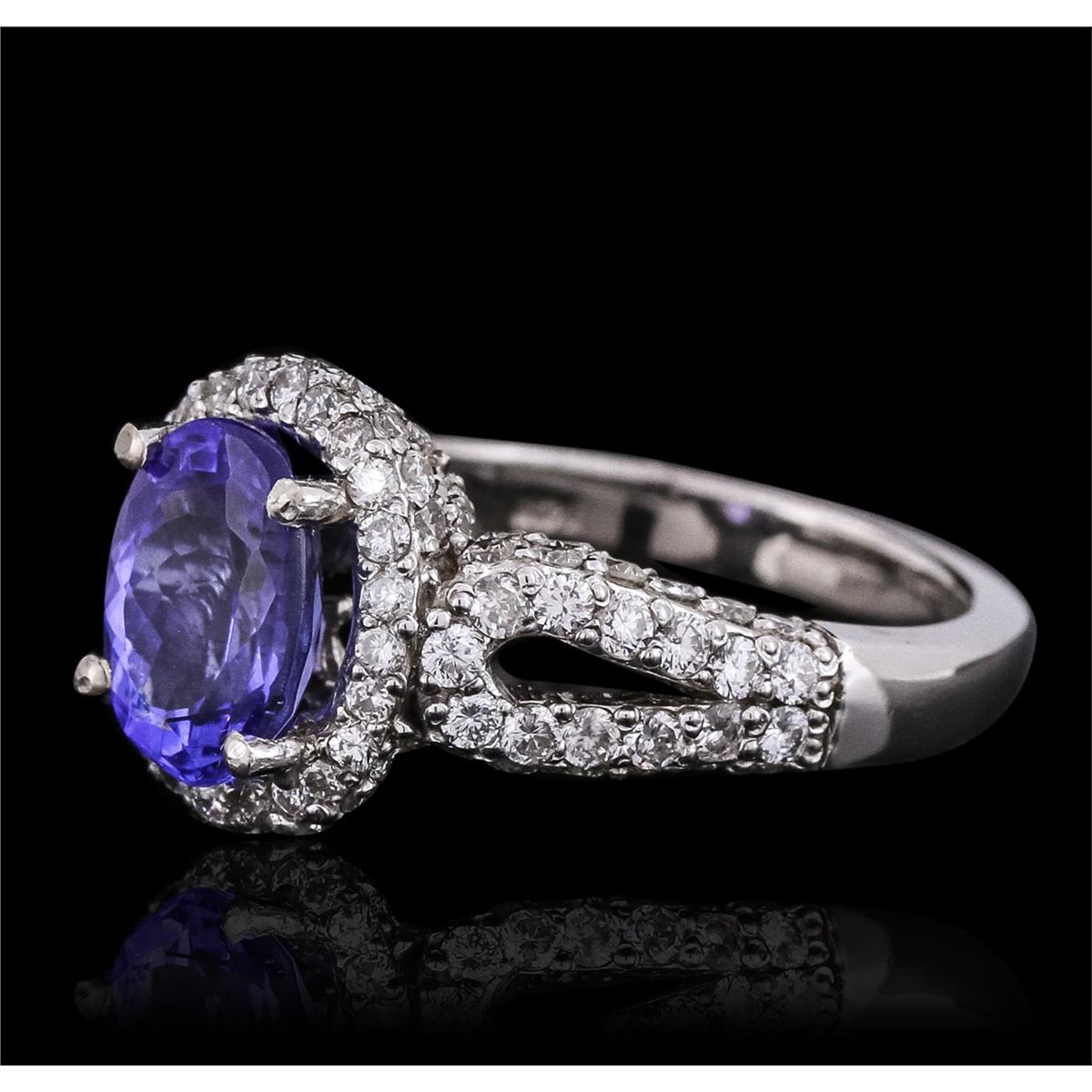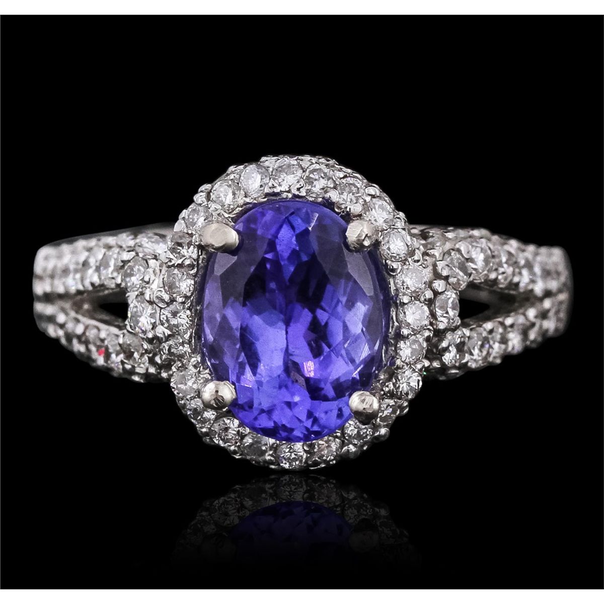 One electronically tested 14KT white gold ladies combination cast & assembled ring with a bright polish finish. Condition is new. Identified with markings of "14K". Containing: One prong set oval modified brilliant cut natural tanzanite, measuring 9.20 x 7.30 x 4.70mm, approximate weight of 2.14ct., clarity is eye clean, type I, medium, very slightly grayish, bluish violet color, (GIA bV 5/3), cut is good. One Hundred Seventeen prong set round brilliant cut diamonds, measuring 1.50 - 1.30 x 0.84mm (depth est.) approximate total weight of 117 Stones = 1.17ct. Clarity: I-1 to I-2. Color: H - I, Cut is Good. Colored gemstones are presumed to have been subjected to commonly used enhancement processes. All diamonds and colored gemstones are graded in the mounting, unless otherwise stated. Total Weight of Colored Stones 2.14ct. Total Weight of Diamonds 1.17ct. Total Weight of Ring 6.00 grams. GGL Appraised at $6,665.00.