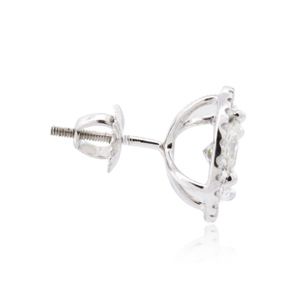 One pair electronically tested 14KT white gold ladies cast stud earrings with screw backs with a bright polish finish. Identified with markings of "14K". Condition is new. Containing: Eight prong set marquise shaped cut diamonds, measuring 6.00 x 3.00 x 1.89mm (depth est.) approximate total weight of 8 Stones = 1.58ct. Clarity: SI-1 to SI-2. Color: I - J, Cut is Good. Two prong set princess cut diamonds, measuring 3.00 x 3.00 x 2.25mm (depth est.) approximate total weight of 2 Stones = 0.33ct. Clarity: SI-1. Color: J - K, Cut is Good. Forty-Eight prong set round brilliant cut diamonds, measuring 1.10 - 1.10 x 0.66mm (depth est.) approximate total weight of 48 Stones = 0.23ct. Clarity: SI-2. Color: I - J, Cut is Good. All diamonds are graded in the mounting, unless otherwise stated. Total Weight of Diamonds 2.14ct. Total Weight of Earrings 3.30 grams. GGL Appraised at $6,780.00.