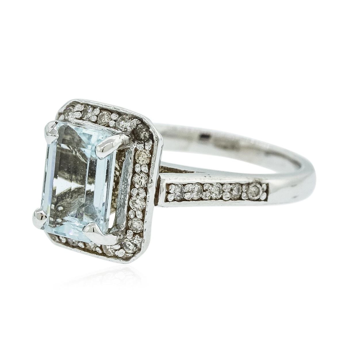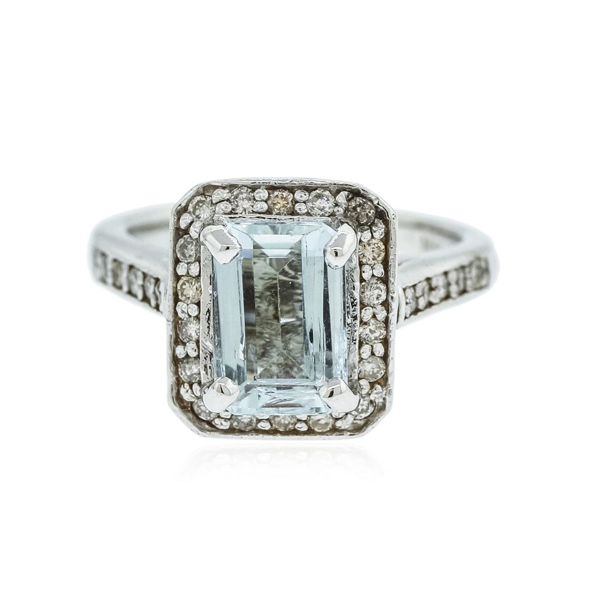 One electronically tested 14KT white gold ladies cast aquamarine and diamond ring with a bright polish finish. Condition is new, good workmanship. The featured aquamarine is set within diamond lattice gallery, supported by diamond set shoulders and completed by a two millimeter wide band. Identified with markings of "14K". Containing: One prong set rectangular step cut natural aquamarine, measuring 9.30 x 6.35 x 4.13mm, 8%. bulge factor, approximate weight of 2.15ct., clarity is eye clean, type I, medium, very slightly grayish, very slightly greenish blue color, (GIA vslgB 5/3), cut is good. Transmitting light with no distortion, transparent. Refractive index testing results of 1.56 to 1.57. This is a conclusive result for Aquamarine (Beryl). Graded in the setting. Thirty-Eight prong set round brilliant cut diamonds, measuring 1.50 - 1.40 x 0.87mm (depth est.) approximate. Total Weight of 38 Stones = 0.51ct. Graded in the setting. Clarity: SI-2 to I-1. Color: H - J. Total Weight of Colored Stones 2.15ct. Total Weight of Diamonds 0.51ct. Total Weight of Ring 6.40 grams. AIG Appraised at $3,775.00.