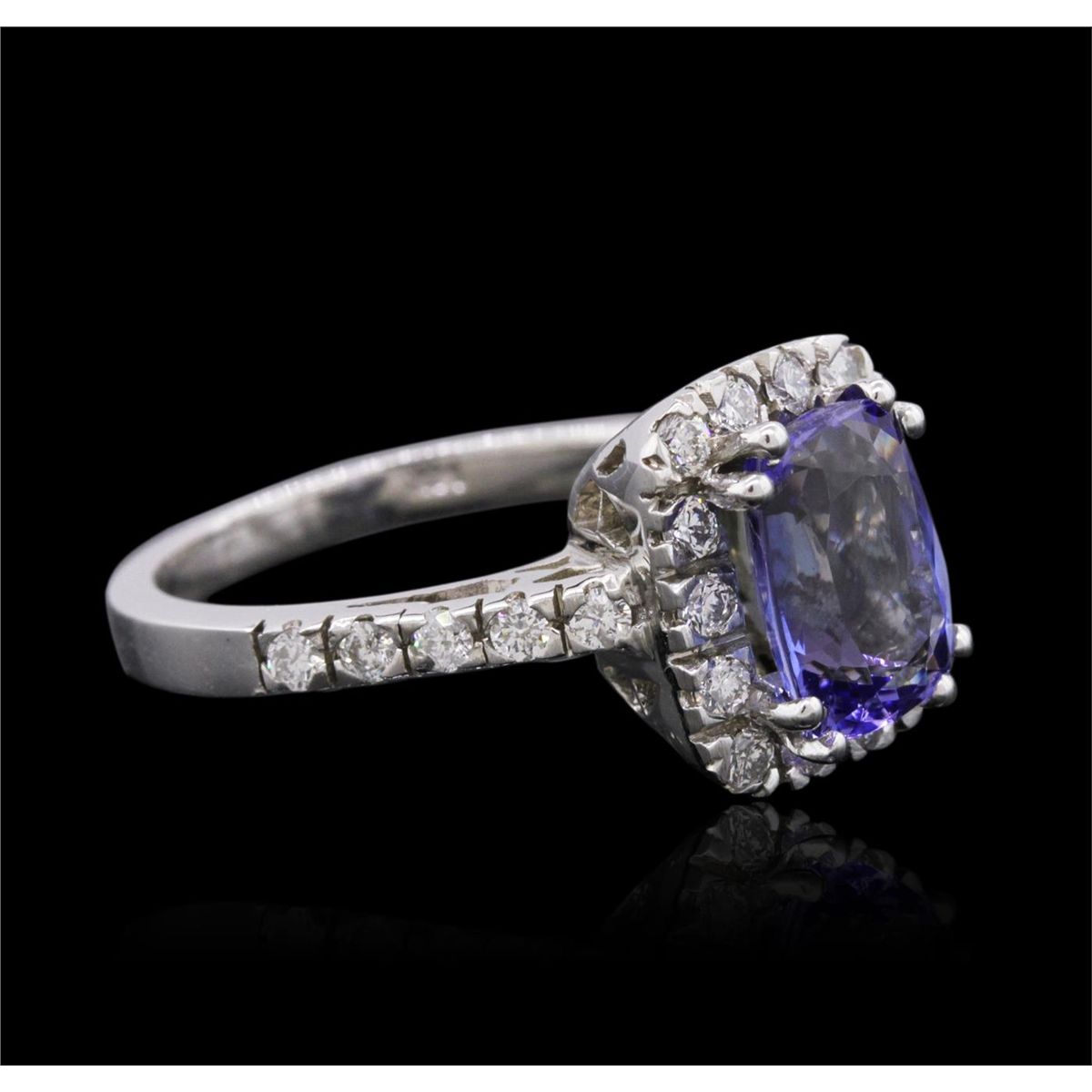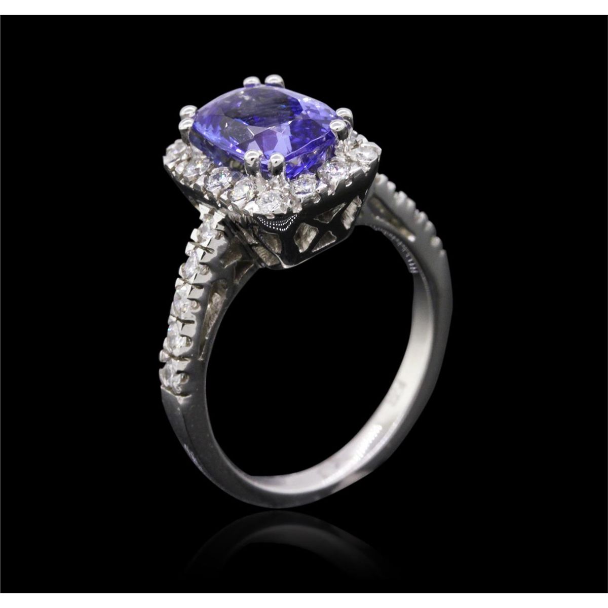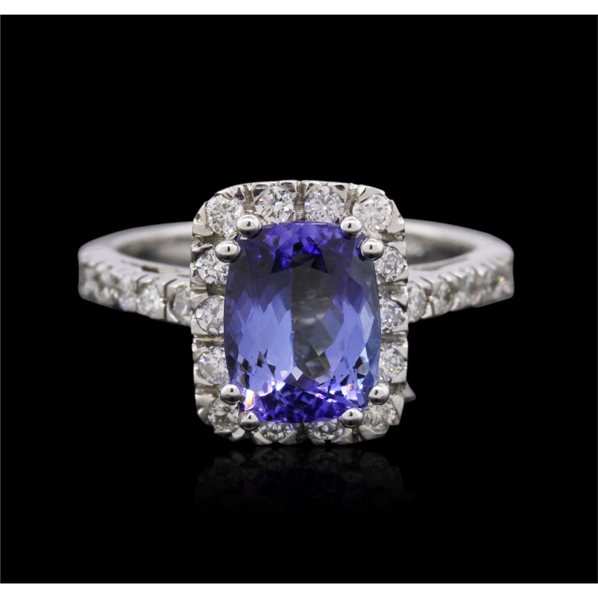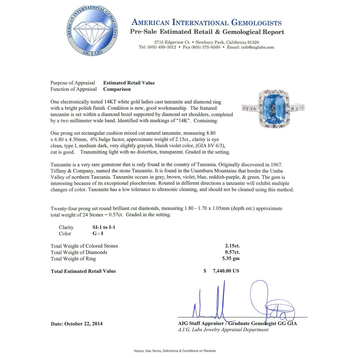 One electronically tested 14KT white gold ladies cast tanzanite and diamond ring with a bright polish finish. The featured tanzanite is set within a diamond bezel supported by diamond set shoulders, completed by a two millimeter wide band. Identified with markings of 14K. Condition is new, good workmanship. Containing: One prong set rectangular cushion mixed cut natural tanzanite, measuring 8.80 x 6.80 x 4.30mm, 6% bulge factor, approximate weight of 2.15ct., clarity is eye clean, type I, medium dark, very slightly grayish, bluish violet color, (GIA bV 6/3), cut is good. Transmitting light with no distortion, transparent. Graded in the setting. Tanzanite is a very rare gemstone that is only found in the country of Tanzania. Originally discovered in 1967. Tiffany & Company, named the stone Tanzanite. It is found in the Usumburu Mountains that border the Umba Valley of northern Tanzania. Tanzanite occurs in gray, brown, violet, blue, reddish-purple, & green. The gem is interesting because of its exceptional pleochroism. Rotated in different directions a tanzanite will exhibit multiple changes of color. Tanzanite has a low tolerance to ultrasonic cleaning, and should not be cleaned using this method. Twenty-Four prong set round brilliant cut diamonds, measuring 1.80 - 1.70 x 1.05mm (depth est.) approximate total weight of 24 Stones = 0.57ct. Graded in the setting. Clarity: SI-1 to I-1. Color: G - I. Total Weight of Colored Stones 2.15ct. Total Weight of Diamonds 0.57ct. Total Weight of Ring 5.35 grams. AIG Appraised at $7,440.00.