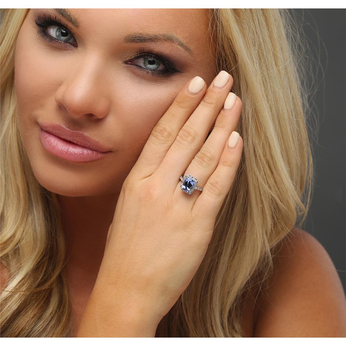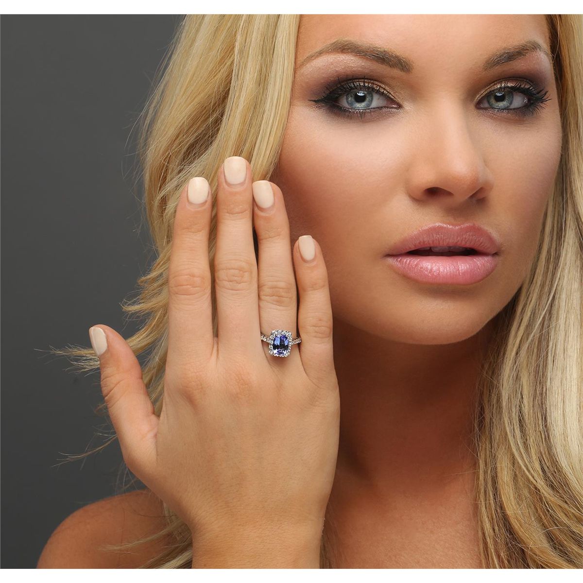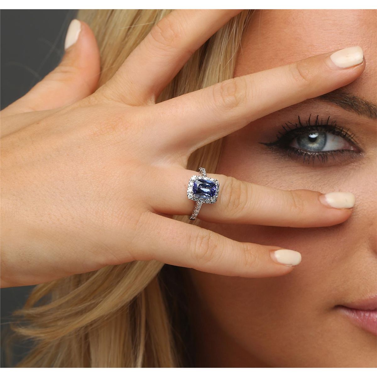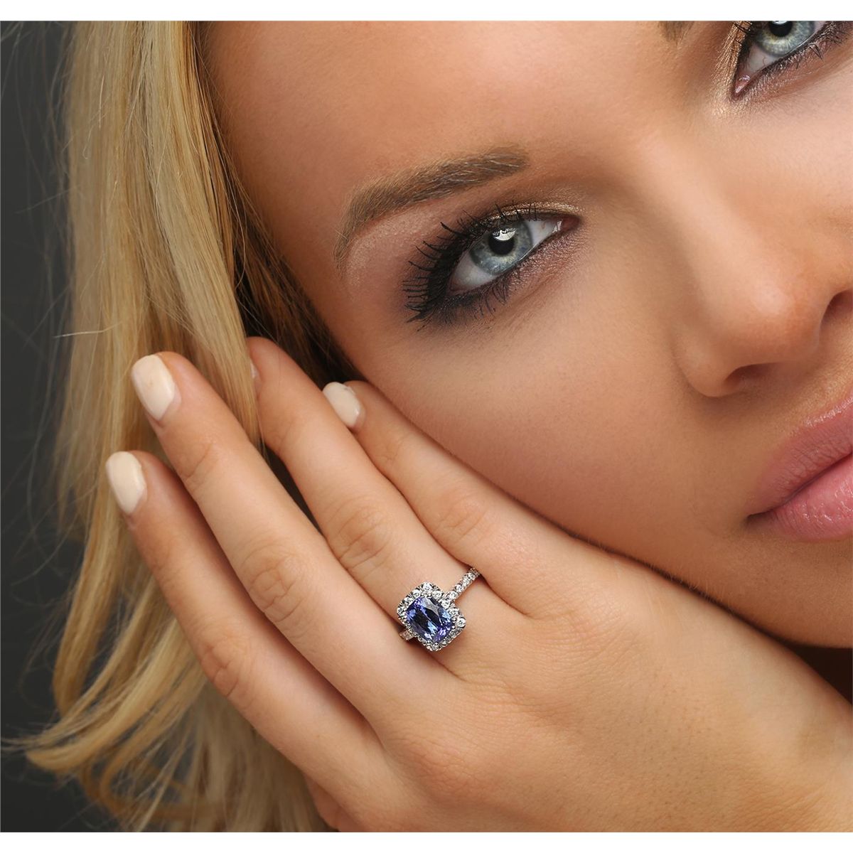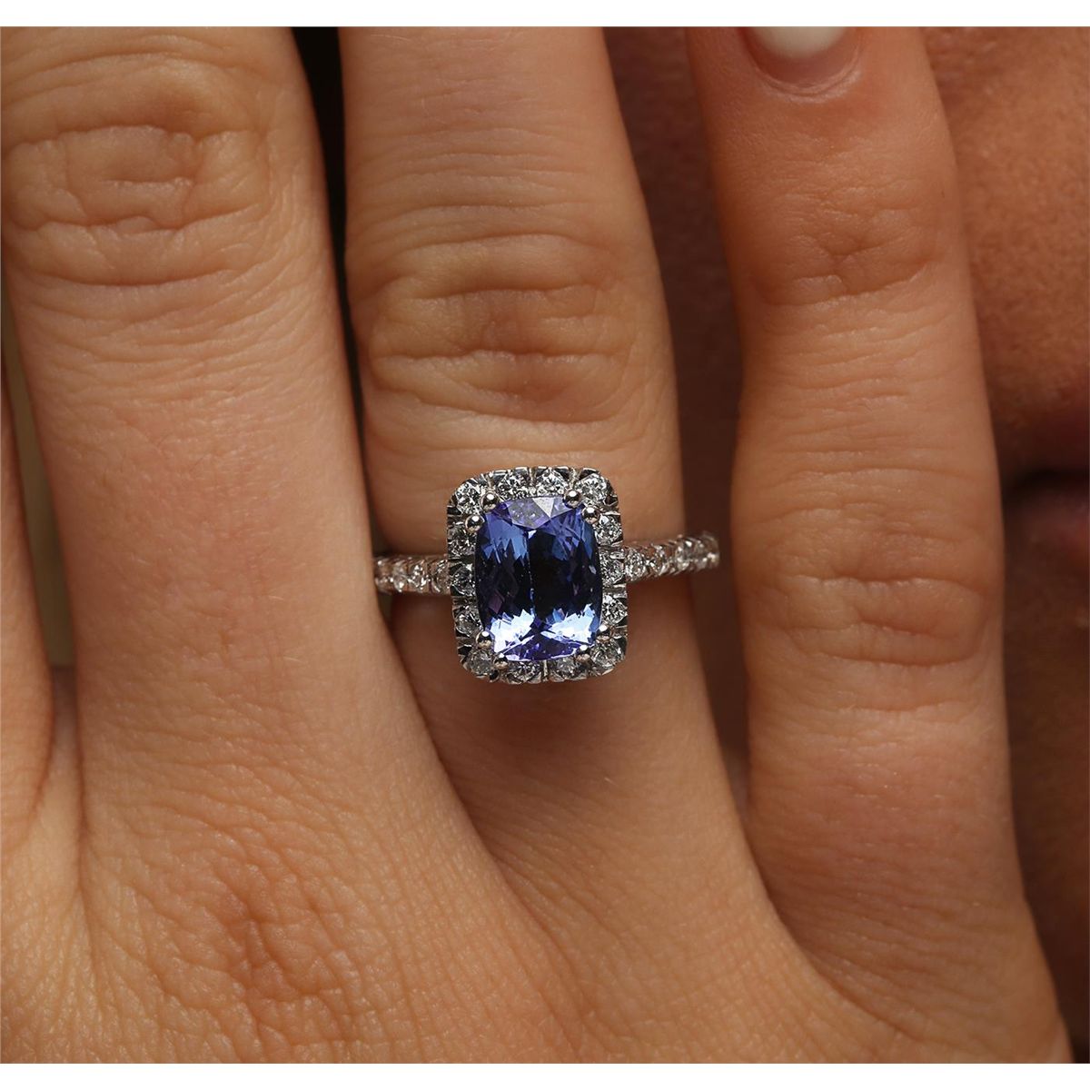 One electronically tested 14KT white gold ladies cast tanzanite and diamond ring with a bright polish finish. The featured tanzanite is set within a diamond bezel supported by diamond set shoulders, completed by a two millimeter wide band. Identified with markings of 14K. Condition is new, good workmanship. Containing: One prong set rectangular cushion mixed cut natural tanzanite, measuring 8.80 x 6.80 x 4.30mm, 6% bulge factor, approximate weight of 2.15ct., clarity is eye clean, type I, medium dark, very slightly grayish, bluish violet color, (GIA bV 6/3), cut is good. Transmitting light with no distortion, transparent. Graded in the setting. Tanzanite is a very rare gemstone that is only found in the country of Tanzania. Originally discovered in 1967. Tiffany & Company, named the stone Tanzanite. It is found in the Usumburu Mountains that border the Umba Valley of northern Tanzania. Tanzanite occurs in gray, brown, violet, blue, reddish-purple, & green. The gem is interesting because of its exceptional pleochroism. Rotated in different directions a tanzanite will exhibit multiple changes of color. Tanzanite has a low tolerance to ultrasonic cleaning, and should not be cleaned using this method. Twenty-Four prong set round brilliant cut diamonds, measuring 1.80 - 1.70 x 1.05mm (depth est.) approximate total weight of 24 Stones = 0.57ct. Graded in the setting. Clarity: SI-1 to I-1. Color: G - I. Total Weight of Colored Stones 2.15ct. Total Weight of Diamonds 0.57ct. Total Weight of Ring 5.35 grams. AIG Appraised at $7,440.00.