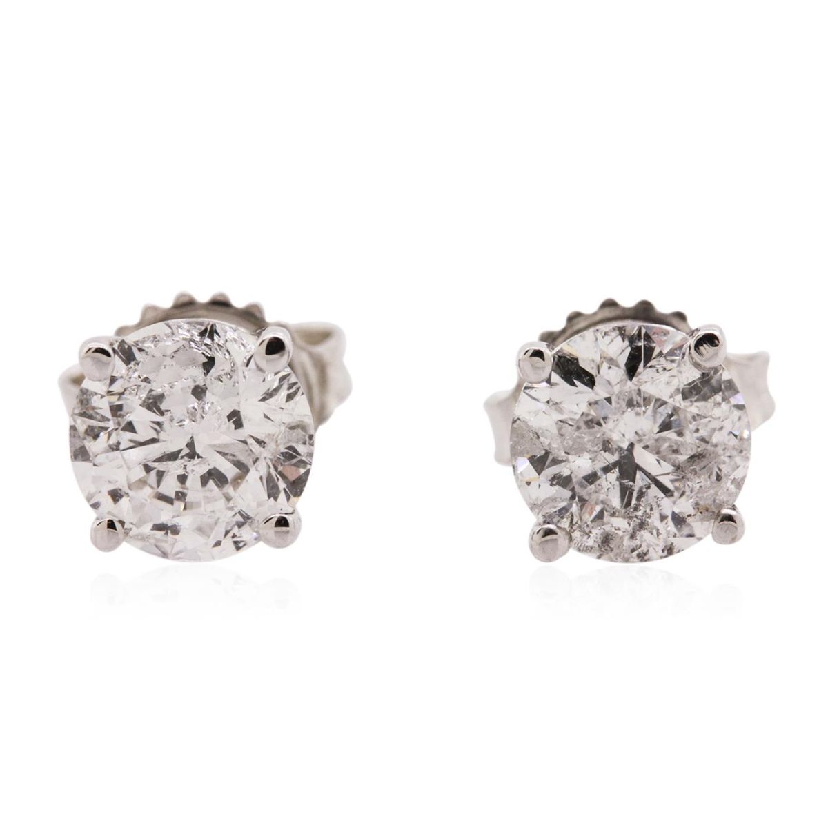 One pair electronically tested 14KT white gold cast & assembled diamond solitaire earrings with standard backs. Bright polish finish. Condition is new, good workmanship. Containing: One prong set round brilliant cut diamond, measuring 6.25 - 6.20 x 3.95mm (depth est.), 4.00.%. GTCF approximate weight of 1.07ct. Graded in the setting. Clarity: I-1. Color: I. Depth 63.4%. Table 57.8%. One prong set round brilliant cut diamond, measuring 6.18 - 6.15 x 4.00mm (depth est.), 6.00.%. GTCF approximate weight of 1.08ct with a faint blue fluorescence. Graded in the setting. Clarity: I-1. Color:  64.8%. Table 56.7%. Total Weight of Diamonds 2.15ct. Total Weight of Earrings 1.61 grams. AIG Appraised at $24,435.00.