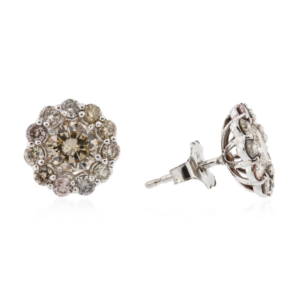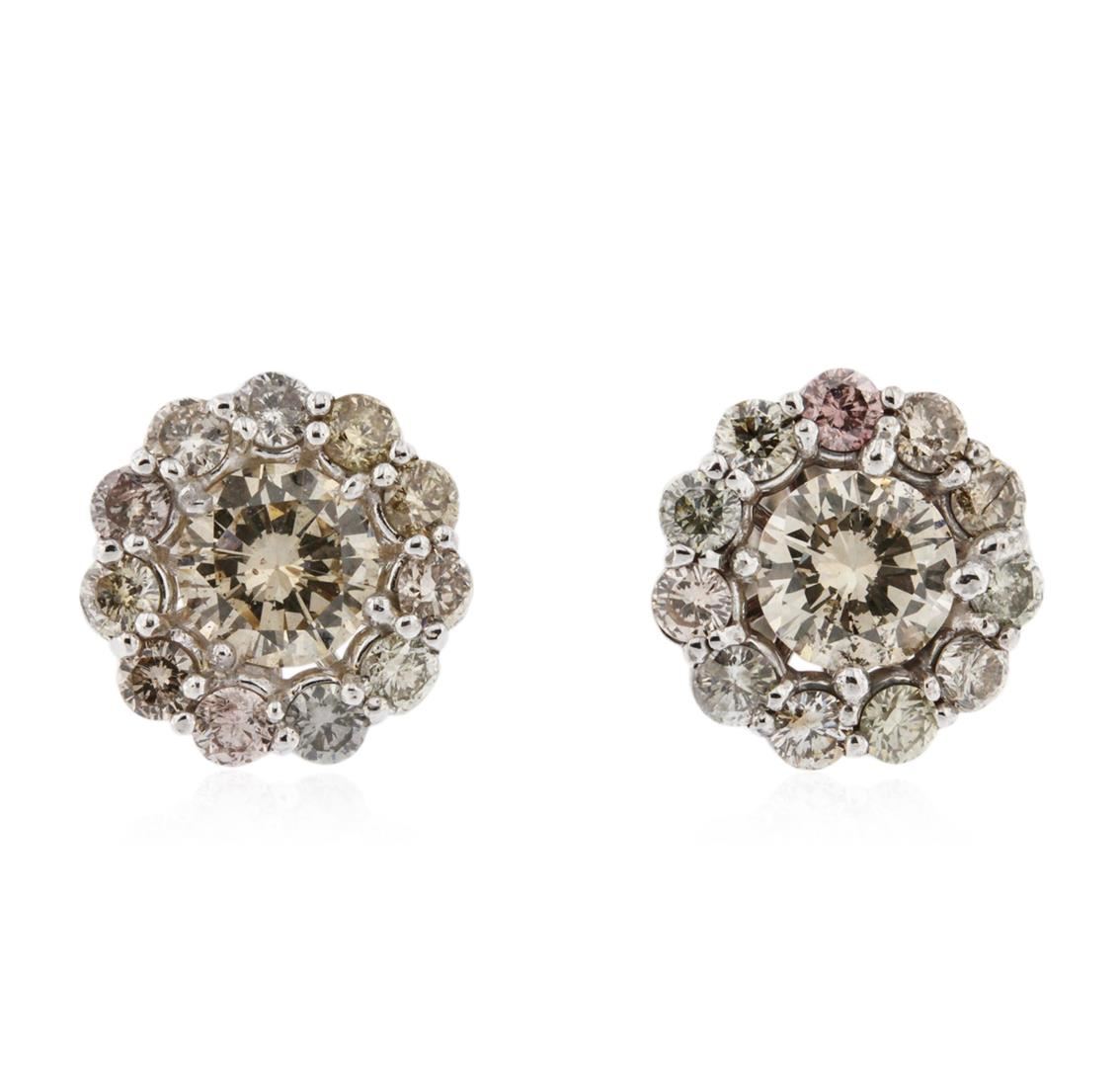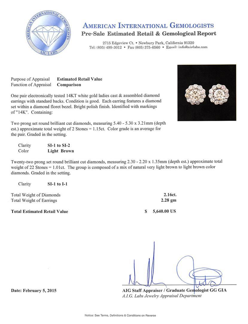 One pair electronically tested 14KT white gold ladies cast & assembled diamond earrings with standard backs. Each earring features a diamond set within a diamond floret bezel. Bright polish finish. Identified with markings of "14K". Condition is good. Containing: Two prong set round brilliant cut diamonds, measuring 5.40 - 5.30 x 3.21mm (depth est.) approximate total weight of 2 Stones = 1.15ct. Color grade is an average for the pair. Graded in the setting. Clarity: SI-1 to SI-2 Twenty-Two prong set round brilliant cut diamonds, measuring 2.30 - 2.20 x 1.35mm (depth est.) approximate total weight of 22 Stones = 1.01ct. The group is composed of a mix of natural very light brown to light brown color diamonds. Graded in the setting. Clarity: SI-1 to I-1. Total Weight of Diamonds 2.16ct. Total Weight of Earrings 2.28 grams. AIG Appraised at $5,640.00.