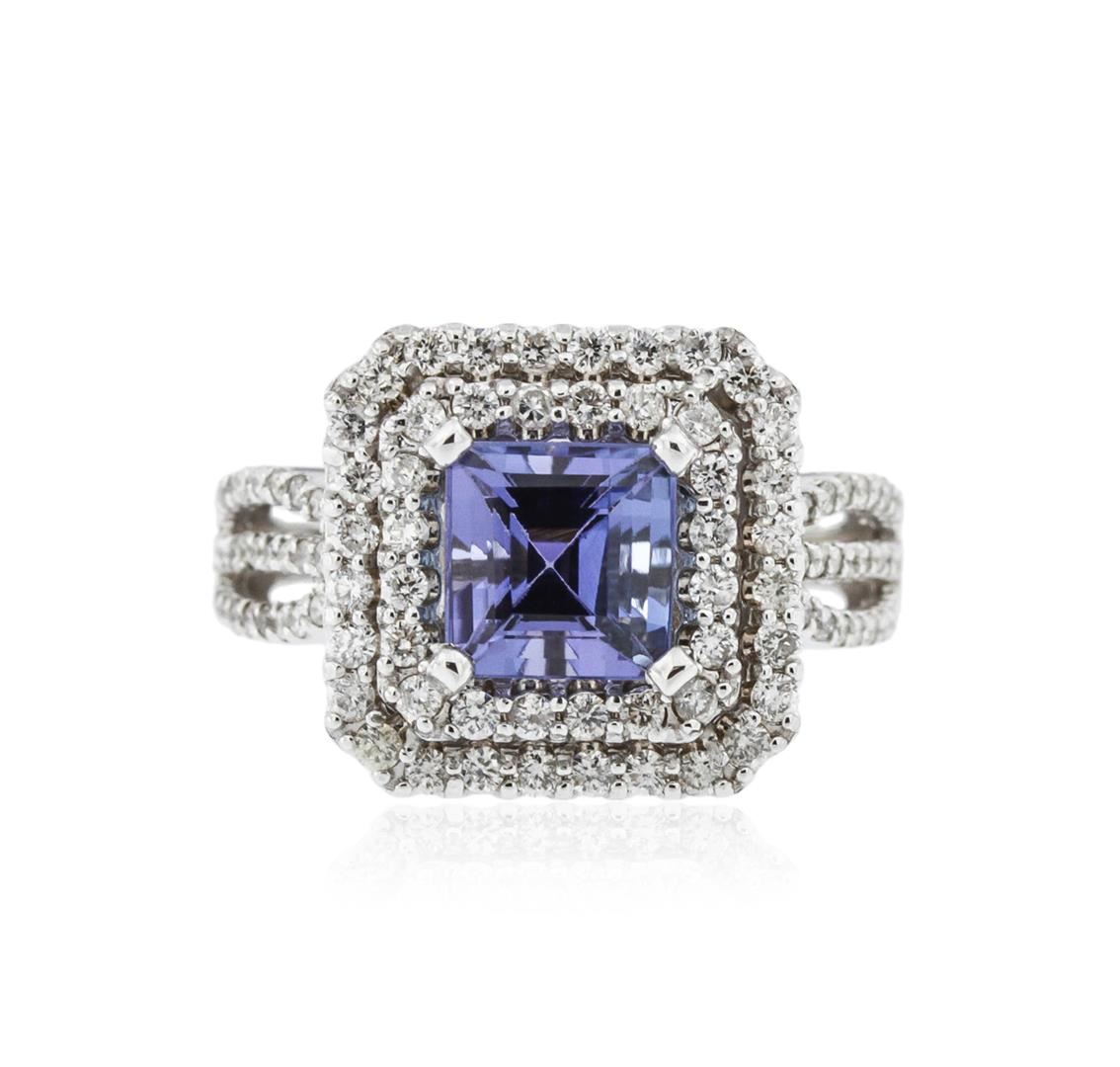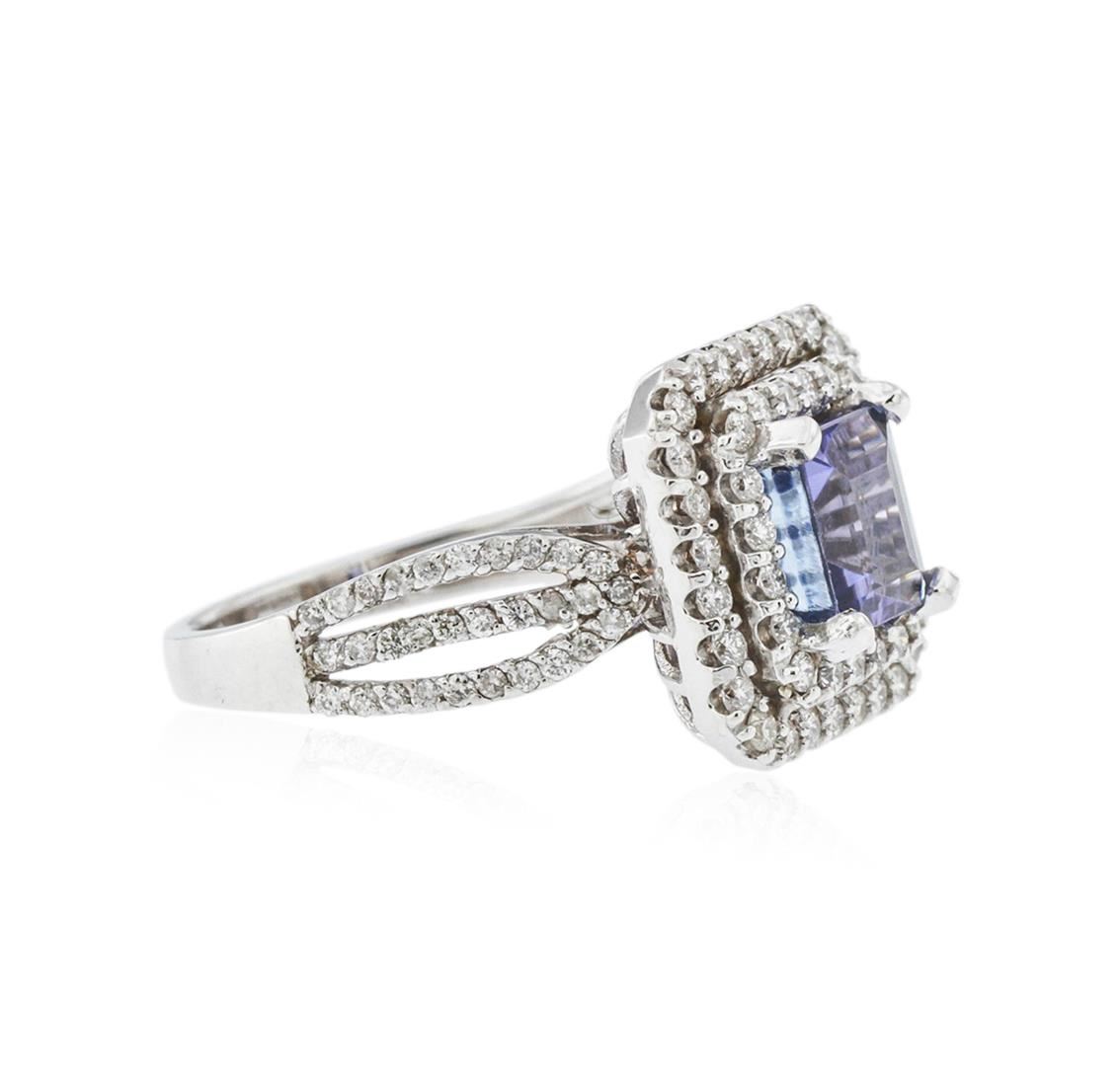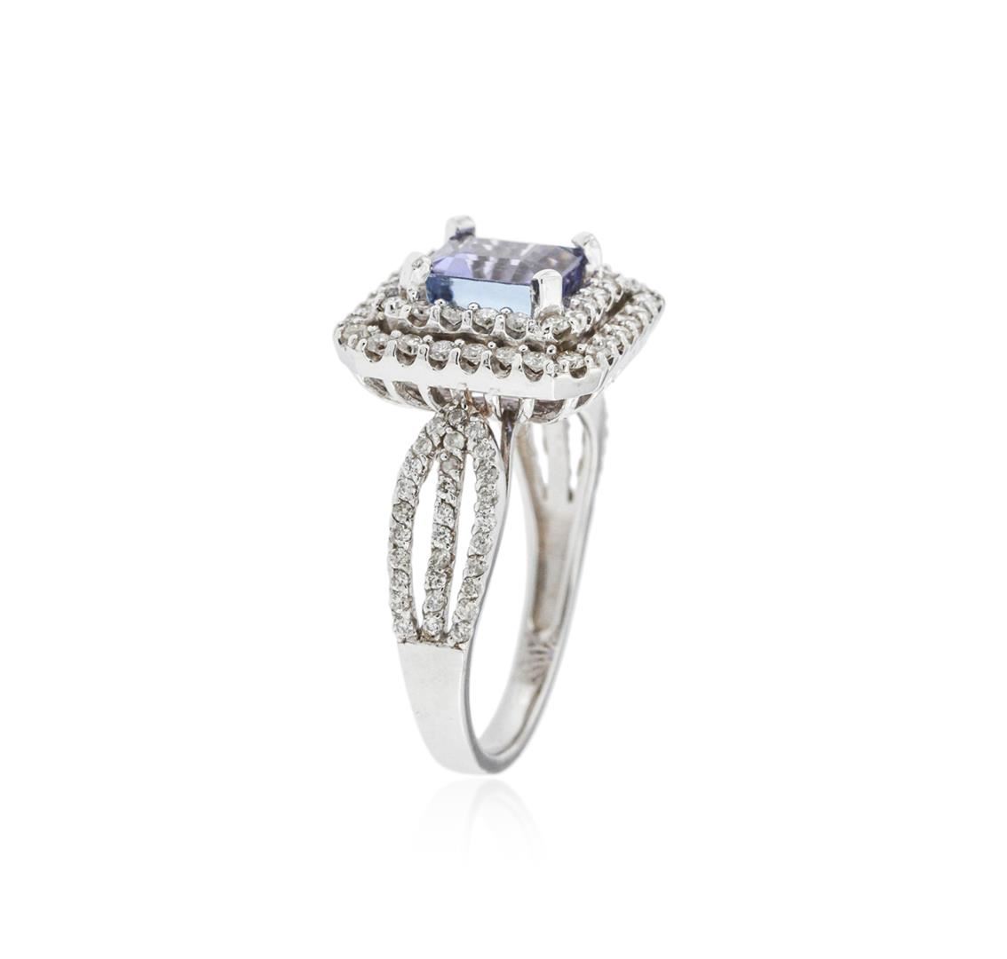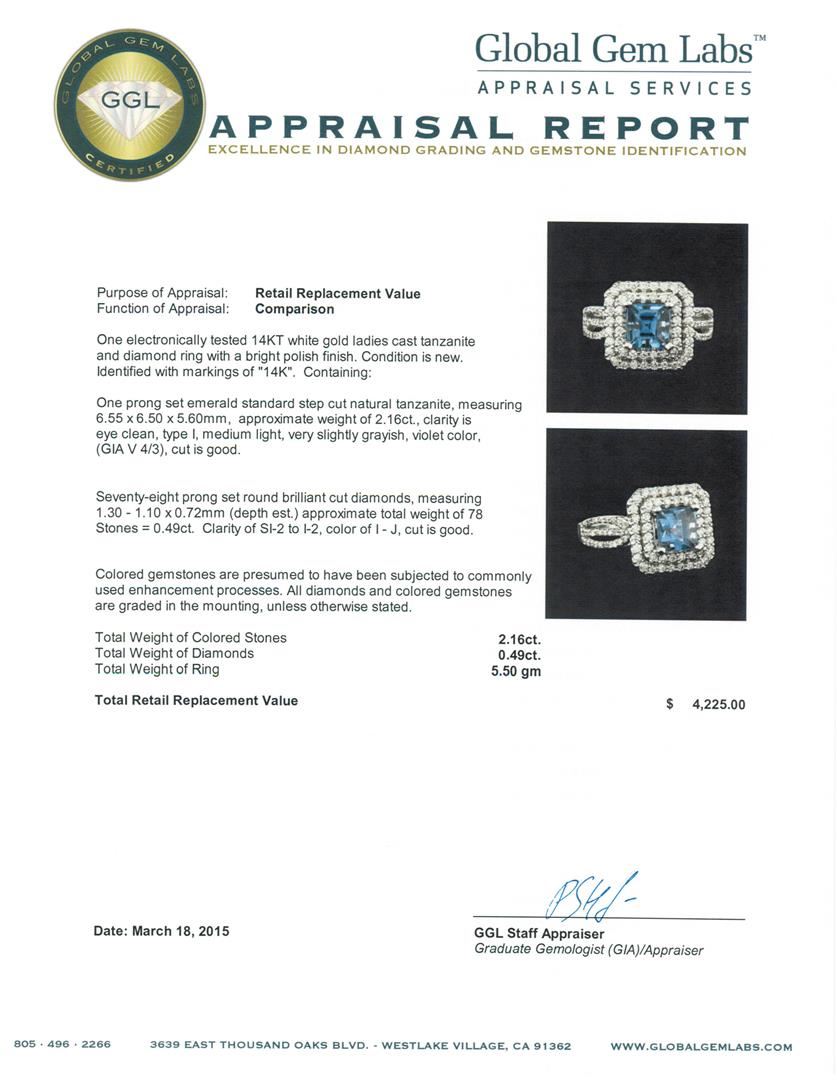 One electronically tested 14KT white gold ladies cast tanzanite and diamond ring with a bright polish finish. Identified with markings of "14K". Condition is new. Containing: One prong set emerald standard step cut natural tanzanite, measuring 6.55 x 6.50 x 5.60mm,  approximate weight of 2.16ct., clarity is eye clean, type I, medium light, very slightly grayish, violet color, (GIA V 4/3), cut is good. Seventy-Eight prong set round brilliant cut diamonds, measuring 1.30 - 1.10 x 0.72mm (depth est.) approximate total weight of 78 Stones = 0.49ct.  Clarity of SI-2 to I-2, Color of I - J, Cut is Good.  Colored gemstones are presumed to have been subjected to commonly used enhancement processes. All diamonds and colored gemstones are graded in the mounting, unless otherwise stated. Total Weight of Colored Stones 2.16ct. Total Weight of Diamonds 0.49ct. Total Weight of Ring 5.50 grams. GGL Appraised at $4,225.00.