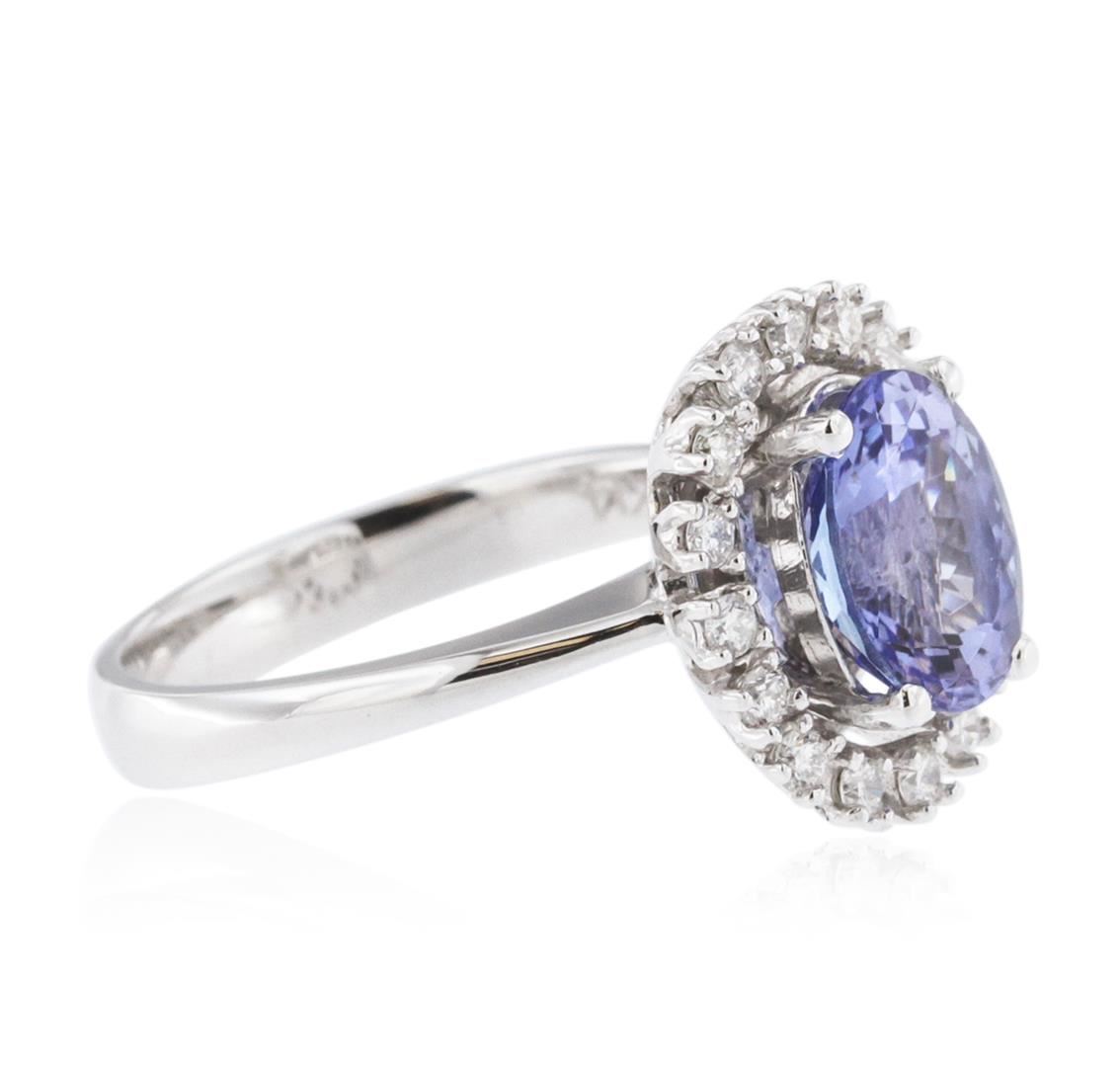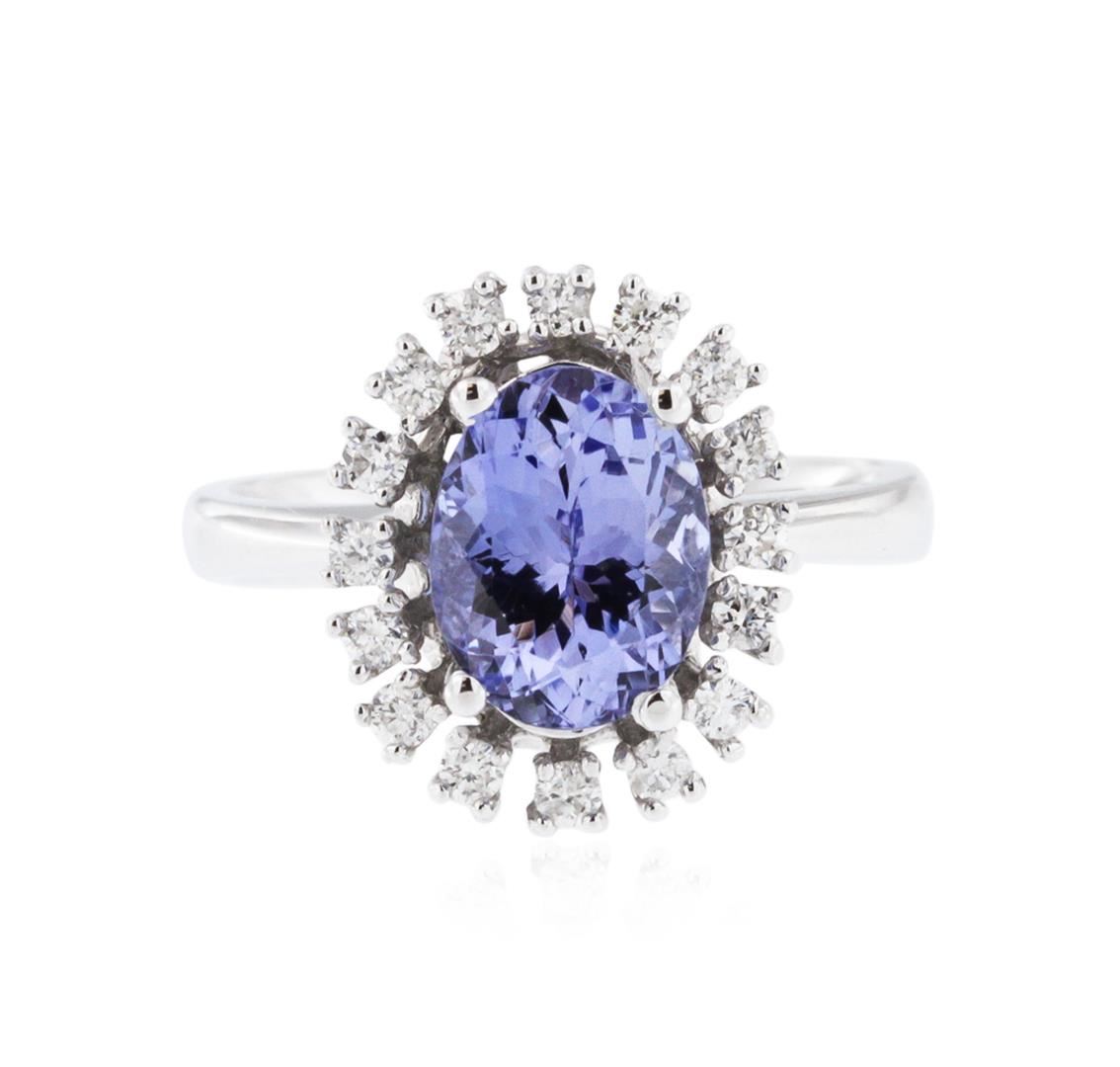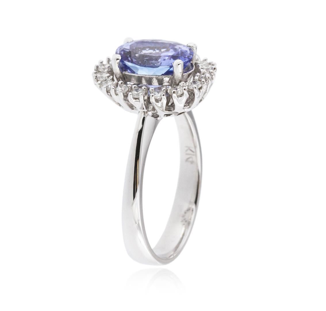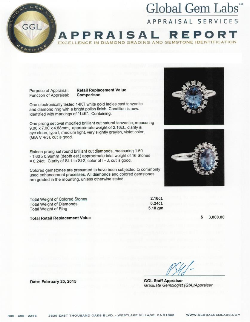 One electronically tested 14KT white gold ladies cast tanzanite and diamond ring with a bright polish finish. Identified with markings of "14K". Condition is new. Containing: One prong set oval modified brilliant cut natural tanzanite, measuring 9.00 x 7.00 x 4.88mm, approximate weight of 2.16ct., clarity is eye clean, type I, medium light, very slightly grayish, violet color, (GIA V 4/3), cut is good. Sixteen prong set round brilliant cut diamonds, measuring 1.60 - 1.60 x 0.96mm (depth est.) approximate total weight of 16 Stones = 0.24ct. Clarity: SI-1 to SI-2. Color: I - J, Cut is Good. Colored gemstones are presumed to have been subjected to commonly used enhancement processes. All diamonds and colored gemstones are graded in the mounting, unless otherwise stated. Total Weight of Colored Stones 2.16ct. Total Weight of Diamonds 0.24ct. Total Weight of Ring 5.10 grams. GGL Appraised at $3,000.00.