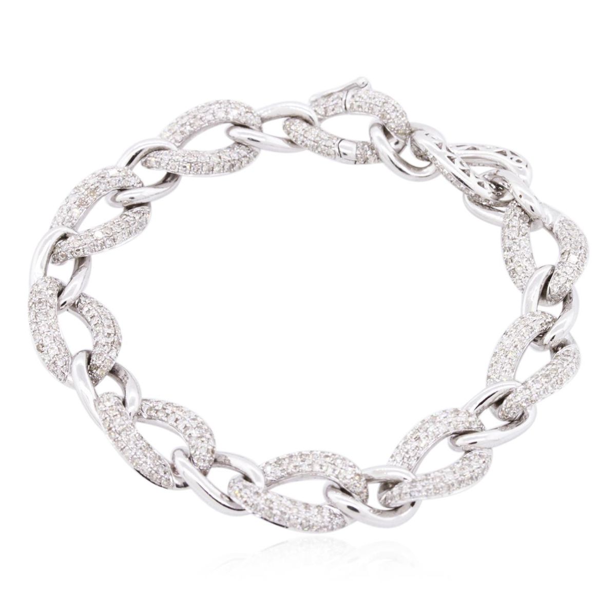 One electronically tested 14KT white gold ladies cast diamond bracelet with a hidden box clasp with safety closer with a bright polish finish. Measurements: 6.25" in length. Condition is new. Containing: Six Hundred prong set single cut diamonds, measuring 1.00 - 1.00 x 0.60mm (depth est.) approximate total weight of 600 Stones = 2.16ct. Clarity: SI-1 to SI-2. Color: H - I, Cut is Good. All diamonds are graded in the mounting, unless otherwise stated. Total Weight of Diamonds 2.16ct. Total Weight of Bracelet 28.00 grams. GGL Appraised at $12,290.00.