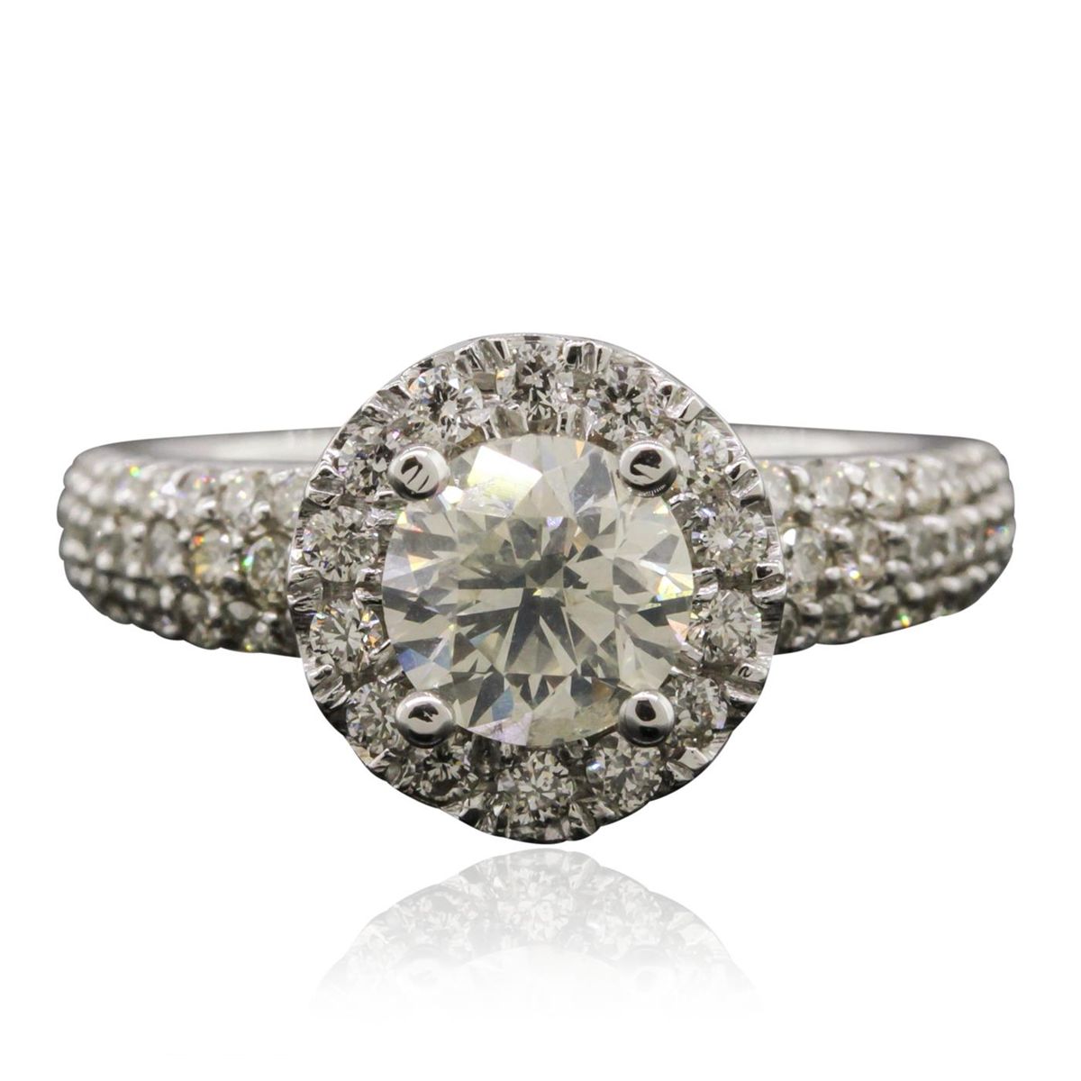One electronically tested 14KT white gold Ladies combination cast & assembled engagement ring with a bright polish finish. Condition is new. Identified with markings of "14K". Containing: One prong set round brilliant cut diamond, measuring 6.55 - 6.49 x 4.24mm (depth est.) approximate weight of 1.18ct. Clarity: I-1. Color: H, Cut is Good. Ninety-Four prong set round brilliant cut diamonds, measuring 1.40 - 1.40 x 0.84mm (depth est.) approximate. Total Weight of 94 Stones = 0.98ct. Clarity: SI-1 to SI-3. Color: G - H, Cut is Good. EGL USA GEM ID# US 911348413D. All diamonds are graded in the mounting, unless otherwise stated. Total Weight of Diamonds 2.16ct. Total Weight of Engagement Ring 5.10 grams. GGL Appraised at $22,075.00.